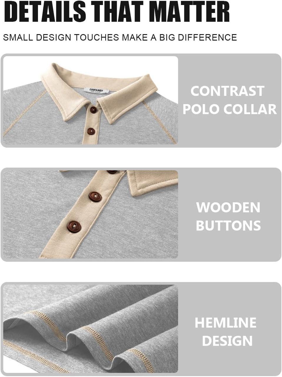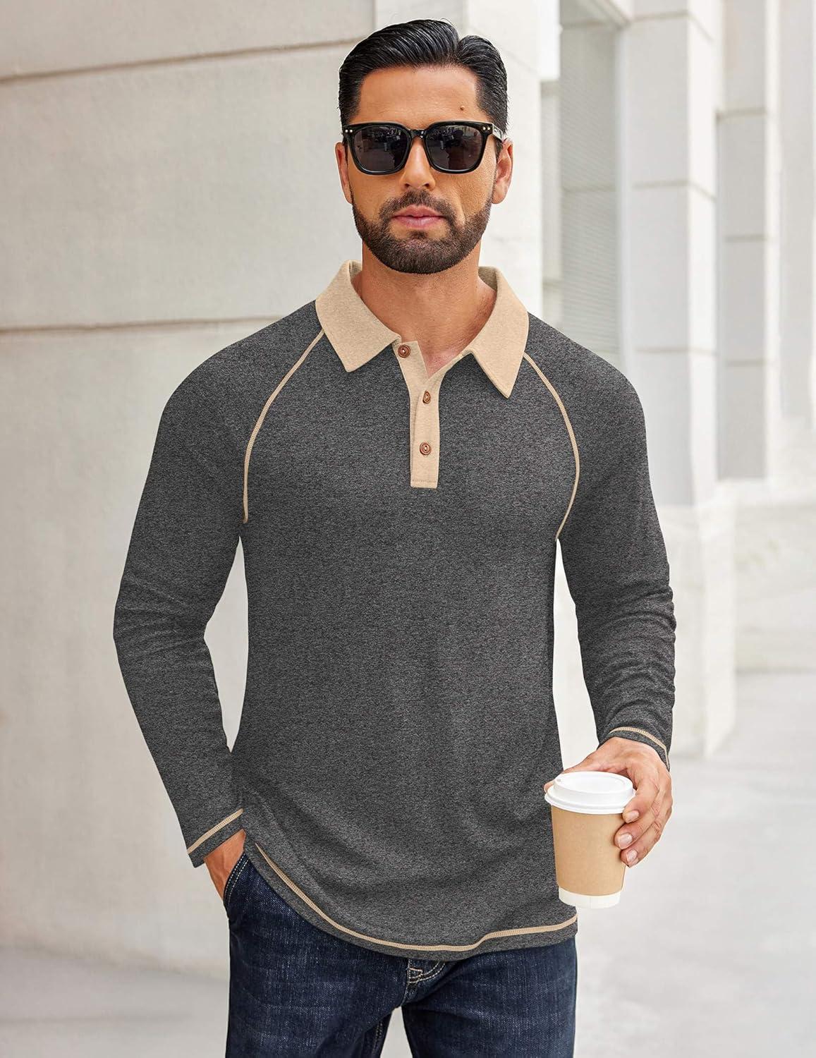 COOFANDY Mens Long Sleeve Polo Shirts Casual Button Collared Shirts Raglan Golf T Shirt(Dark Grey)