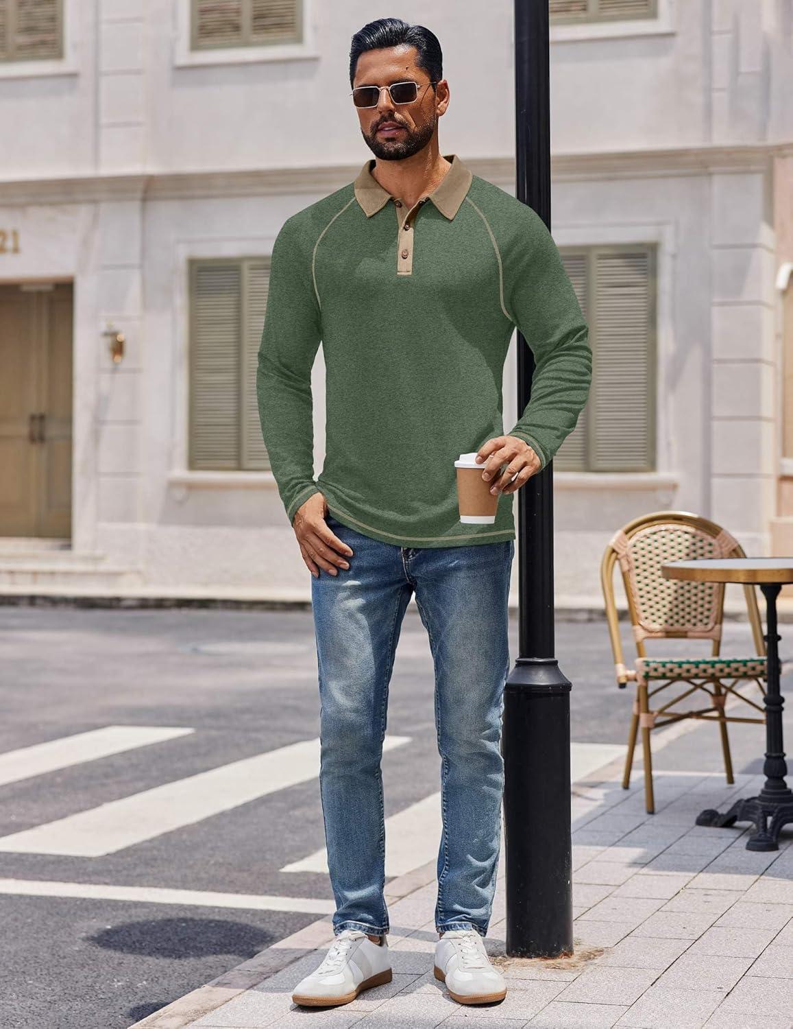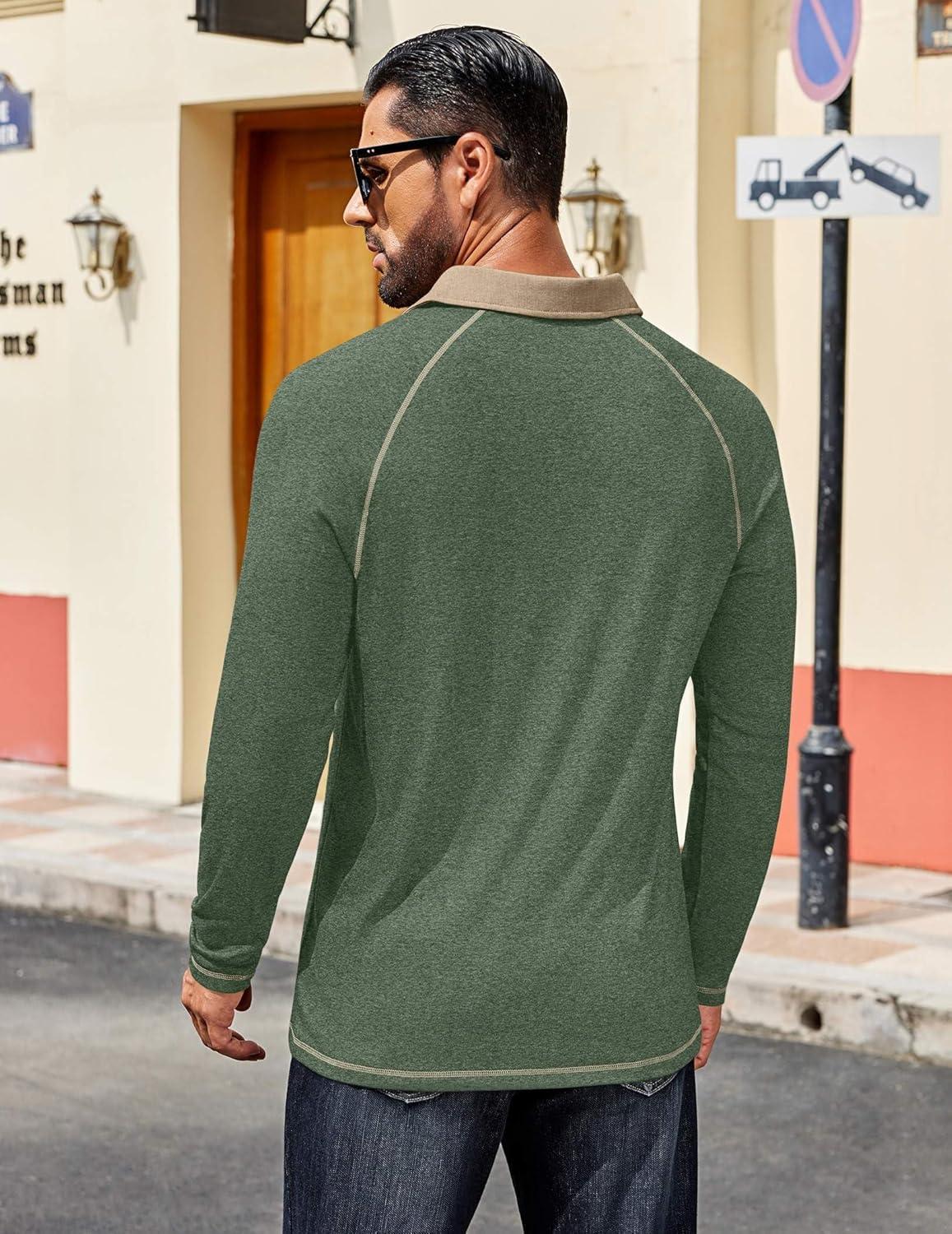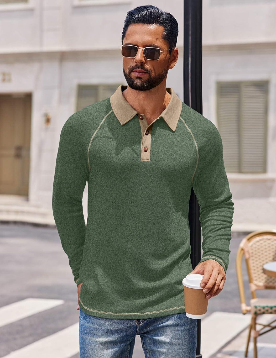 COOFANDY Mens Long Sleeve Polo Shirts Casual Button Collared Shirts Raglan Golf T Shirt(Green)