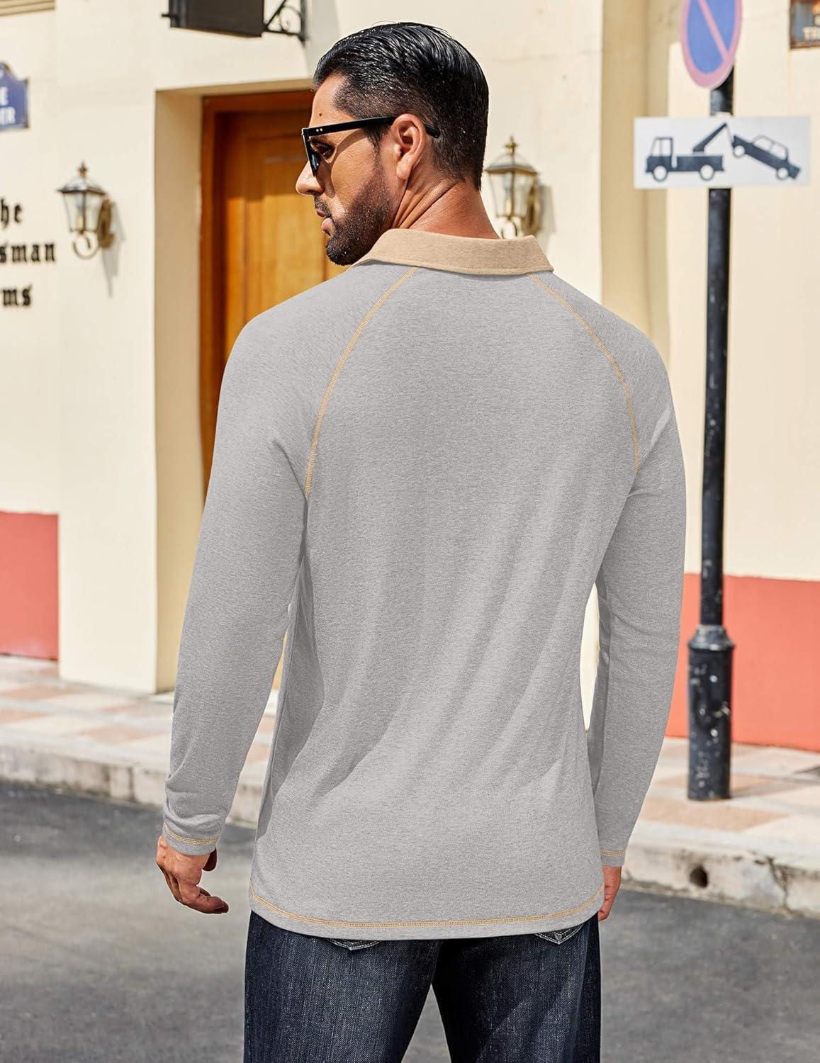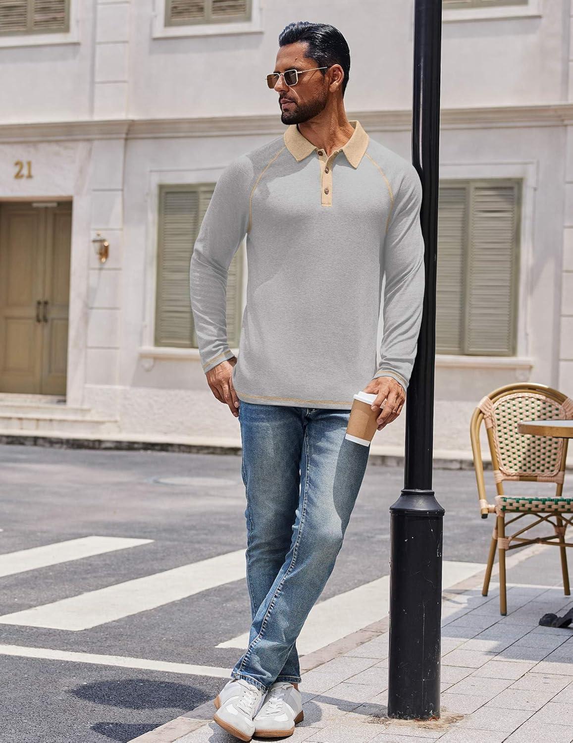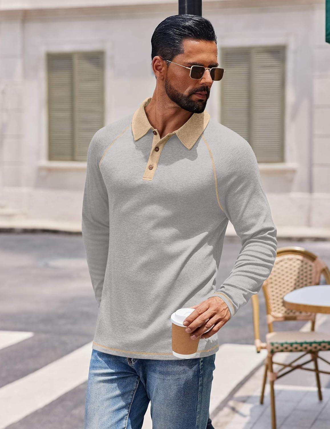 COOFANDY Mens Long Sleeve Polo Shirts Casual Button Collared Shirts Raglan Golf T Shirt(Light Grey)
