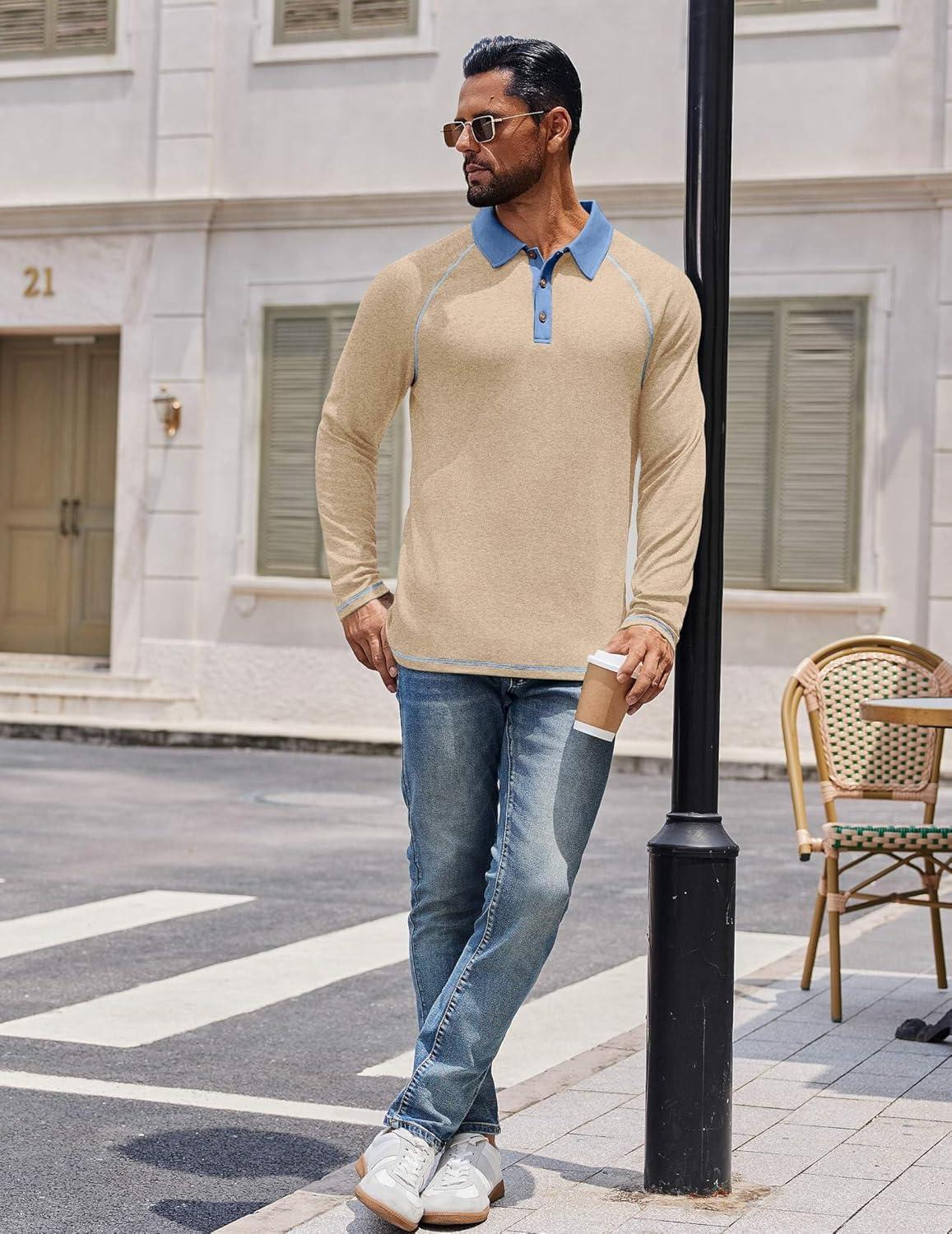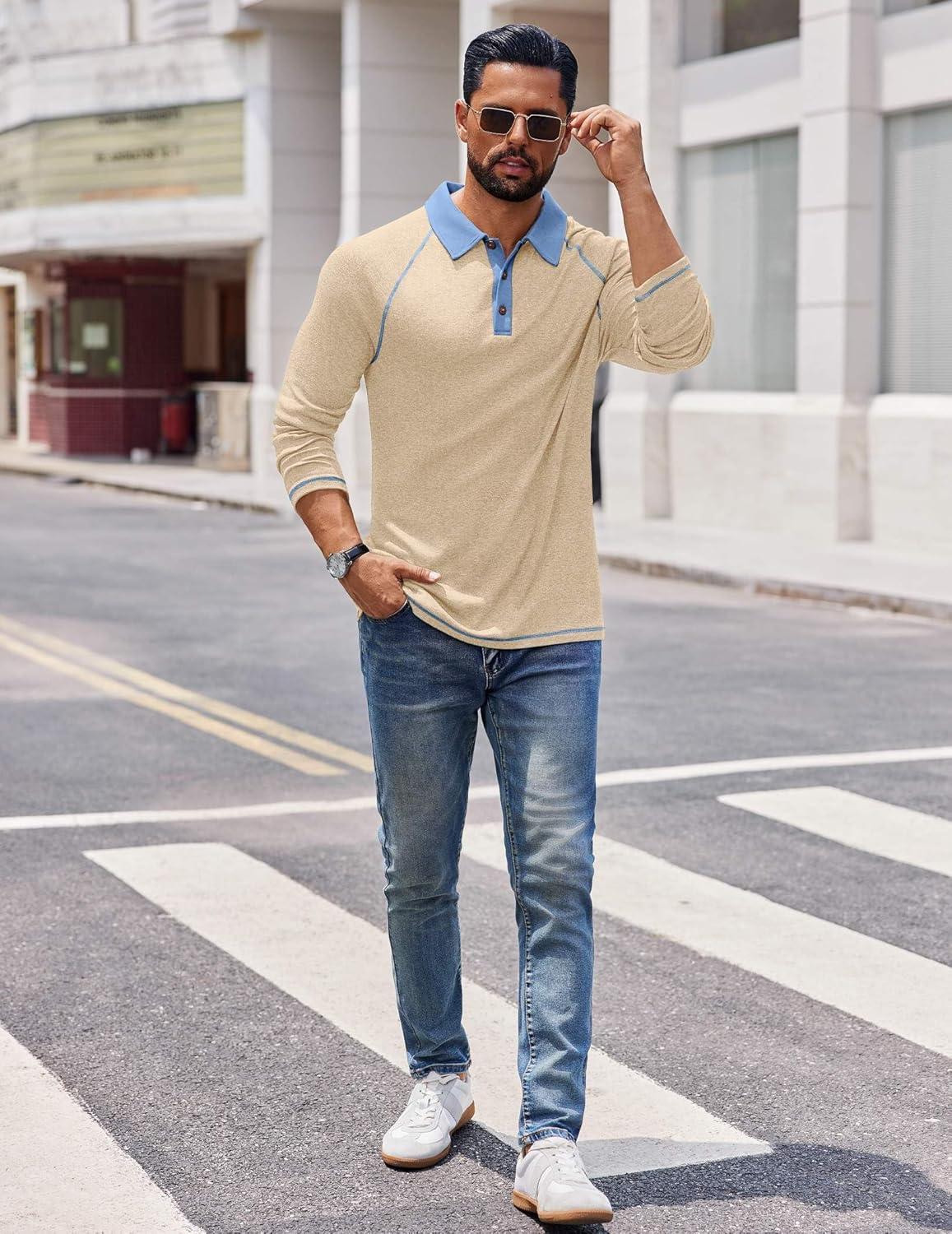 COOFANDY Mens Long Sleeve Polo Shirts Casual Button Collared Shirts Raglan Golf T Shirt(Light Khaki)