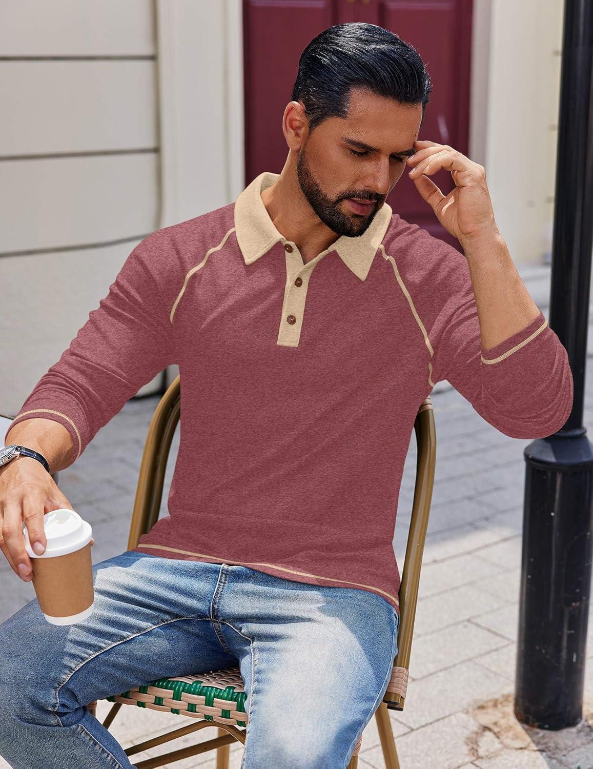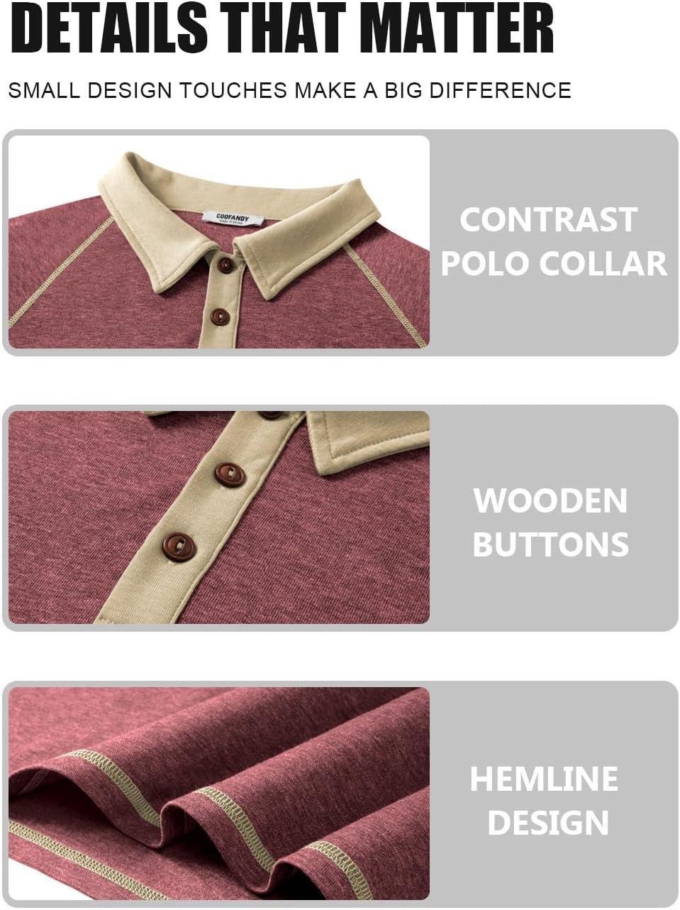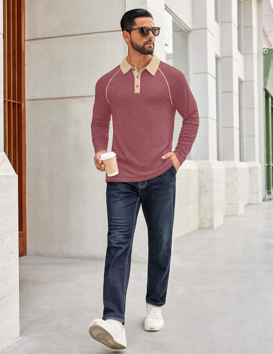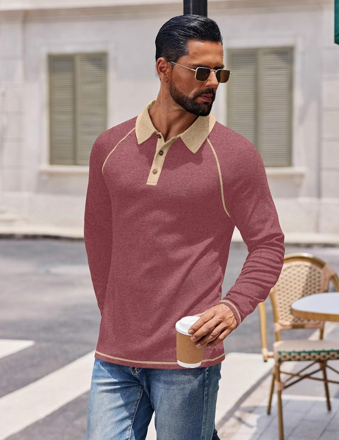 COOFANDY Mens Long Sleeve Polo Shirts Casual Button Collared Shirts Raglan Golf T Shirt(Red)