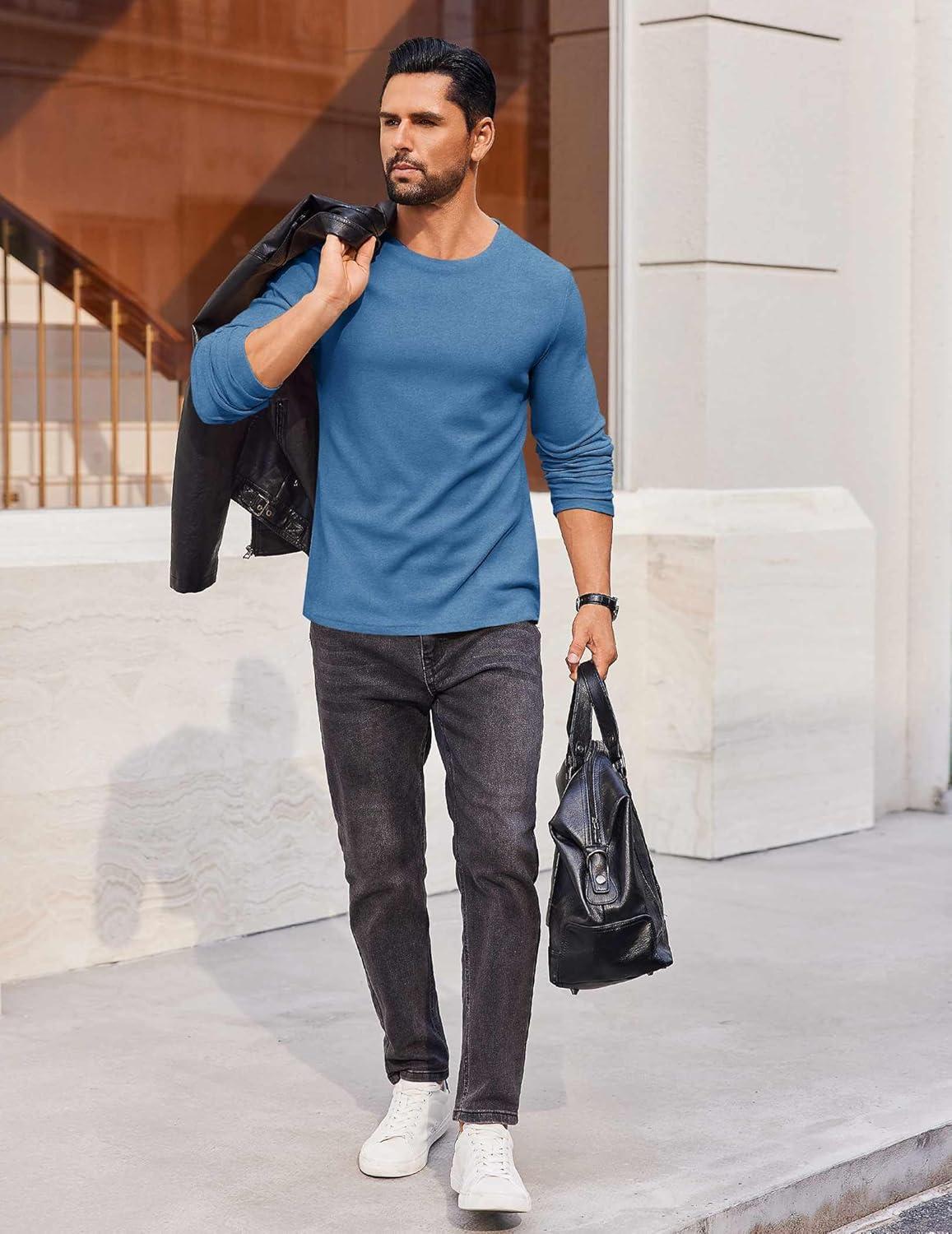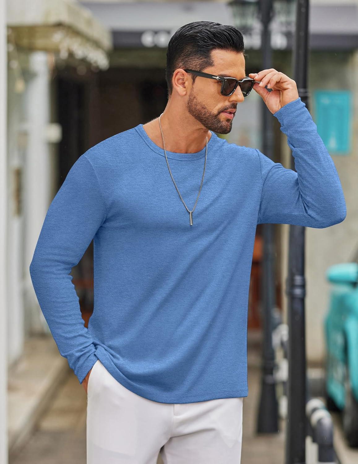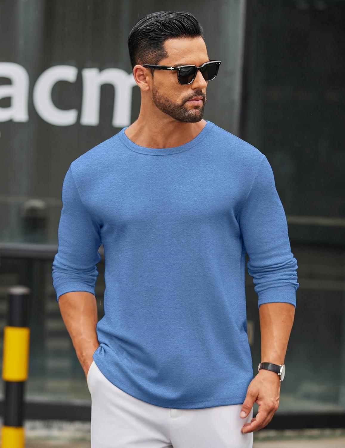 COOFANDY Men’s Long Sleeve Tee Shirts Crew Neck T Shirt Solid Casual Basic Tees Soft Stretch T-Shirts(Heather Blue)