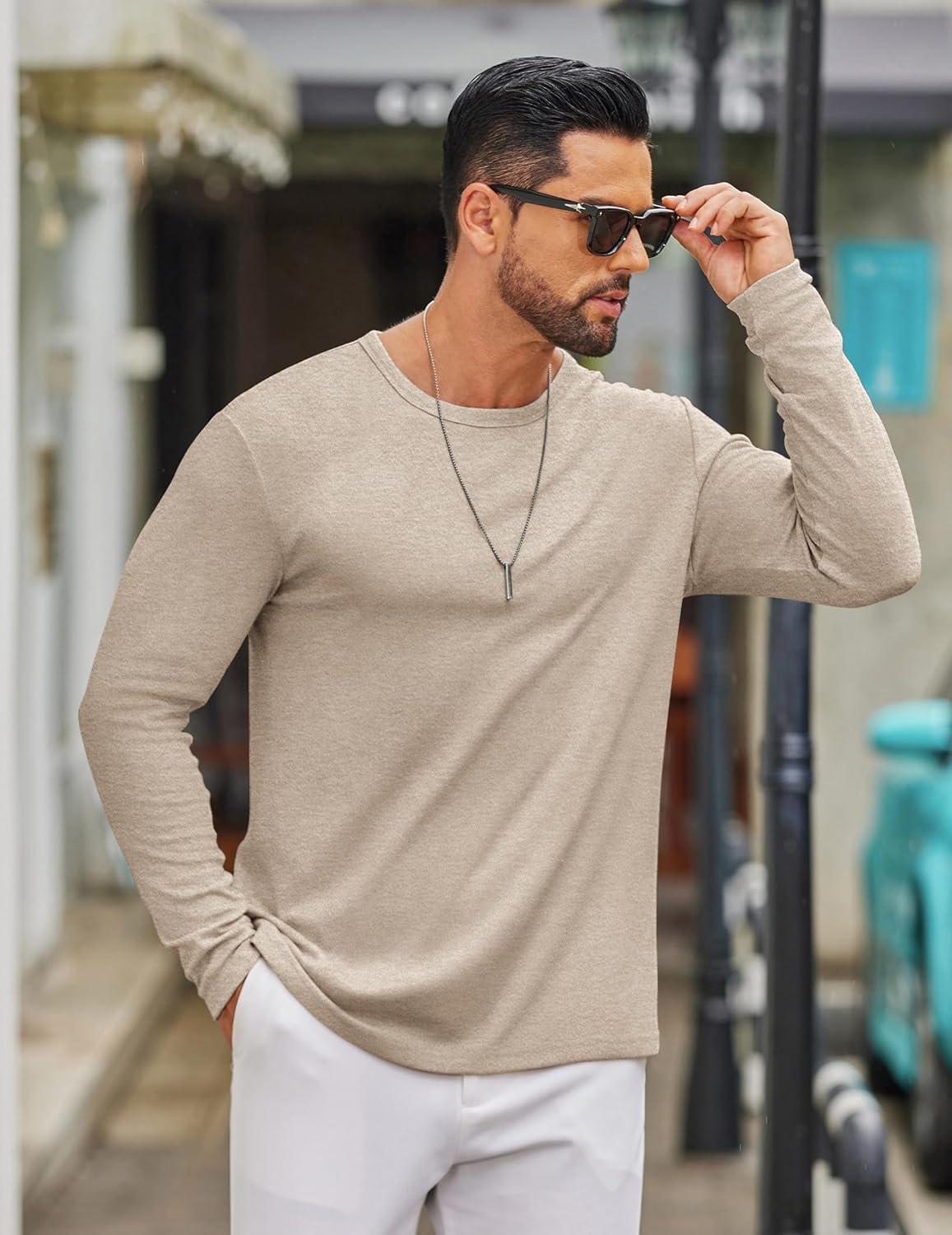 COOFANDY Men’s Long Sleeve Tee Shirts Crew Neck T Shirt Solid Casual Basic Tees Soft Stretch T-Shirts(Light Khaki)