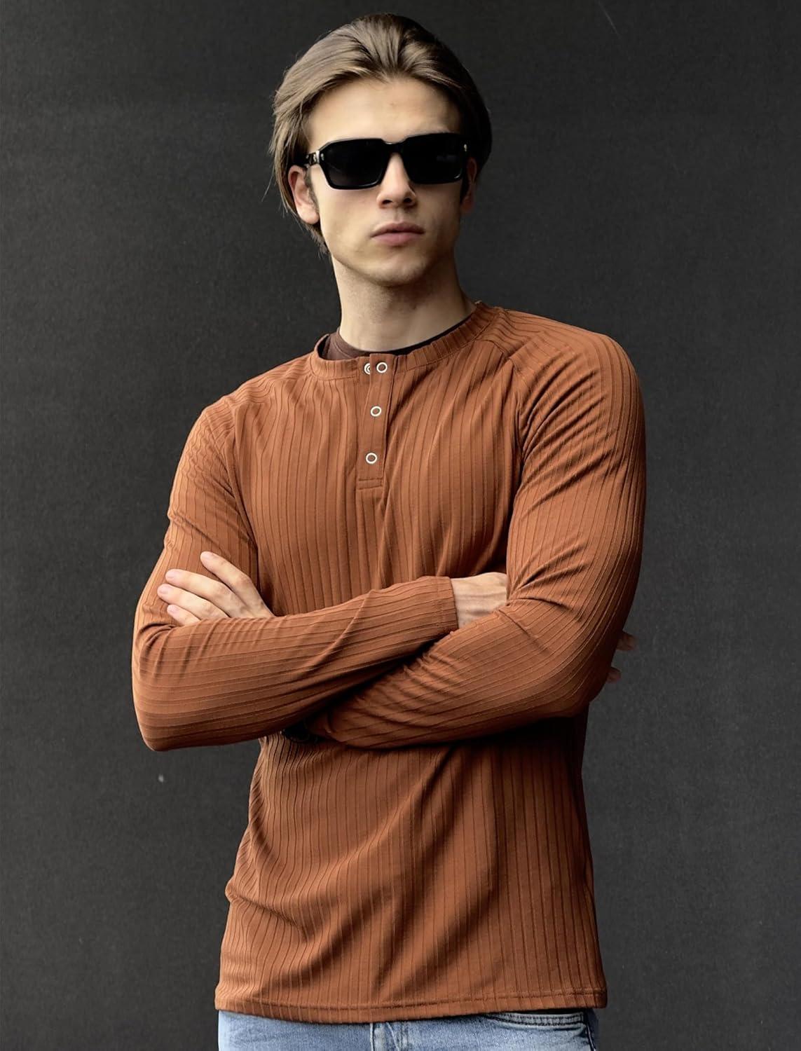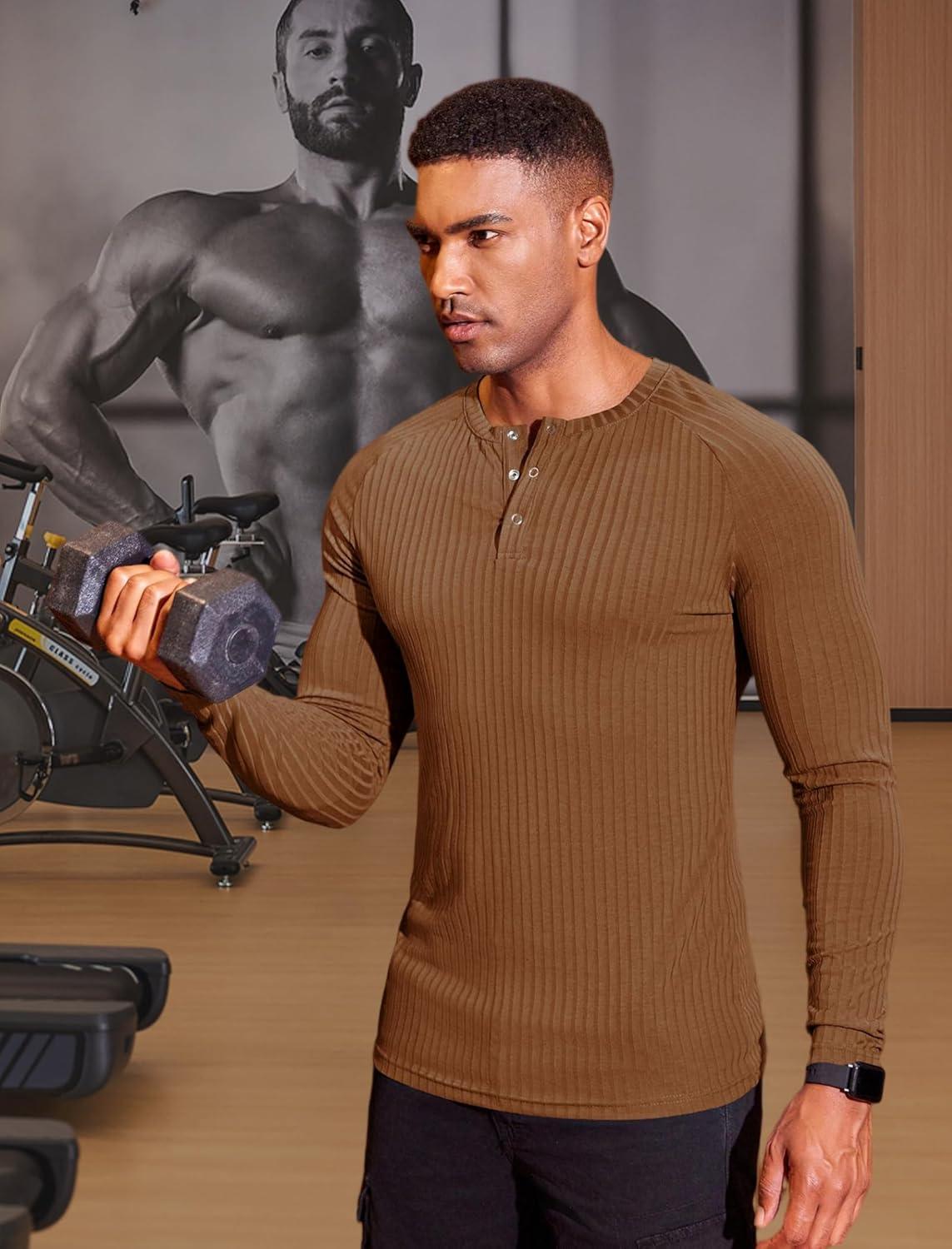 COOFANDY Men’s Muscle Slim Fit T-Shirt Long Sleeve Henley Shirts Casual Gym Workout Athletic Tee Shirts(Brown)