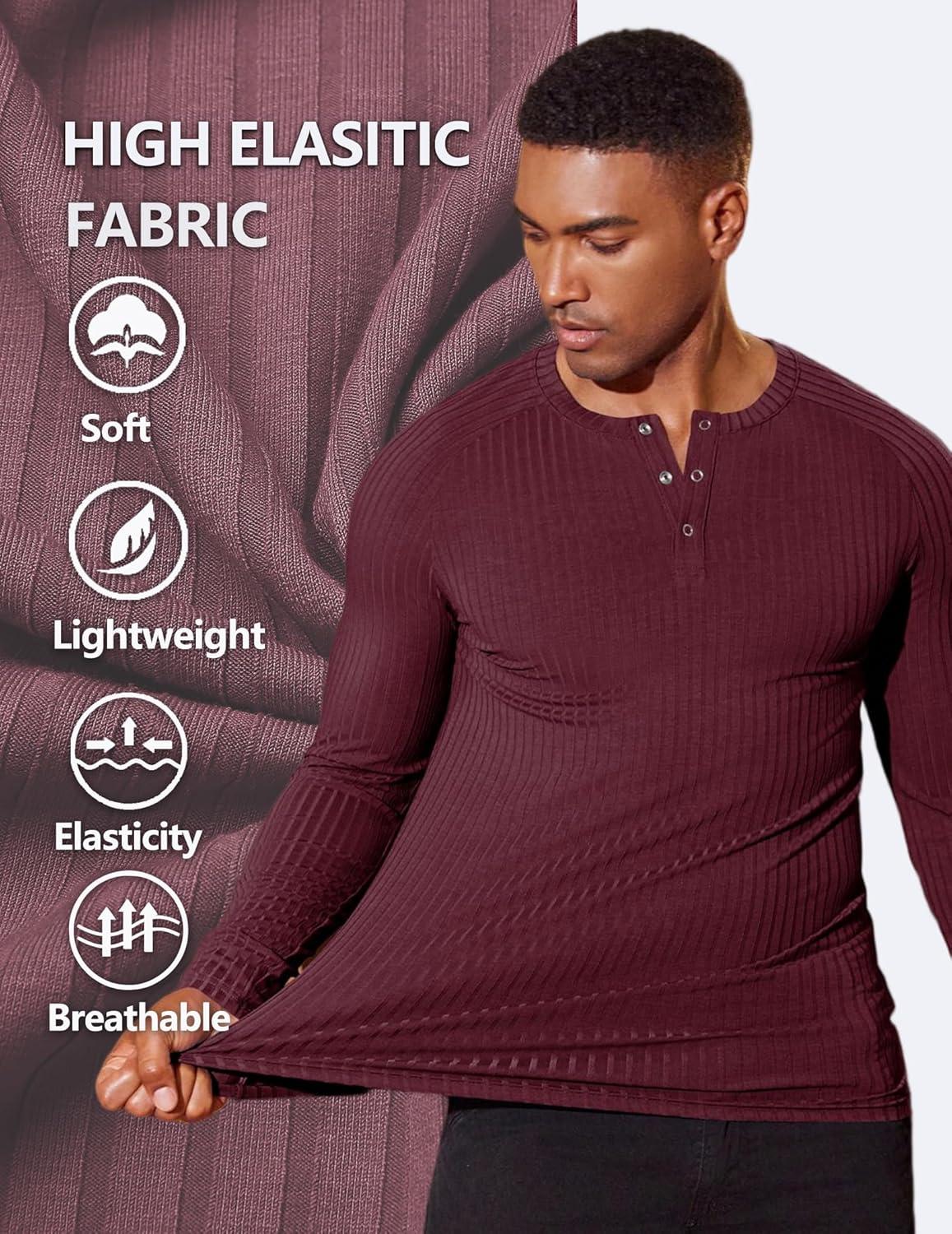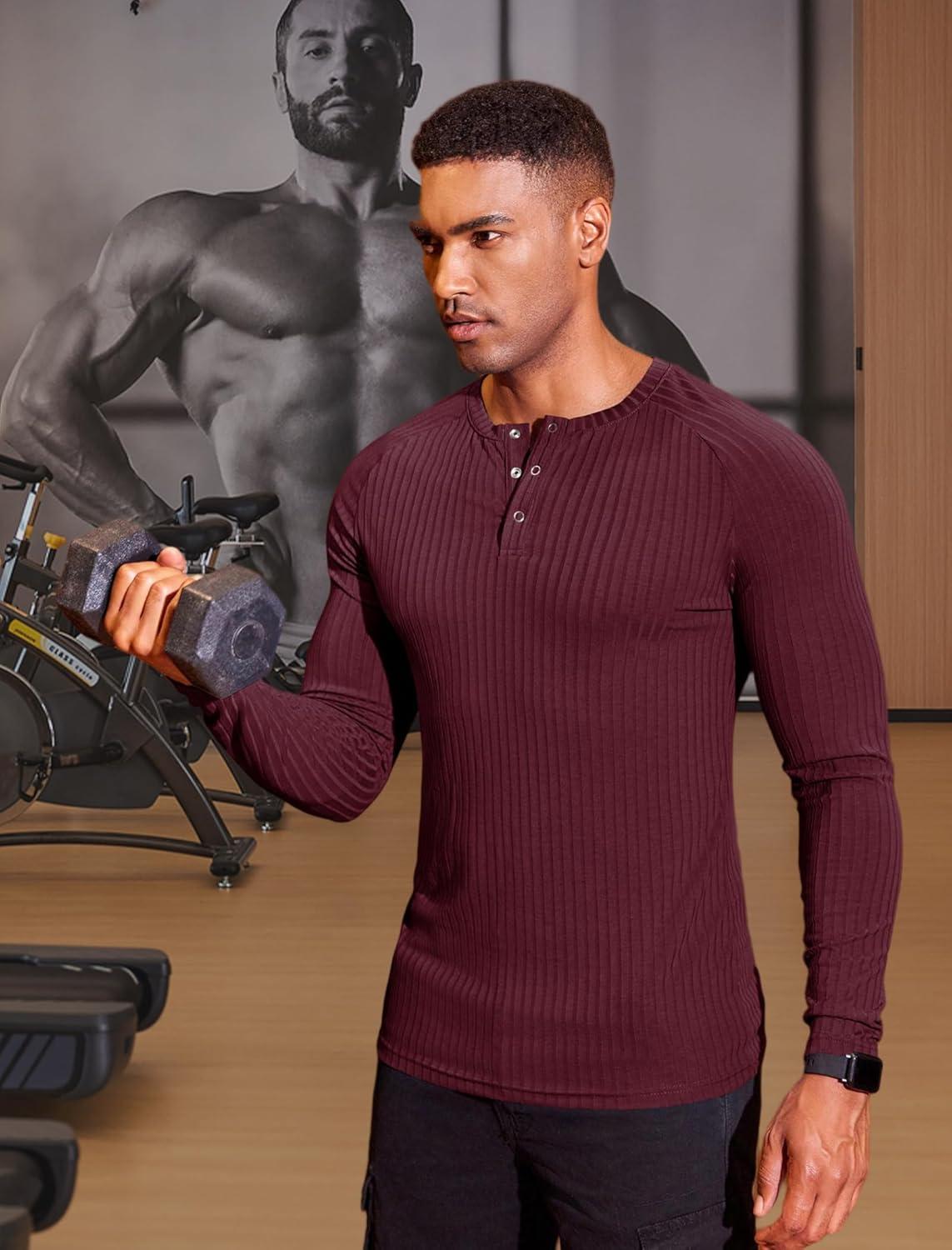 COOFANDY Men’s Muscle Slim Fit T-Shirt Long Sleeve Henley Shirts Casual Gym Workout Athletic Tee Shirts(Wine Red)