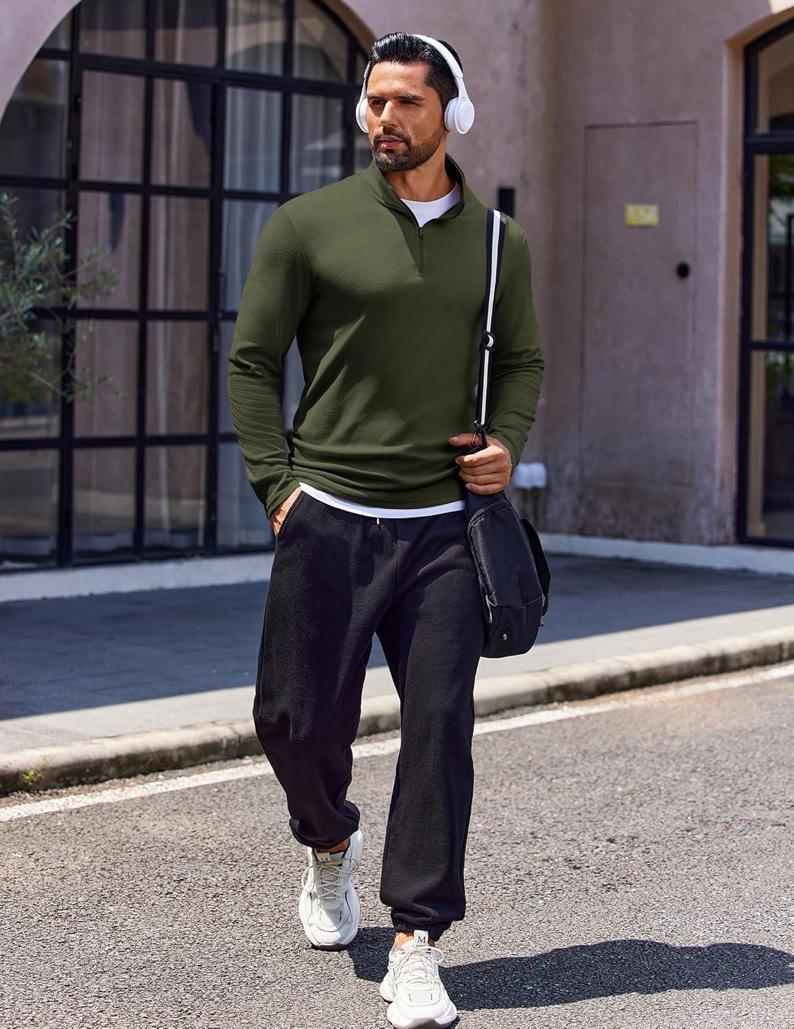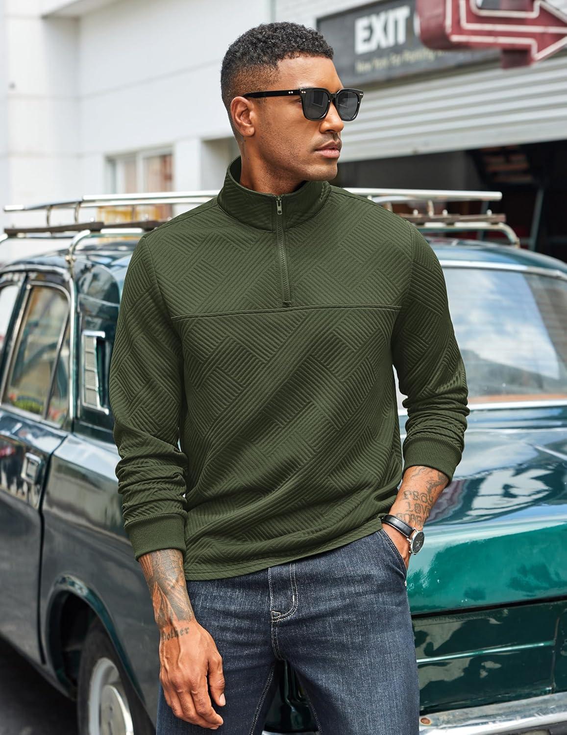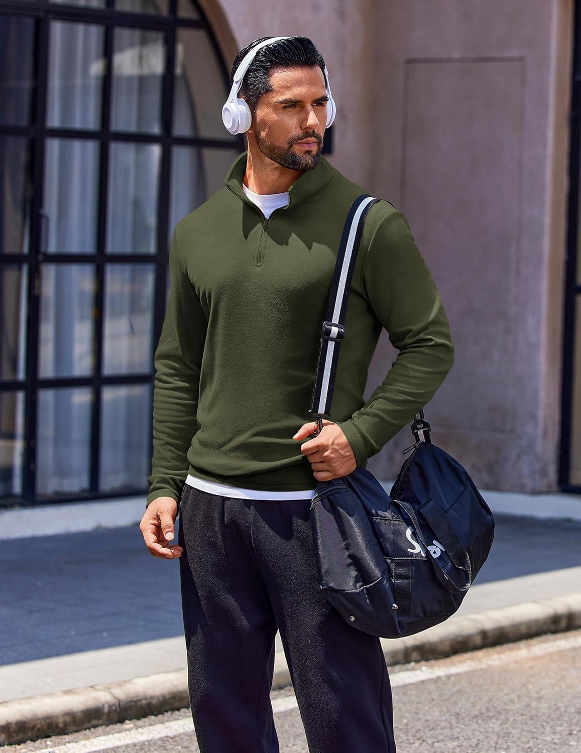 COOFANDY Men’s Quarter Zip Pullover Lightweight Textured T-Shirts Long Sleeve Casual Mock Neck Polo Shirts(Army Green)