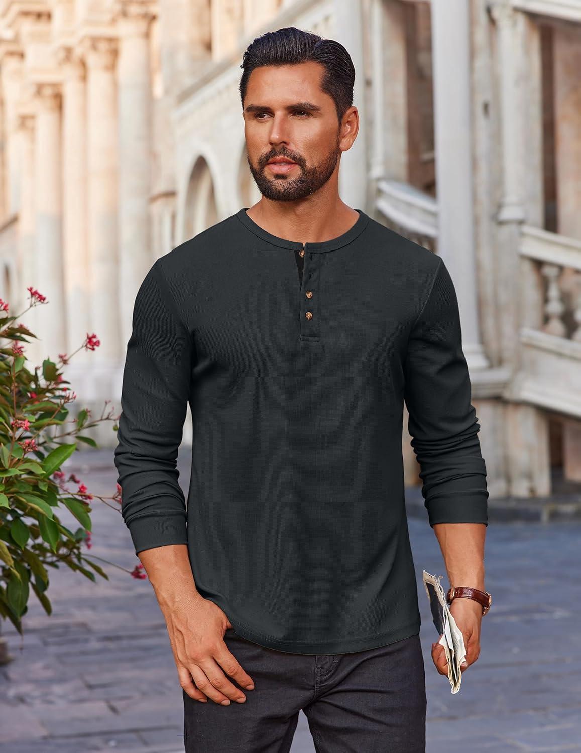 COOFANDY Mens Henley Shirts Long Sleeve Casual Pullover Shirt Fashion Button T-Shirt(Dark Grey)