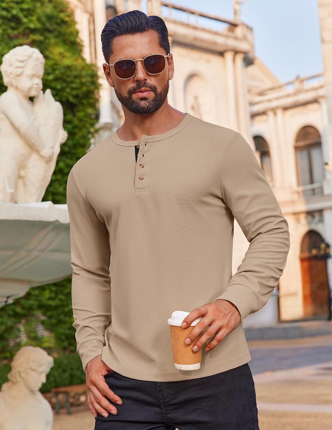 COOFANDY Mens Henley Shirts Long Sleeve Casual Pullover Shirt Fashion Button T-Shirt(Khaki)