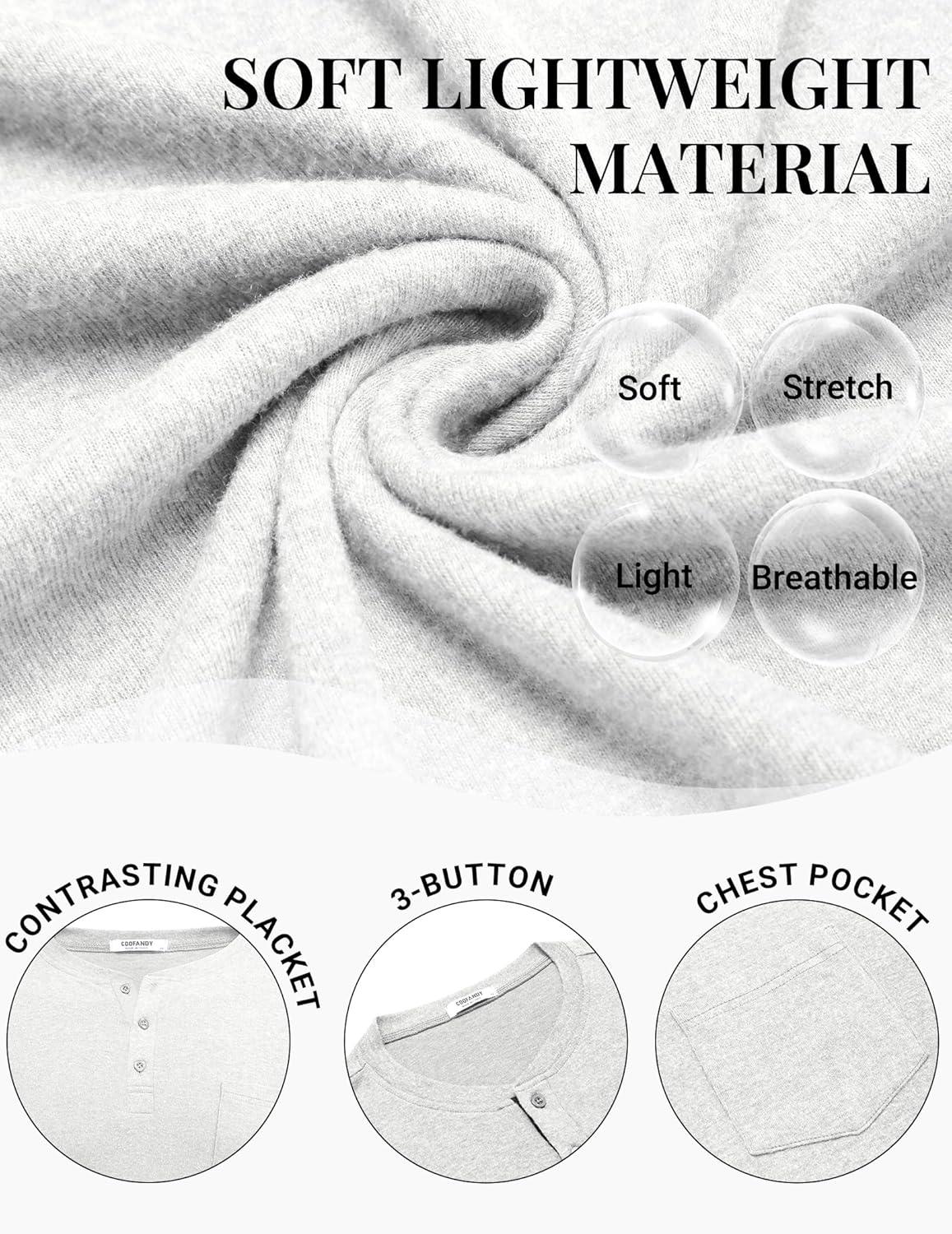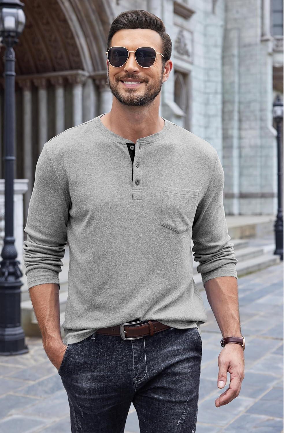 COOFANDY Men Long Sleeve Henley Shirs Casual Basic T Shirts Soild Button Tees with Pockets(Light Gray)