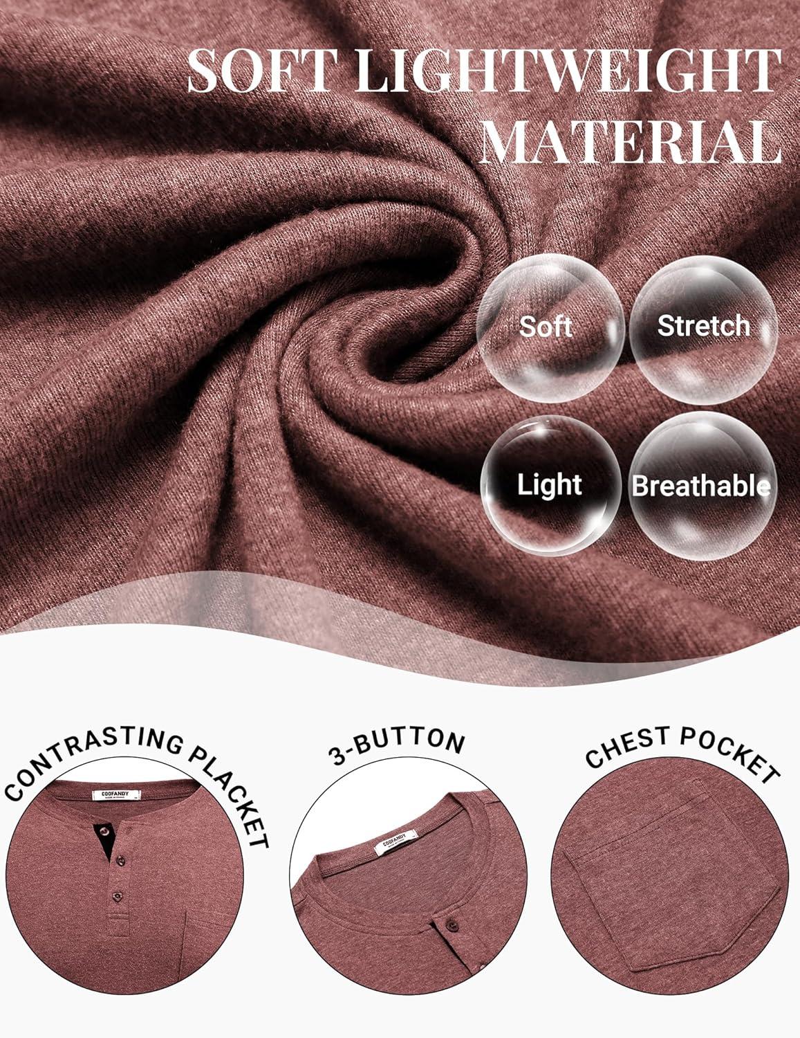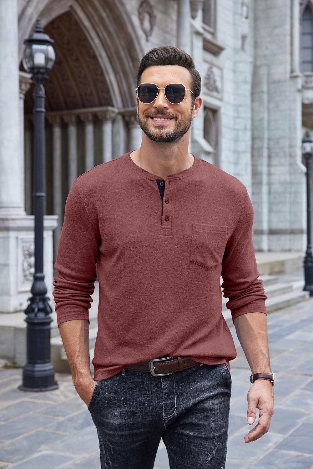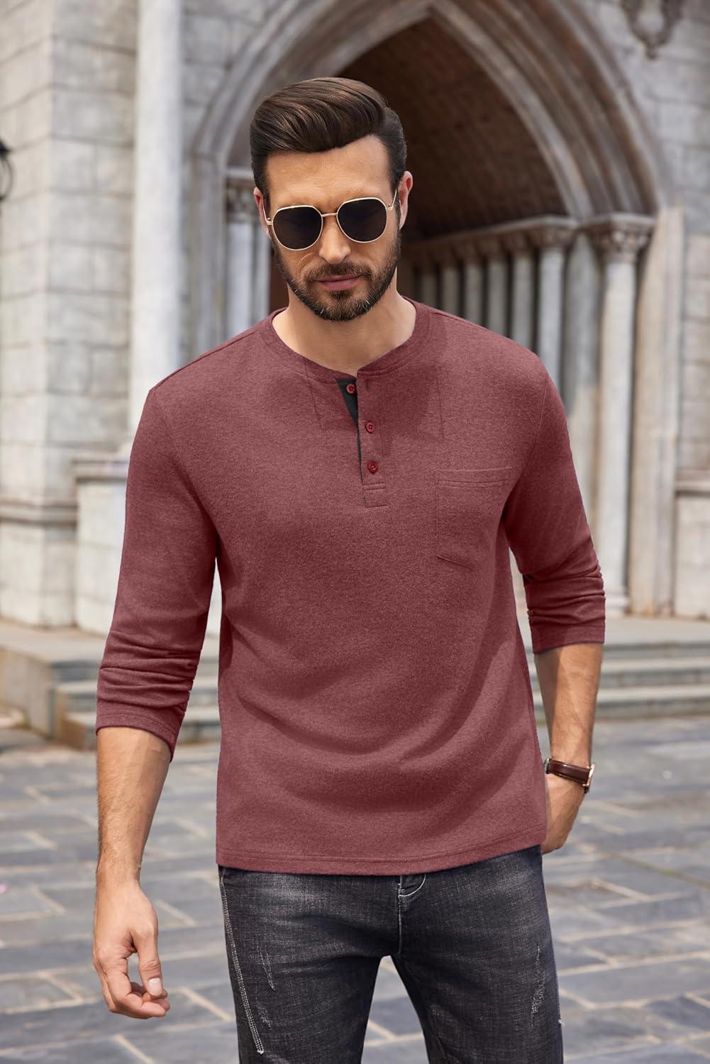COOFANDY Men Long Sleeve Henley Shirs Casual Basic T Shirts Soild Button Tees with Pockets(Purple Red)