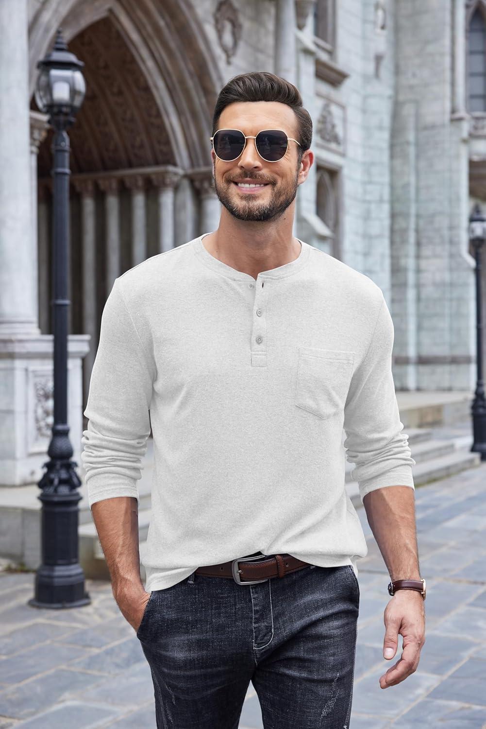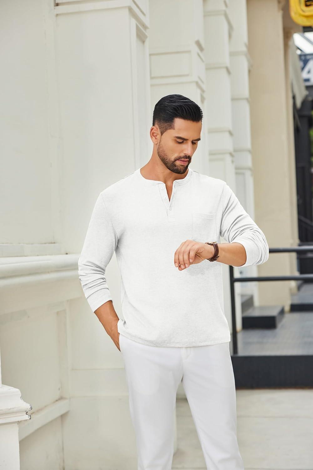 COOFANDY Men Long Sleeve Henley Shirs Casual Basic T Shirts Soild Button Tees with Pockets(White)
