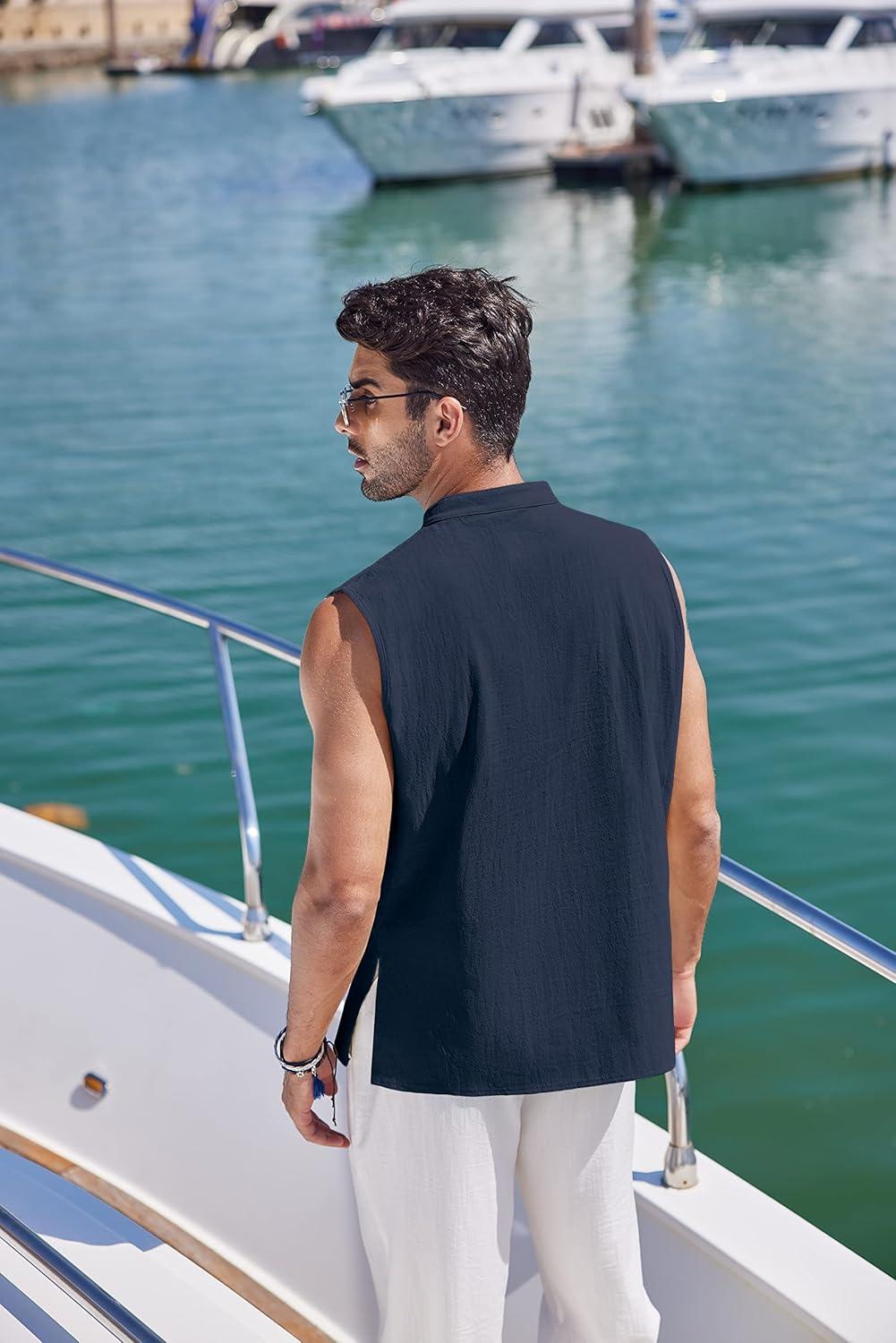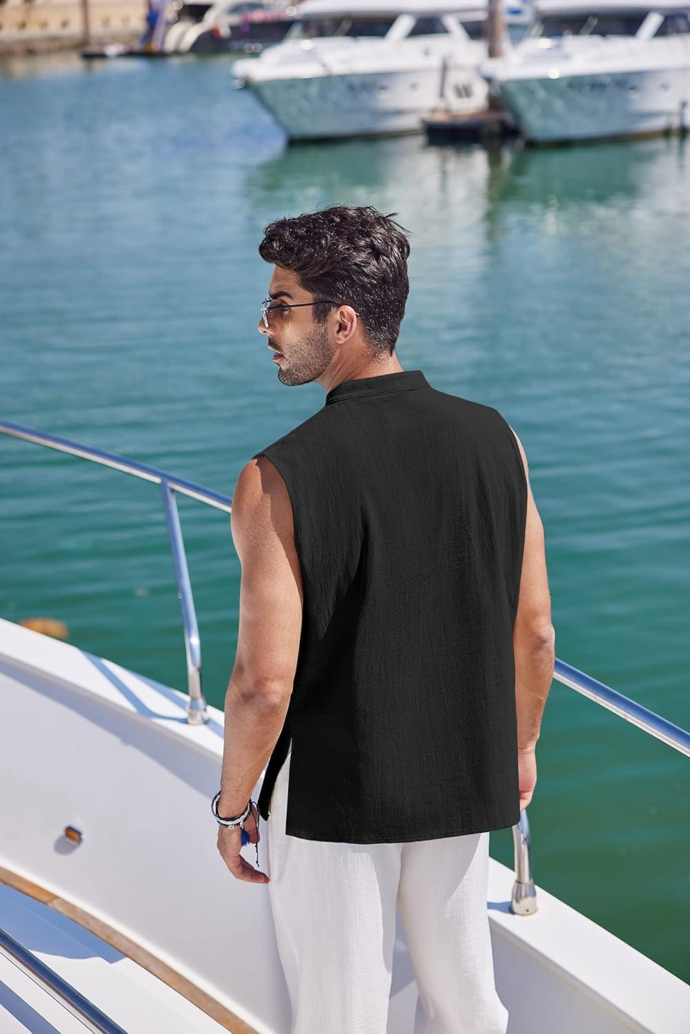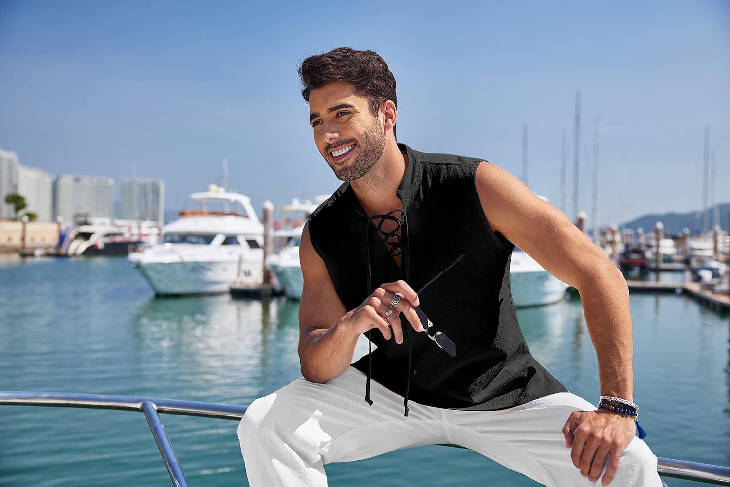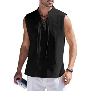 COOFANDY Men Tank Top Cotton Linen Beach Sleeveless Shirt Lace Up Bohemian Hippie Renaissance Pirate Kilt Medieval Tunic(Black)