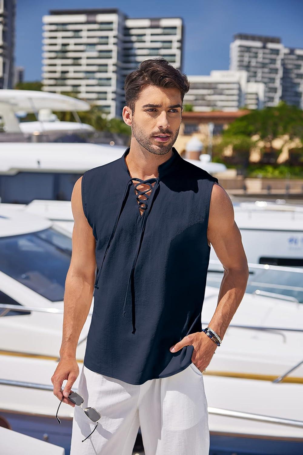 COOFANDY Men Tank Top Cotton Linen Beach Sleeveless Shirt Lace Up Bohemian Hippie Renaissance Pirate Kilt Medieval Tunic(Blue)