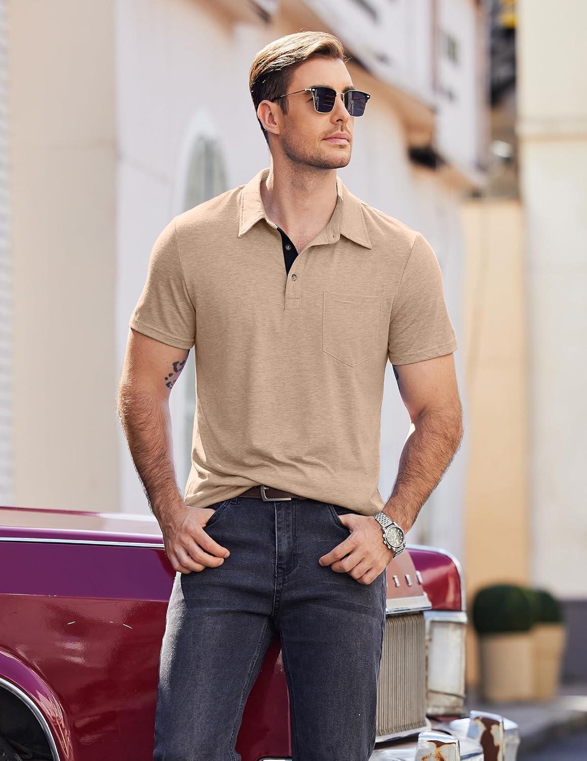 COOFANDY Men Short Sleeve Polo Shirt Casual Summer Collar Shirts Dress Button Polo T Shirt Classic Golf Shirts(Beige)