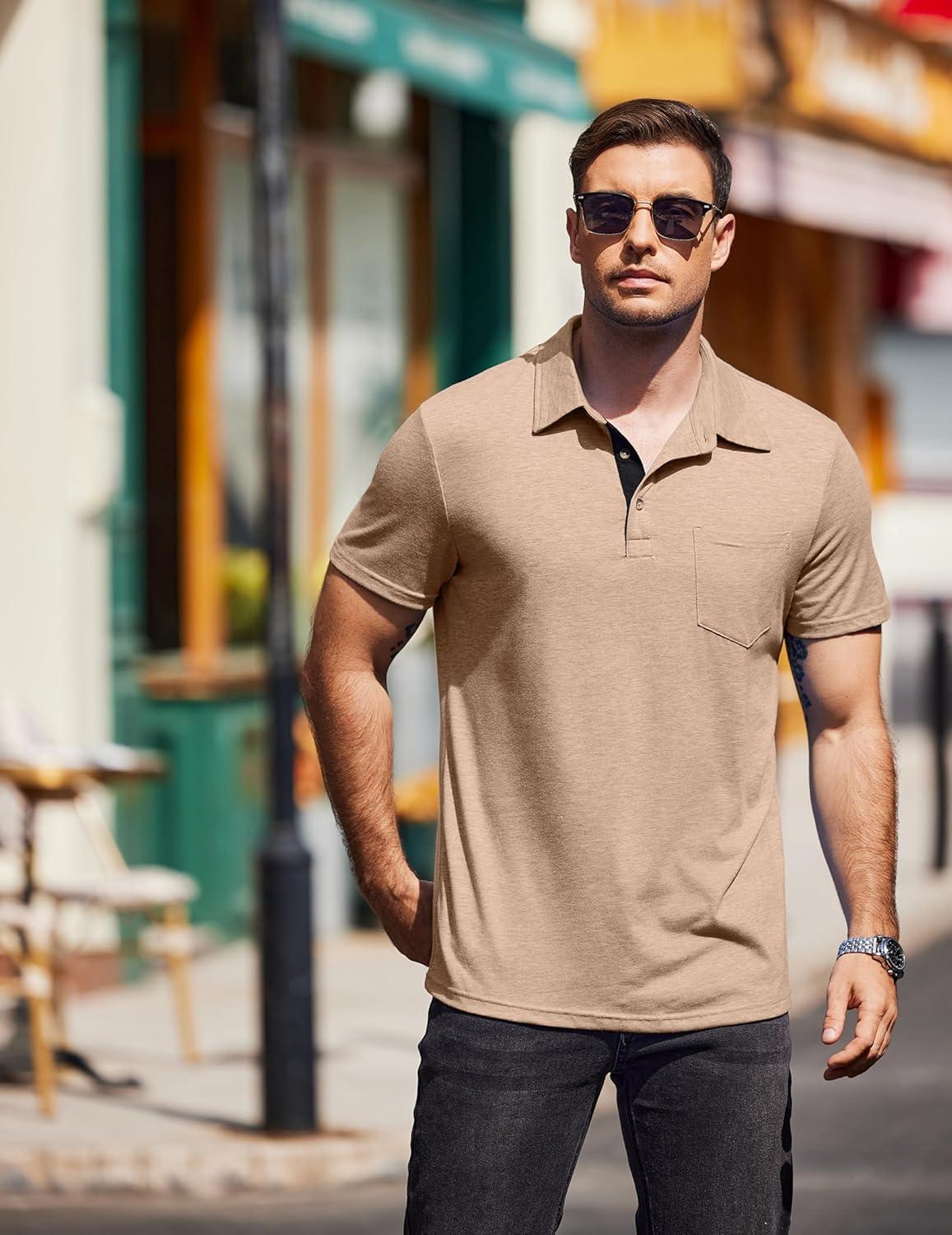 COOFANDY Men Short Sleeve Polo Shirt Casual Summer Collar Shirts Dress Button Polo T Shirt Classic Golf Shirts(Khaki)