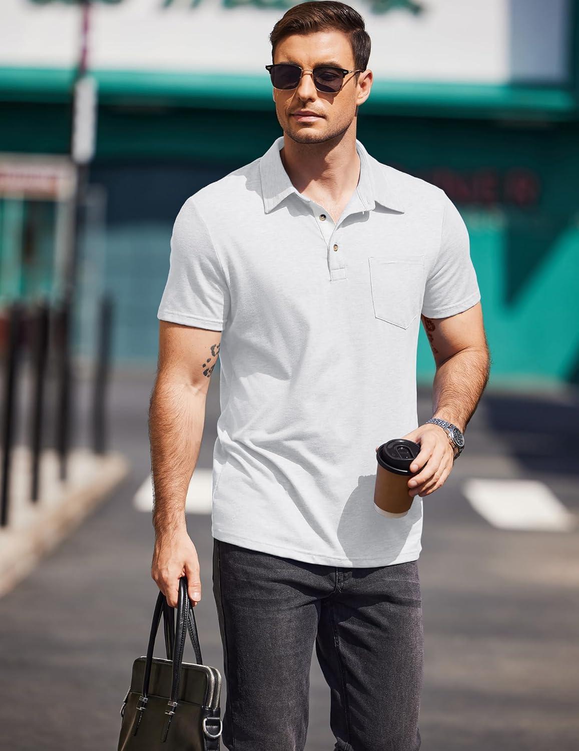COOFANDY Men Short Sleeve Polo Shirt Casual Summer Collar Shirts Dress Button Polo T Shirt Classic Golf Shirts(White)