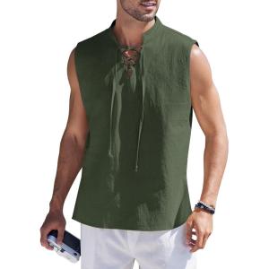 COOFANDY Men Tank Top Cotton Linen Beach Sleeveless Shirt Lace Up Bohemian Hippie Renaissance Pirate Kilt Medieval Tunic(Army Green)