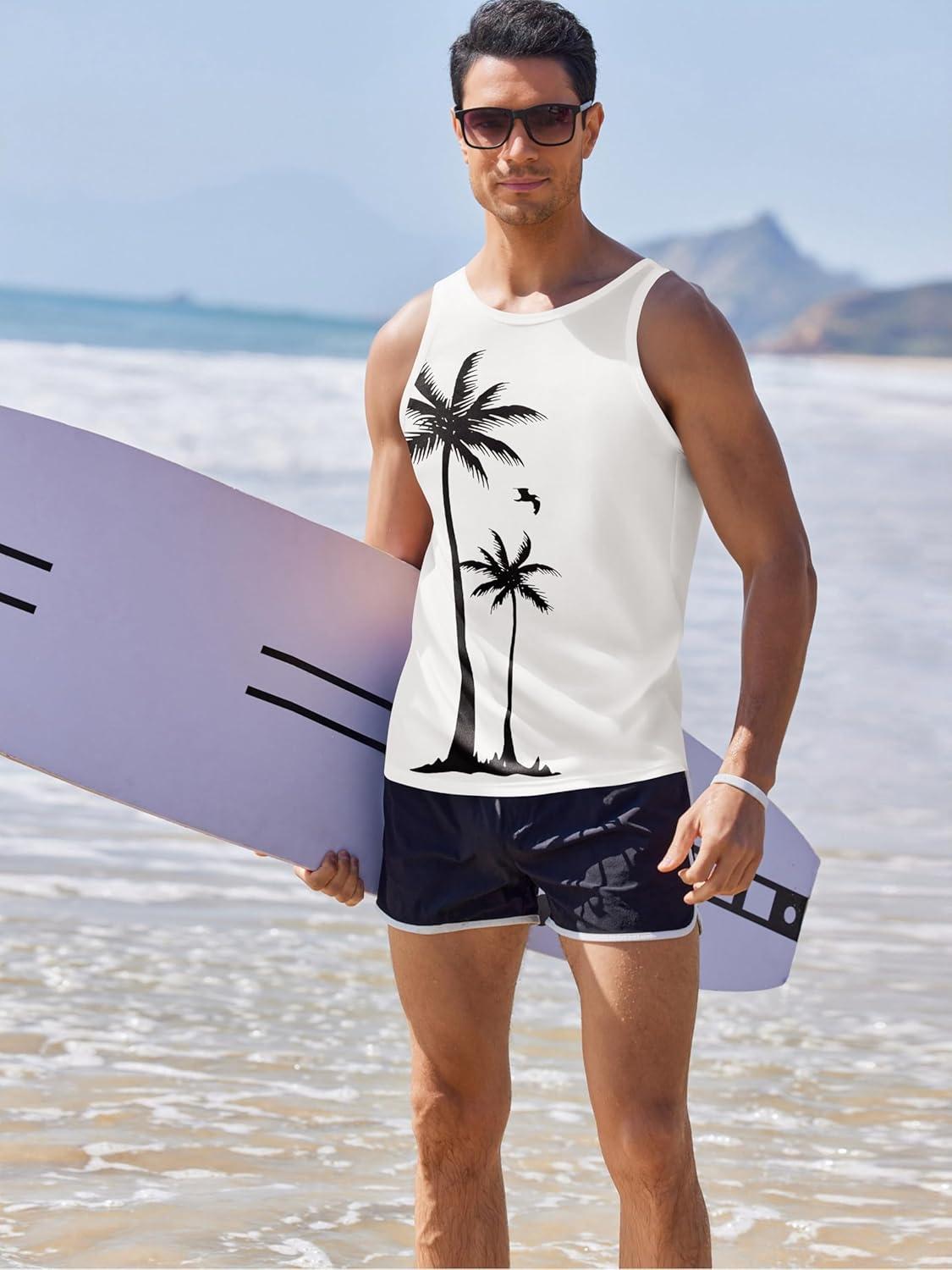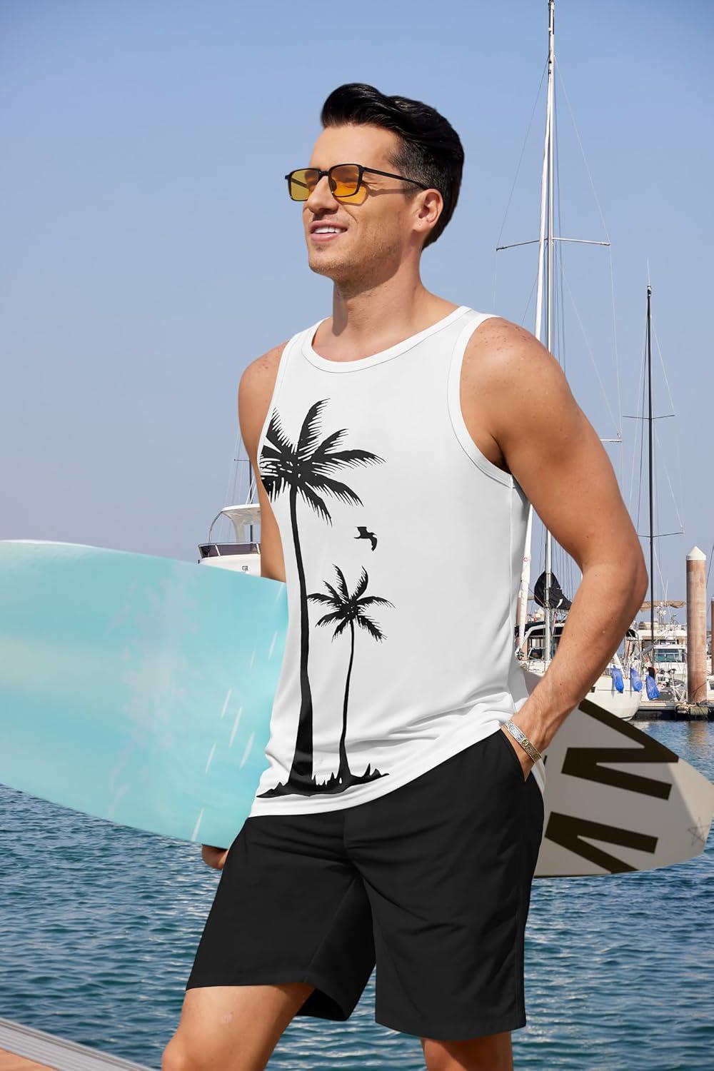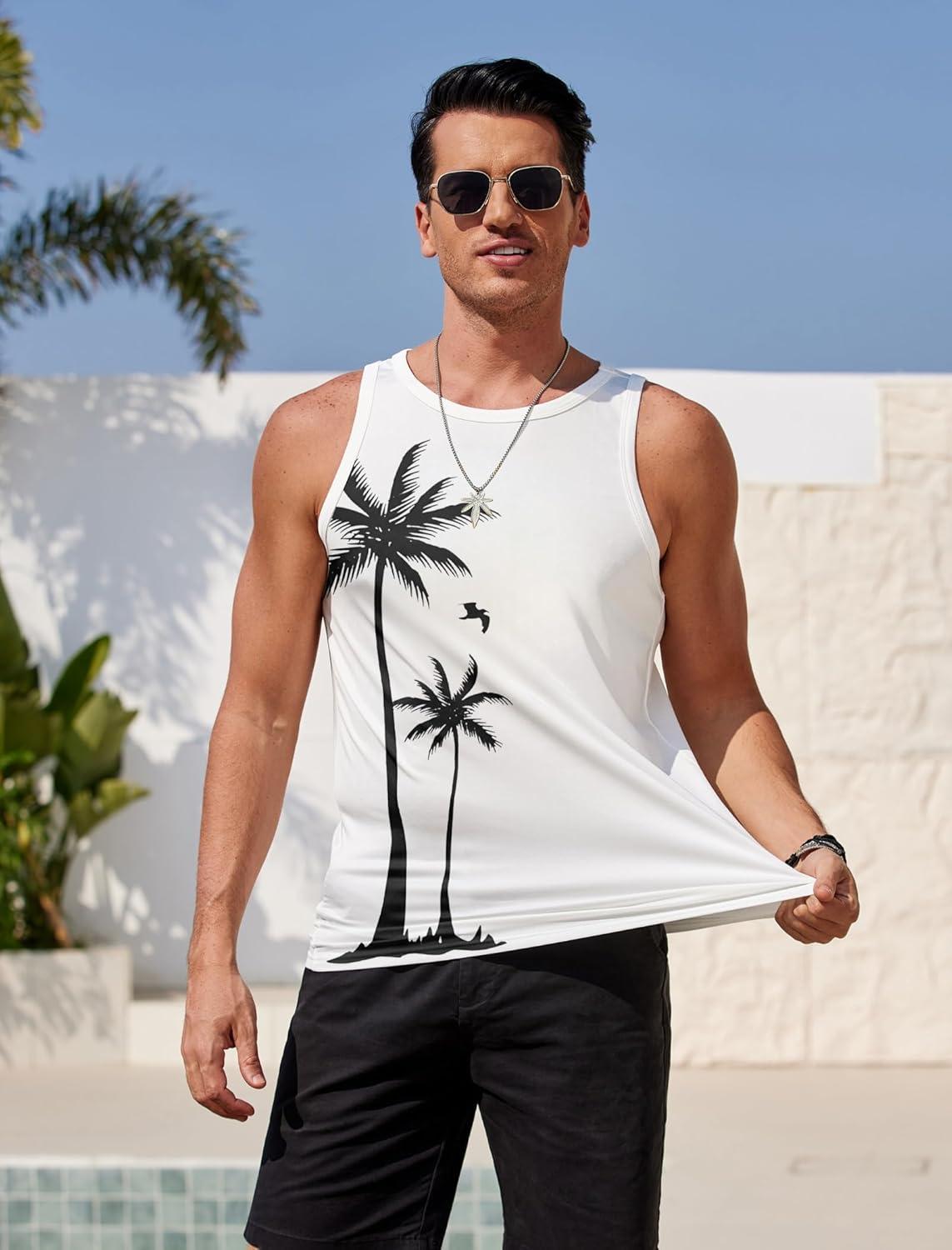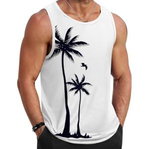 COOFANDY Mens Tank Tops Beach Summer Sleeveless Graphic T Shirts Palm Tree Vacation Quick Dry Muscle Tank(White-coconut)