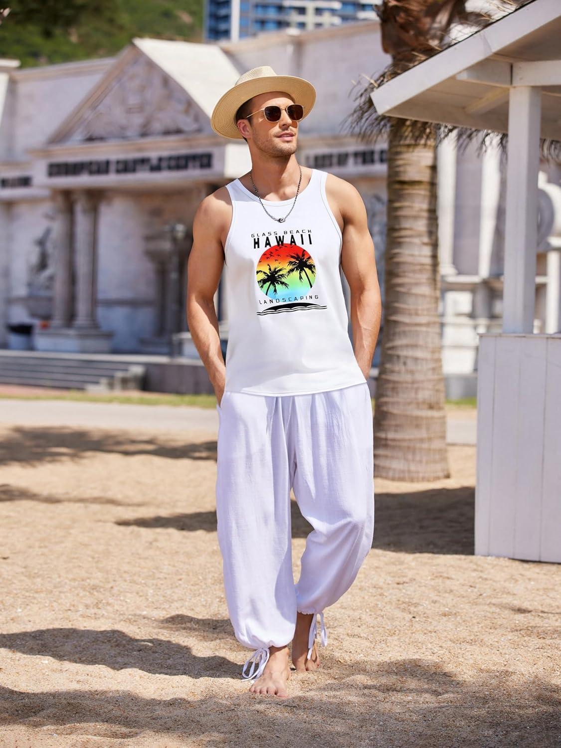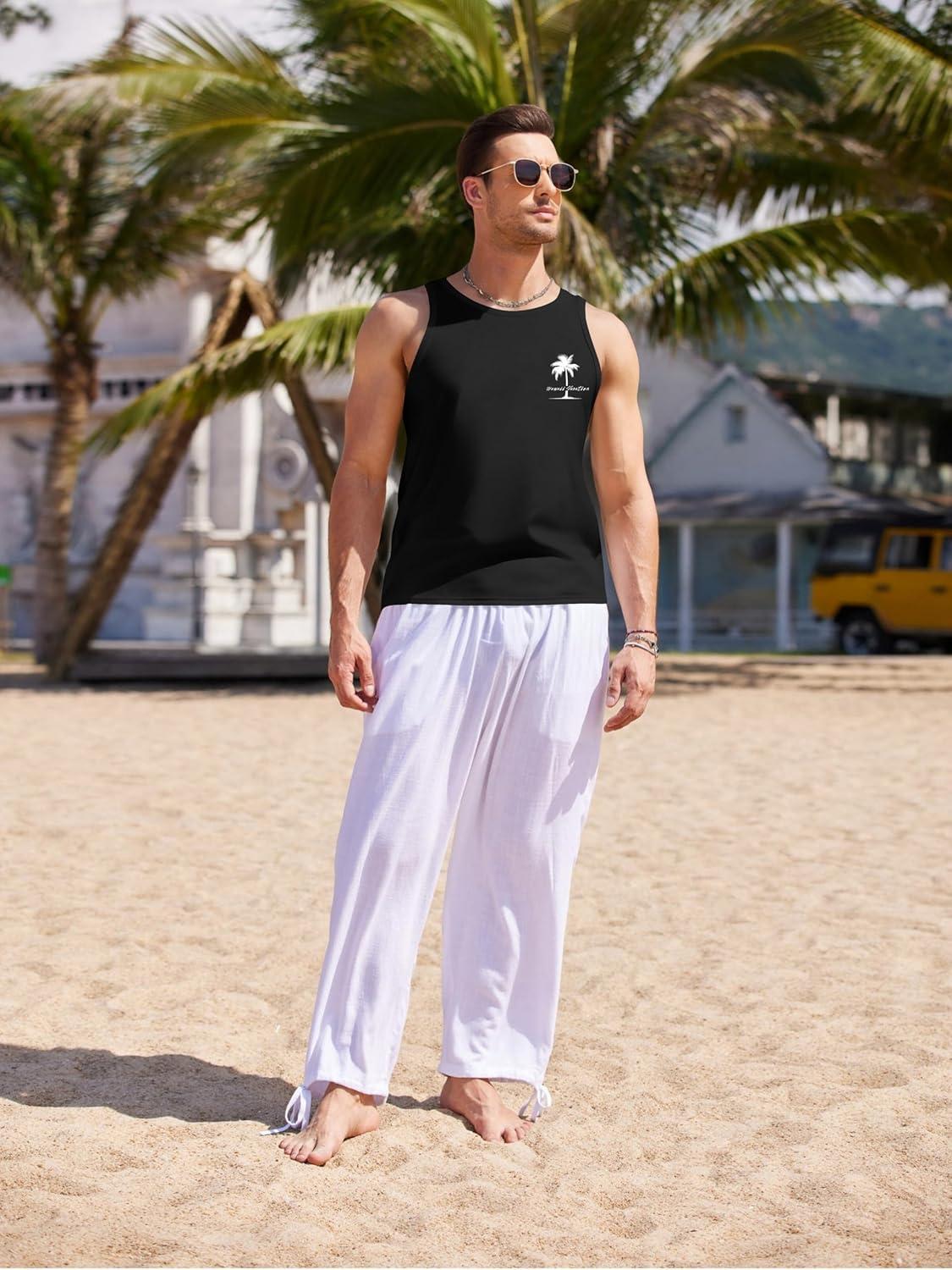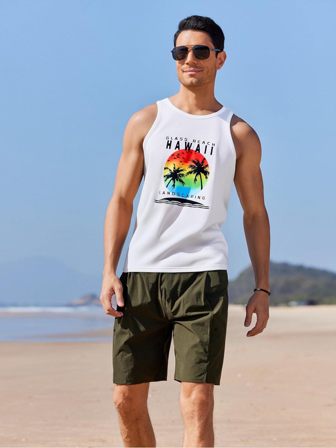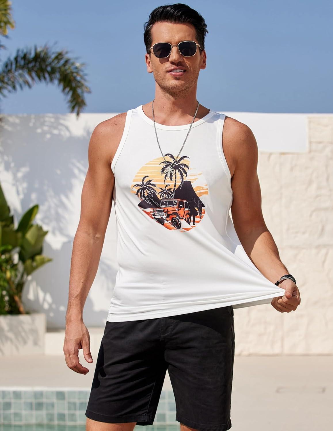 COOFANDY Mens Tank Tops Beach Summer Sleeveless Graphic T Shirts Palm Tree Vacation Quick Dry Muscle Tank(White-coconut)