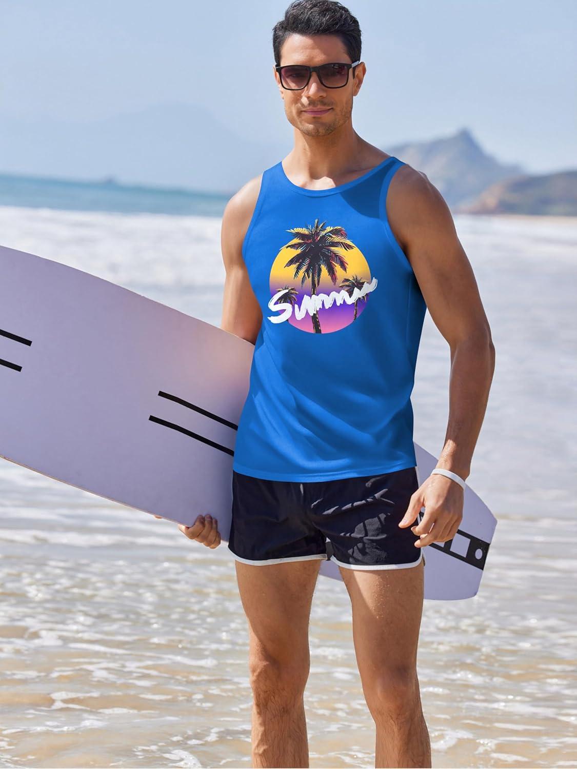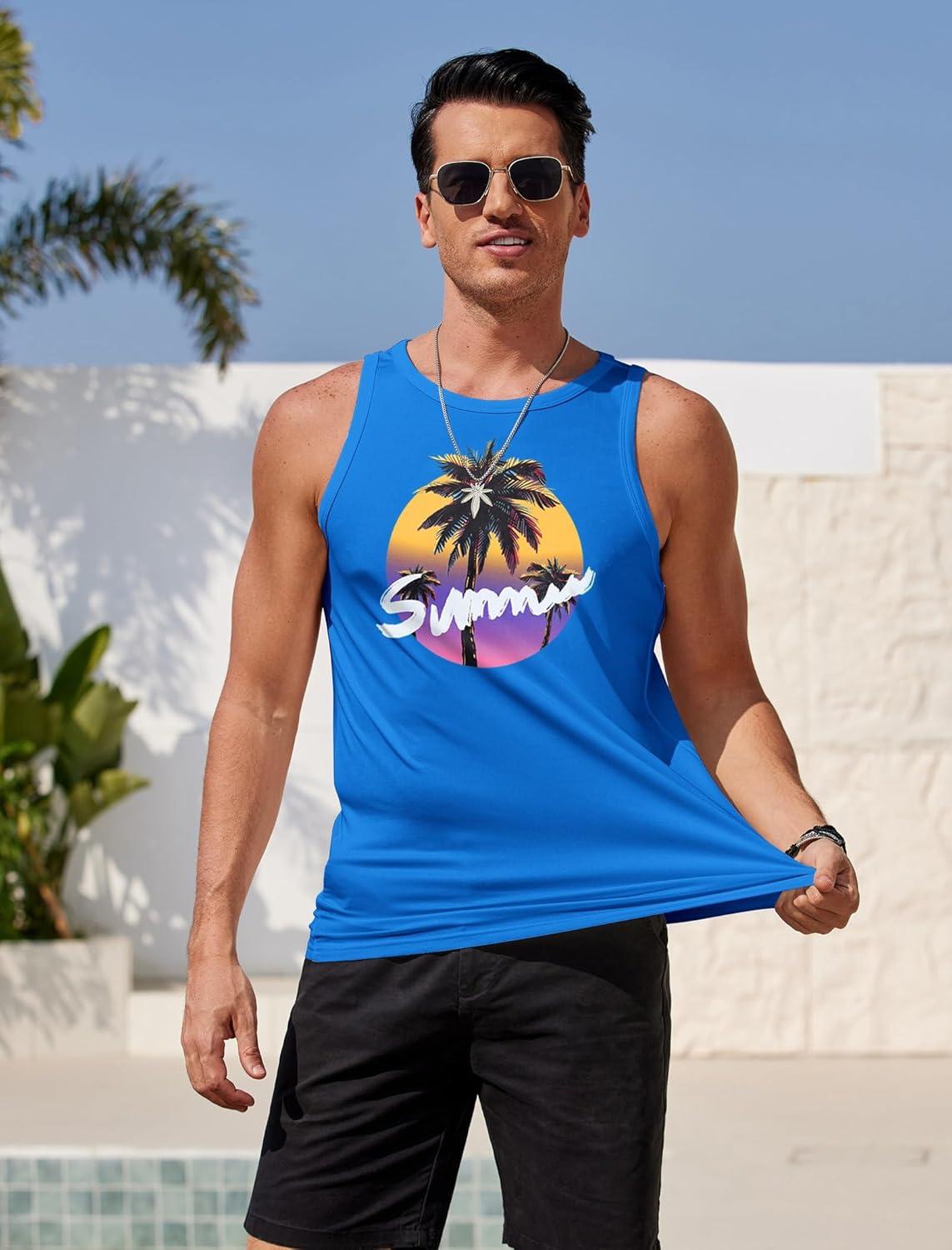 COOFANDY Mens Tank Tops Beach Summer Sleeveless Graphic T Shirts Palm Tree Vacation Quick Dry Muscle Tank(Gray+blue)