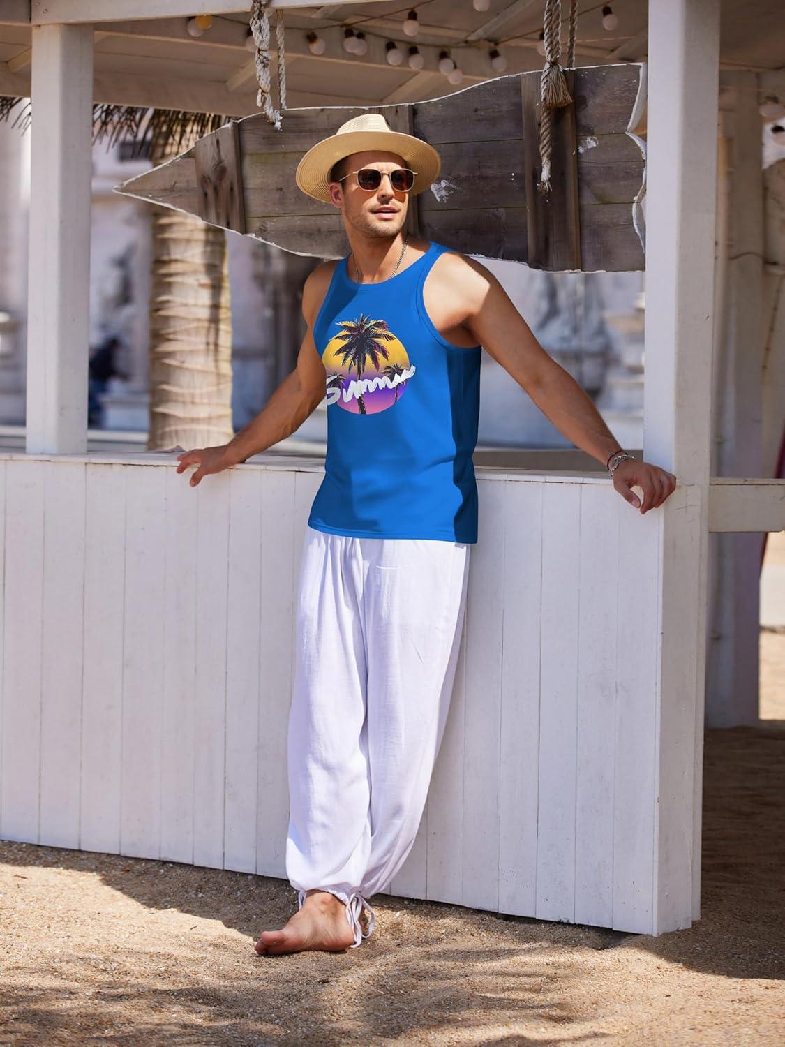COOFANDY Mens Tank Tops Beach Summer Sleeveless Graphic T Shirts Palm Tree Vacation Quick Dry Muscle Tank(Blue-coconut)