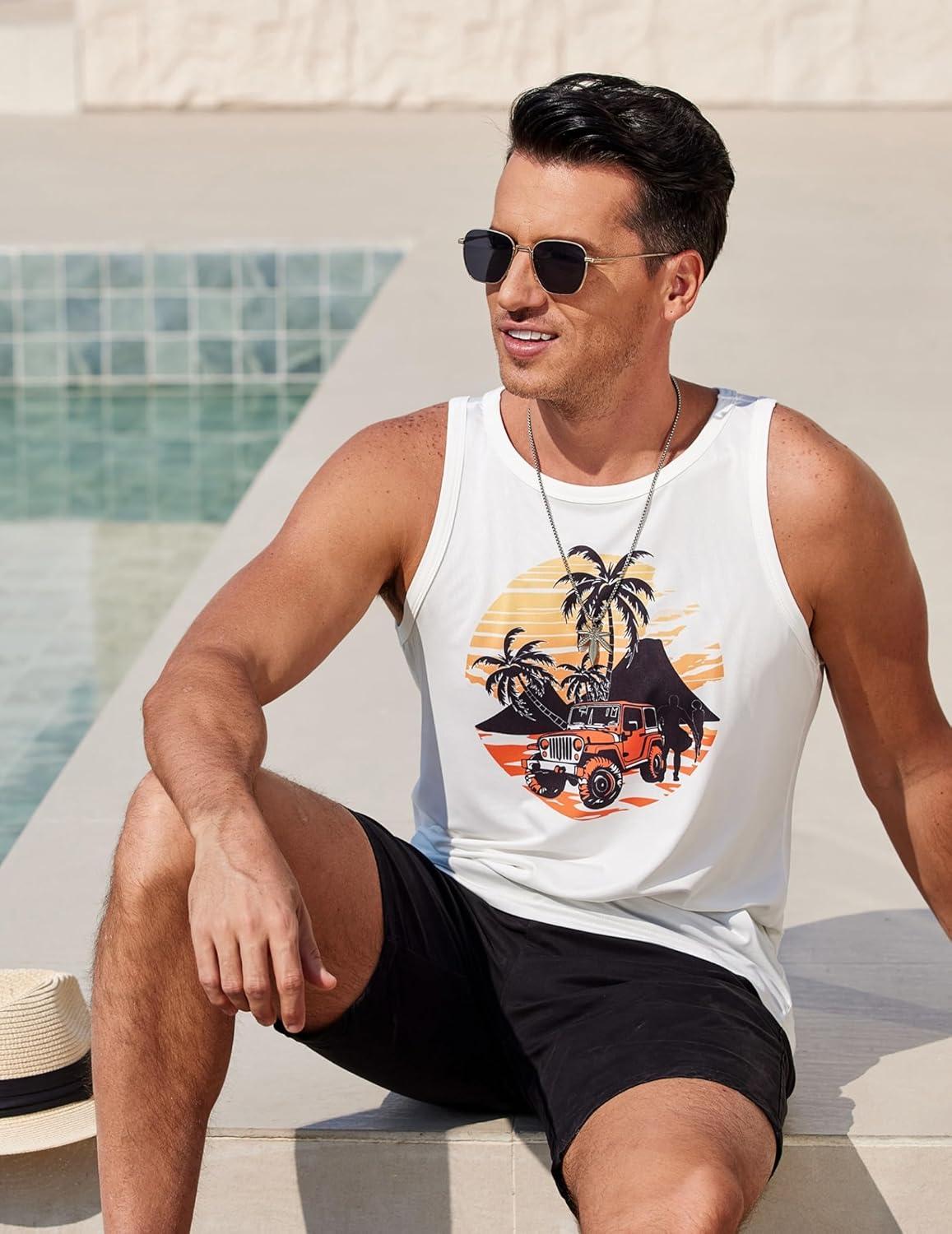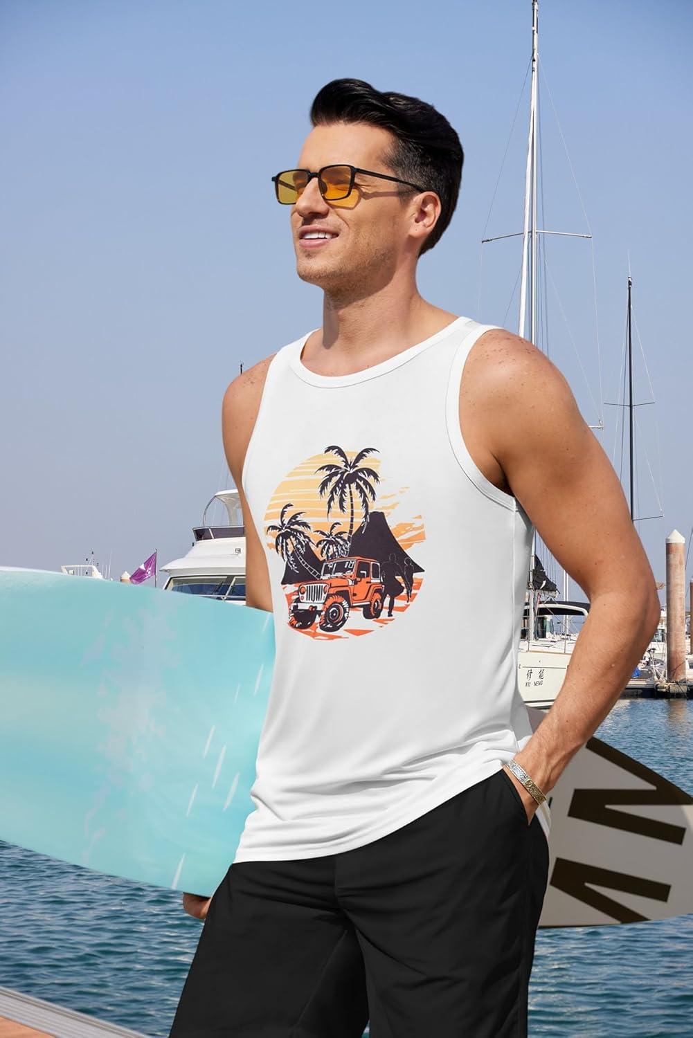 COOFANDY Mens Tank Tops Beach Summer Sleeveless Graphic T Shirts Palm Tree Vacation Quick Dry Muscle Tank(White-car Coconut)