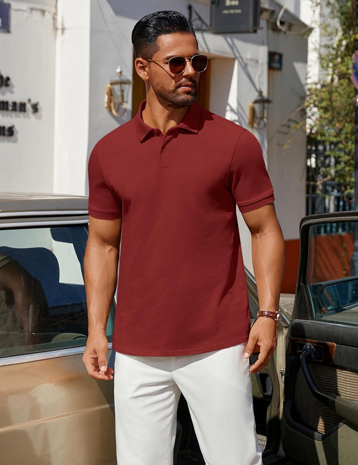 COOFANDY Men’s Polo Shirts 100% Cotton Heavyweight Short Sleeve Button Golf Shirts Classic Pullover Ribbed Collar and Cuffs(Wine Red)