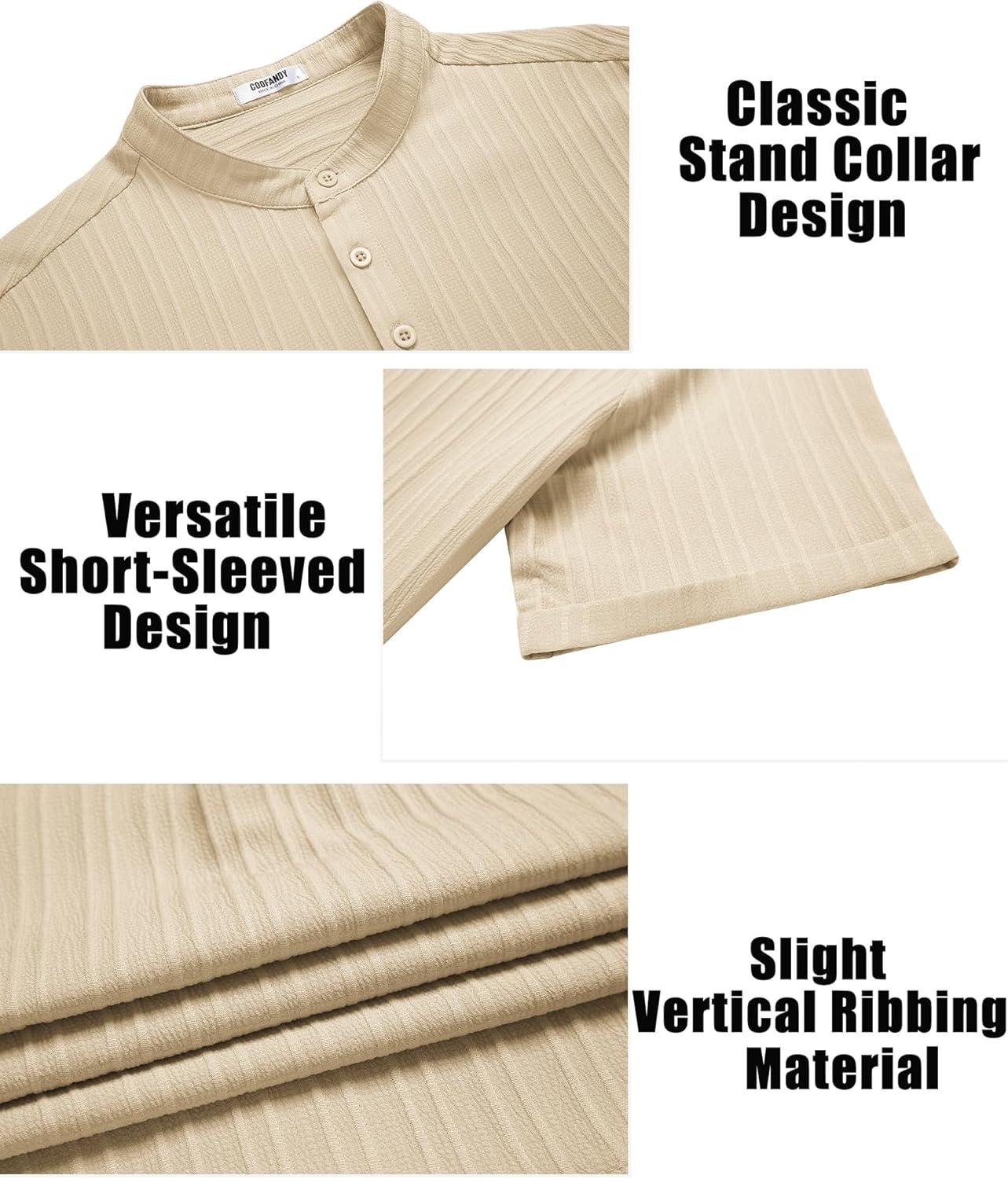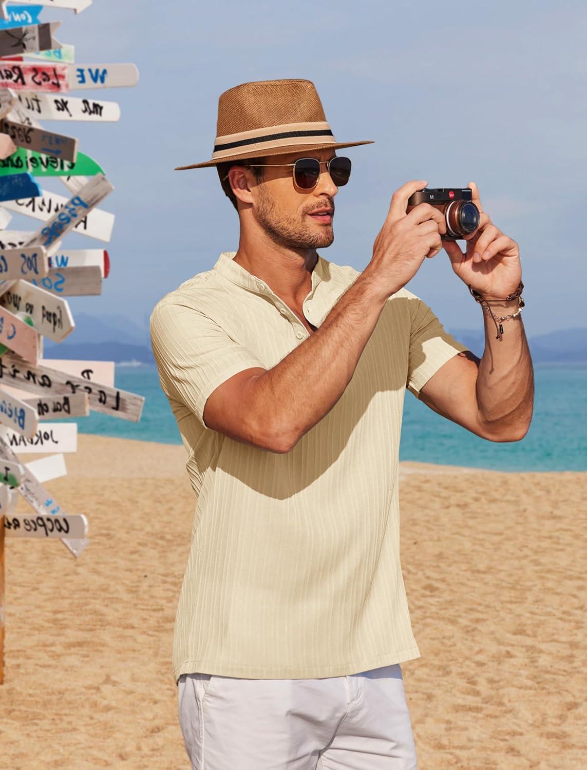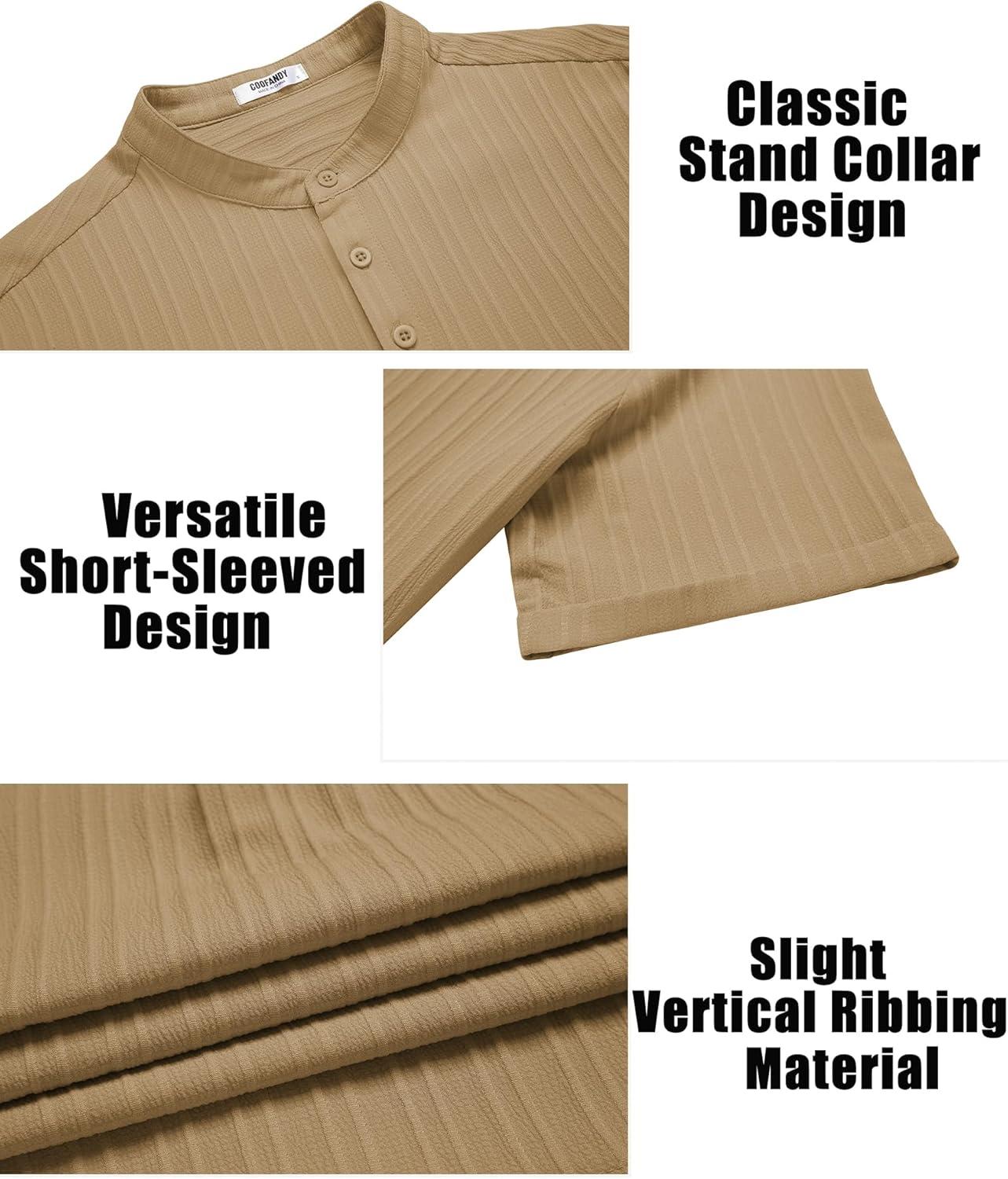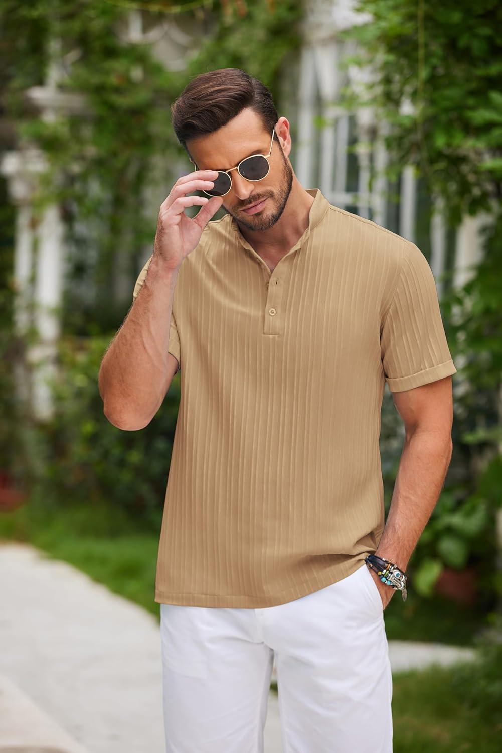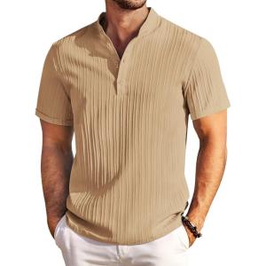 COOFANDY Men Casual Henley Tee Shirt Short Sleeve Band Collar Summer Beach Textured T-Shirt(Khaki)