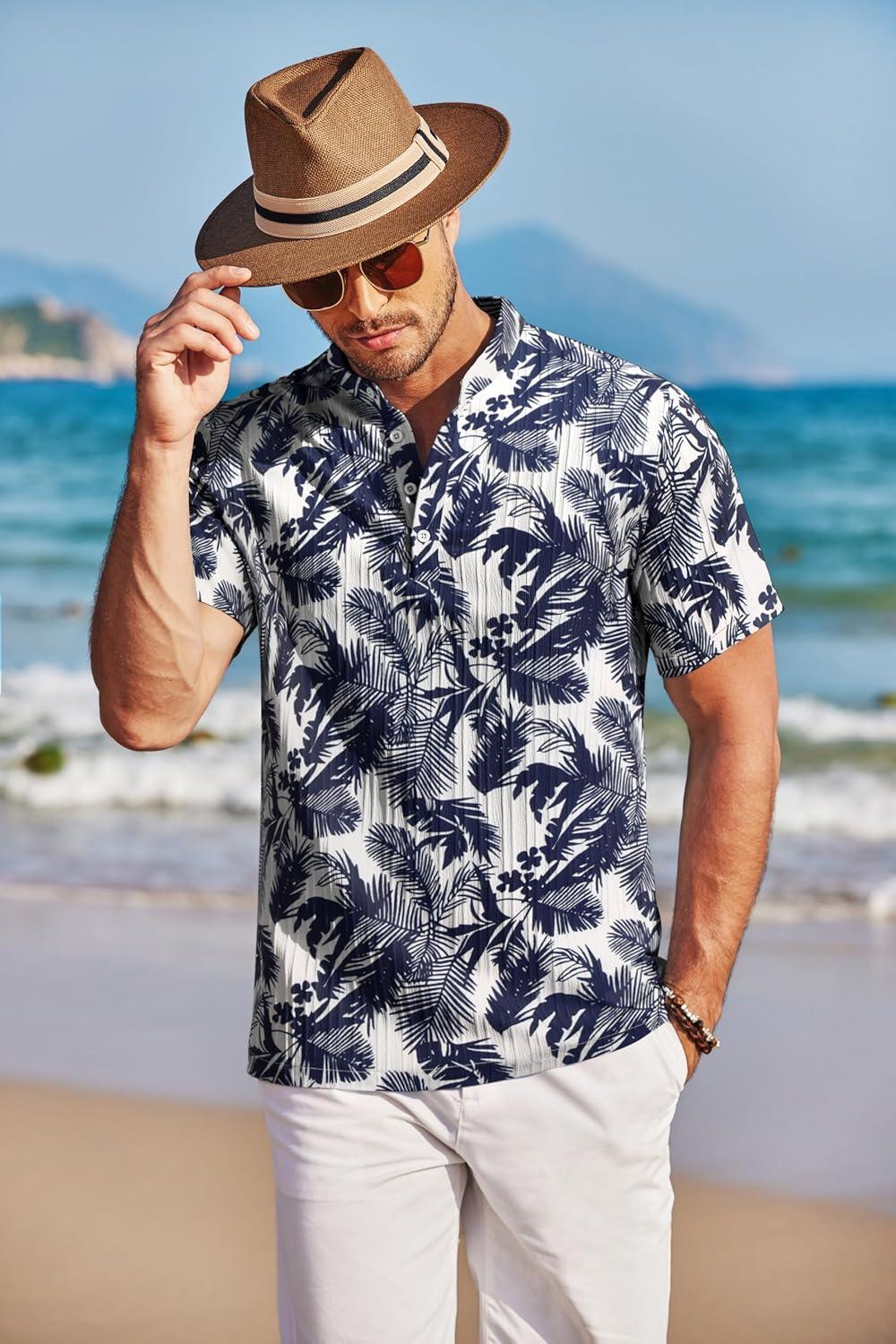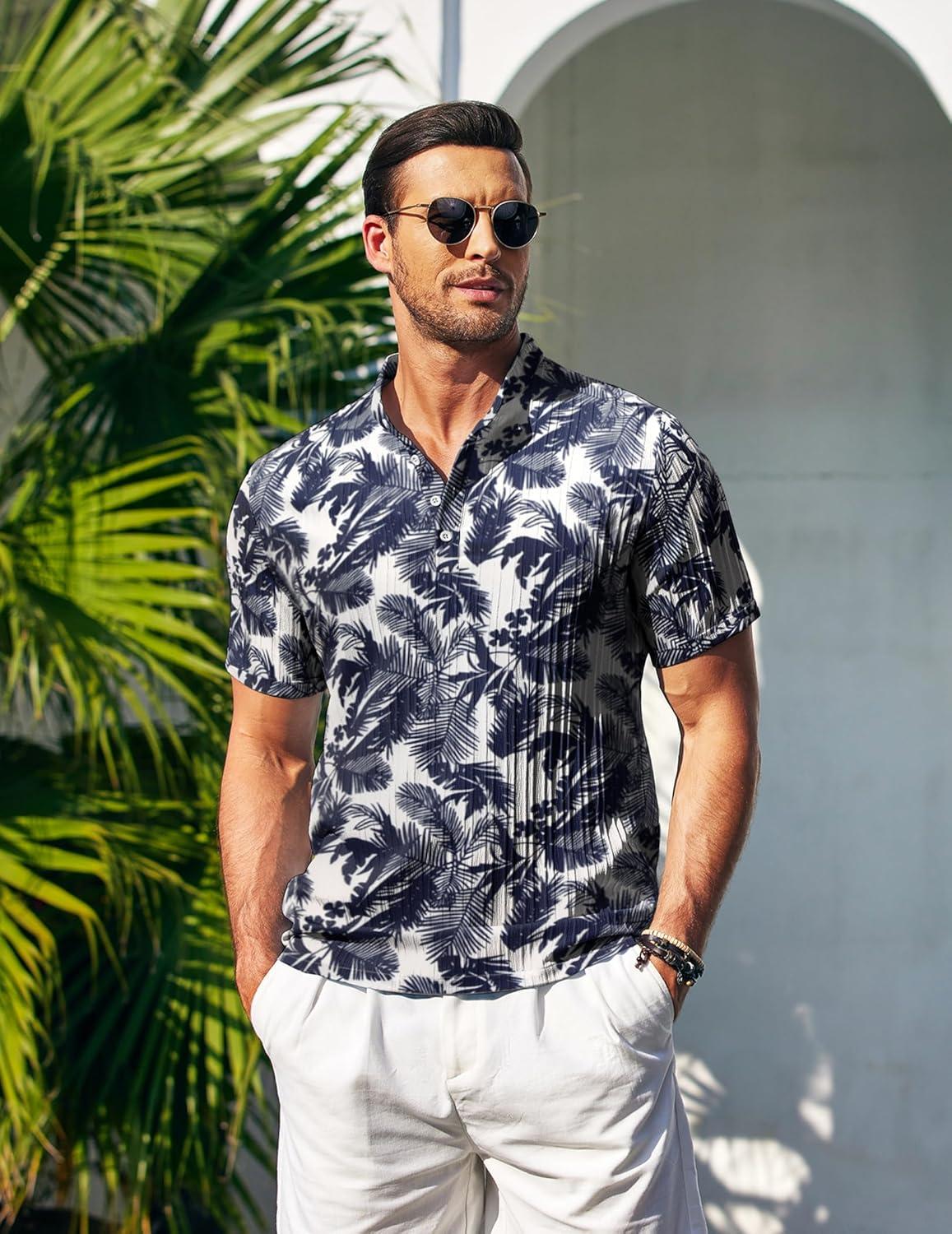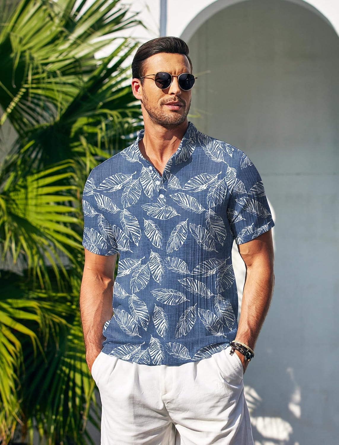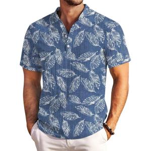 COOFANDY Men Casual Henley Tee Shirt Short Sleeve Band Collar Summer Beach Textured T-Shirt(Deep Blue Plam Leaf)