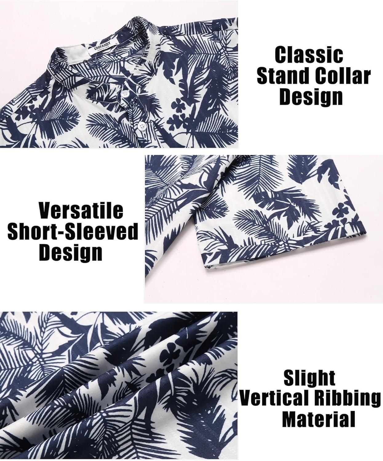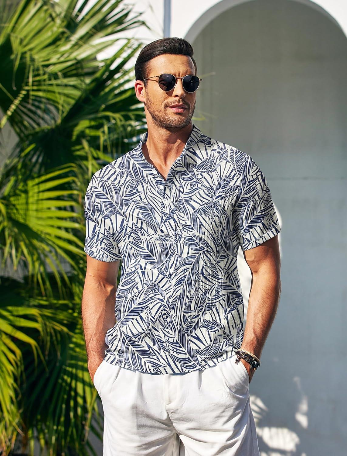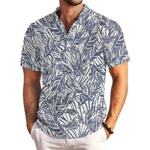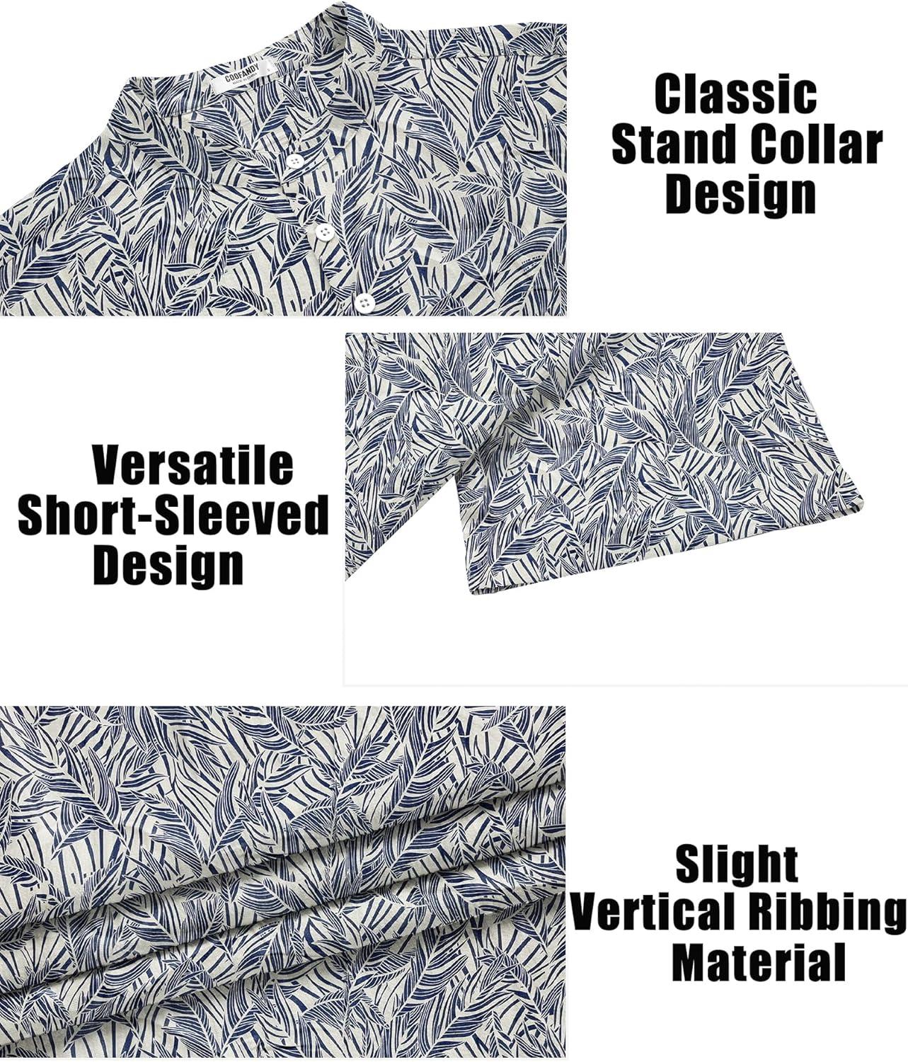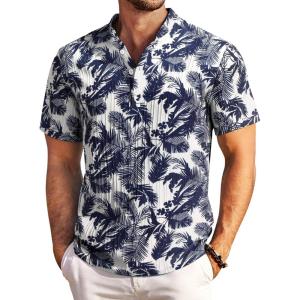 COOFANDY Men Casual Henley Tee Shirt Short Sleeve Band Collar Summer Beach Textured T-Shirt(Deep Blue Plam Leaf)