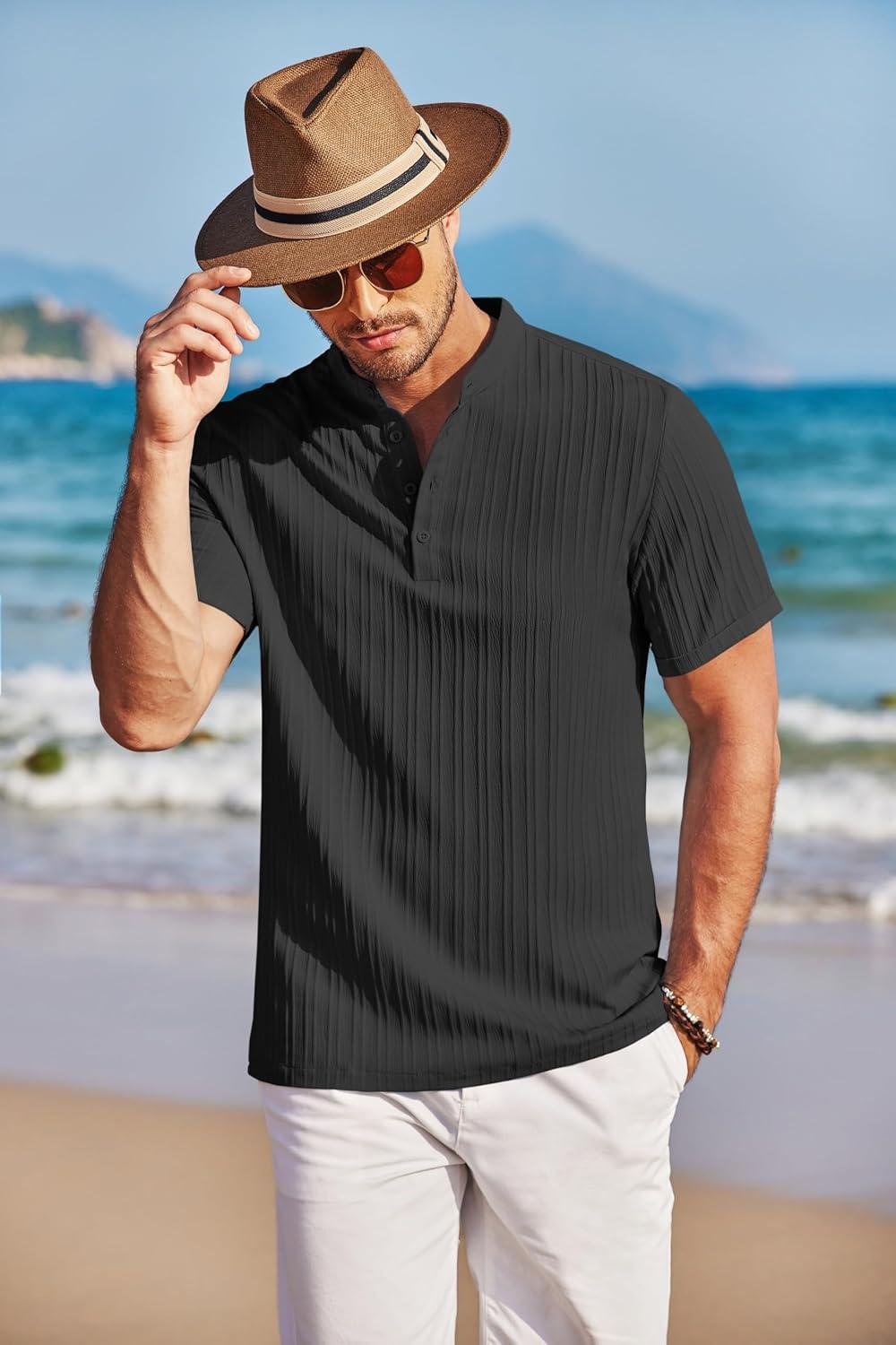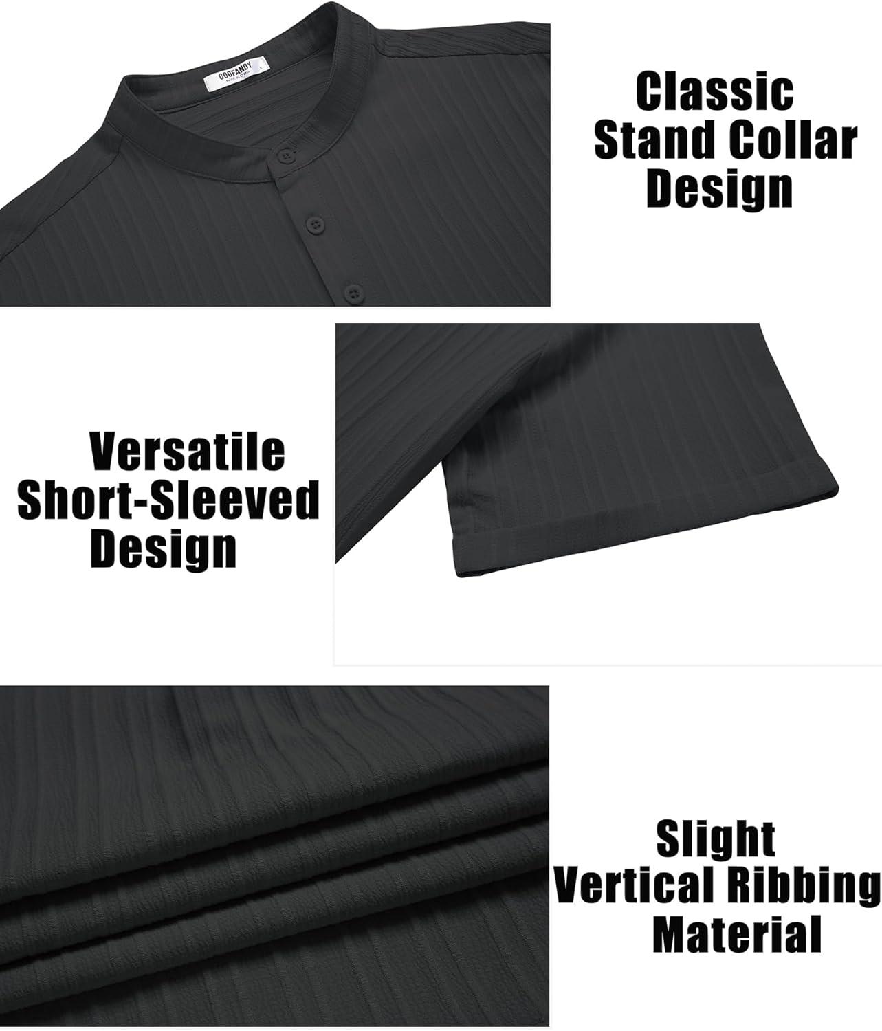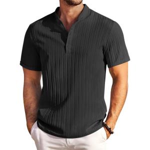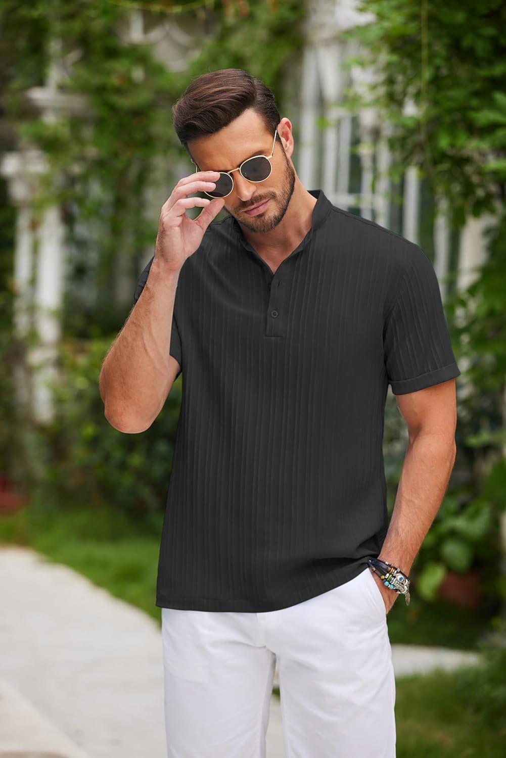 COOFANDY Men Casual Henley Tee Shirt Short Sleeve Band Collar Summer Beach Textured T-Shirt(Black)