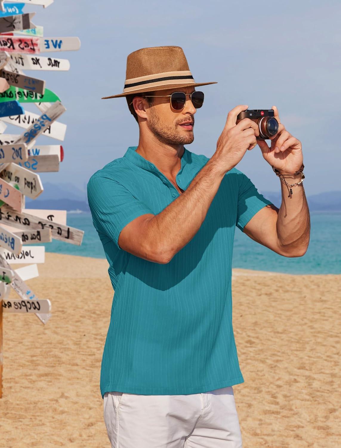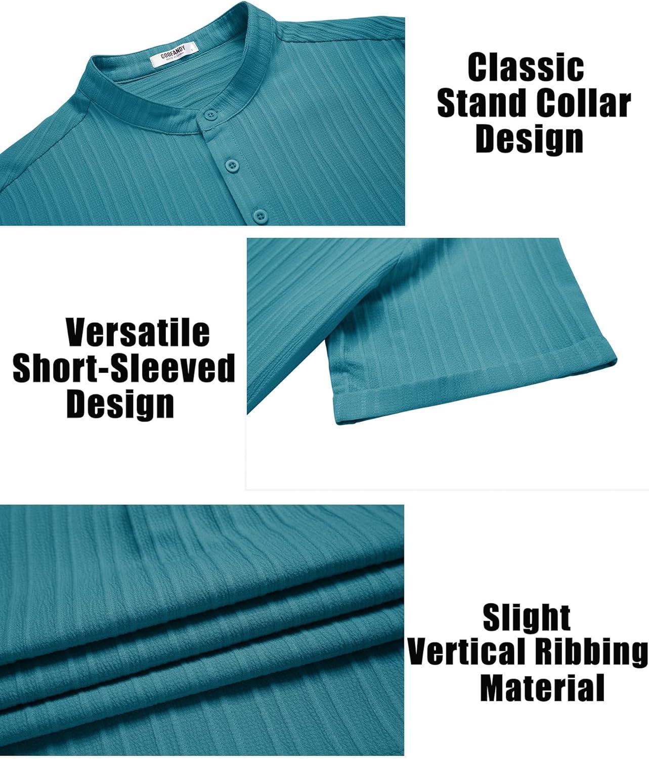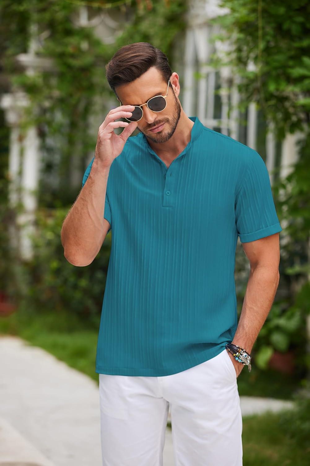 COOFANDY Men Casual Henley Tee Shirt Short Sleeve Band Collar Summer Beach Textured T-Shirt(Blue Green)