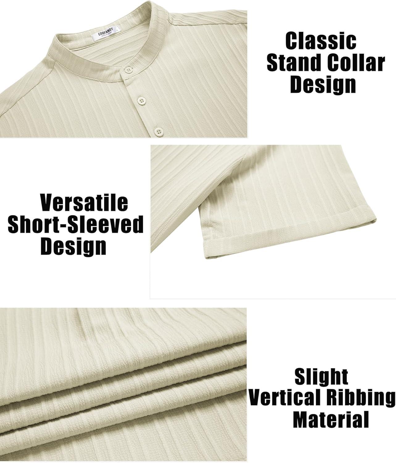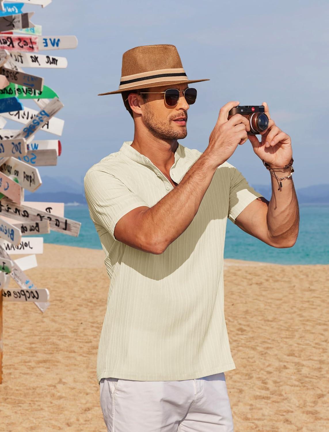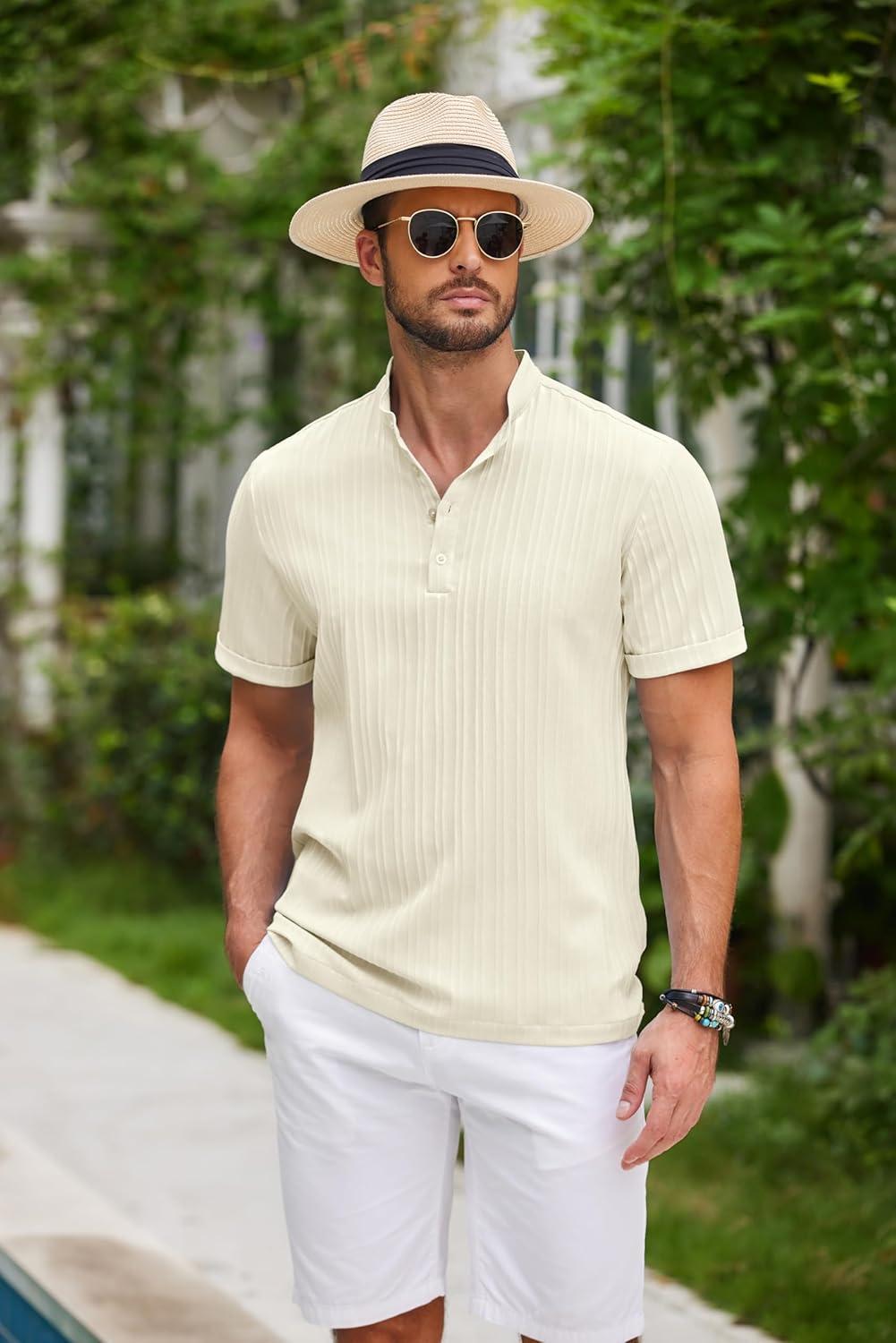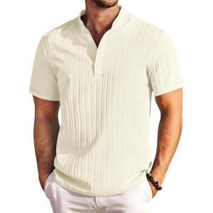 COOFANDY Men Casual Henley Tee Shirt Short Sleeve Band Collar Summer Beach Textured T-Shirt(Cream Color)