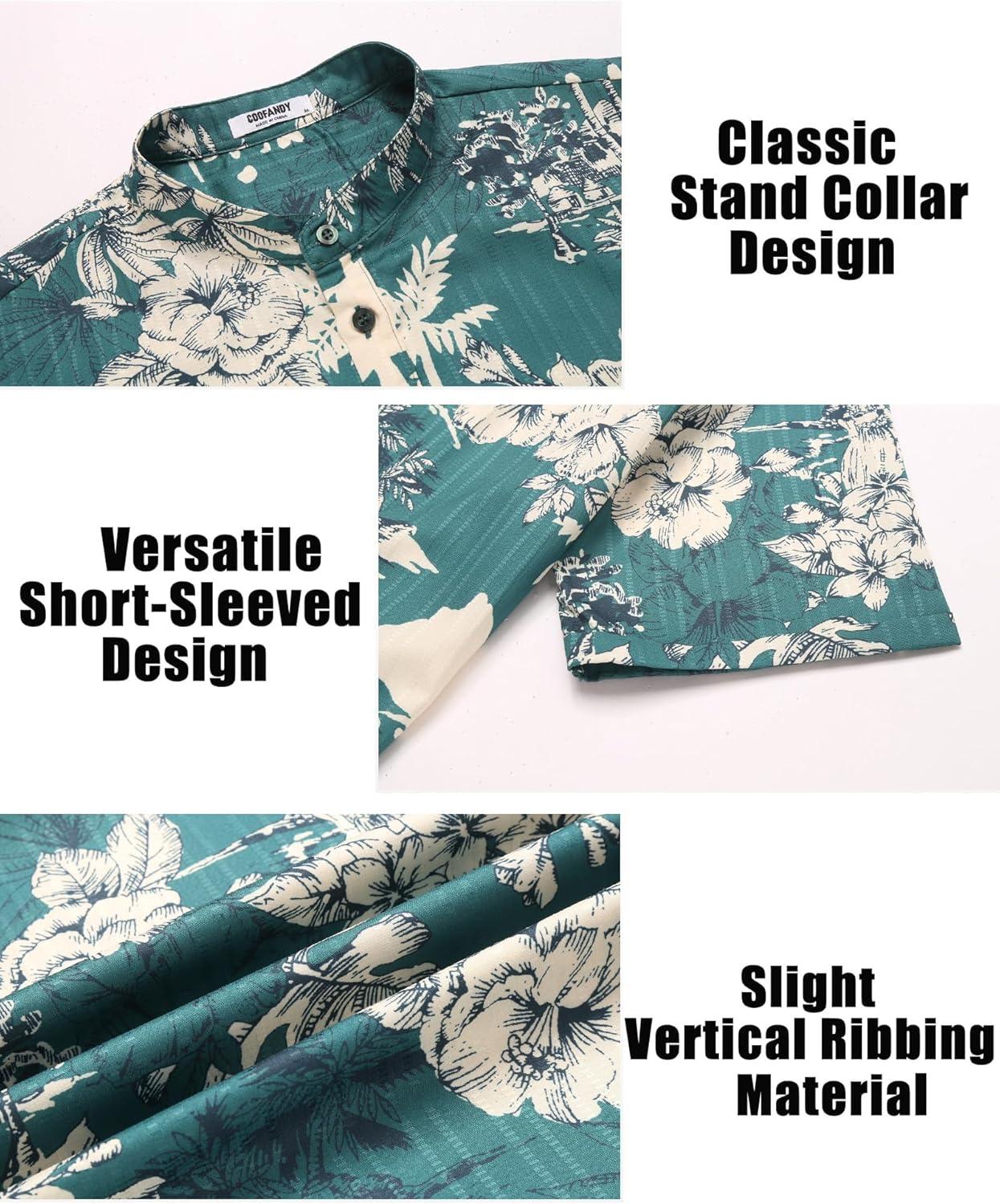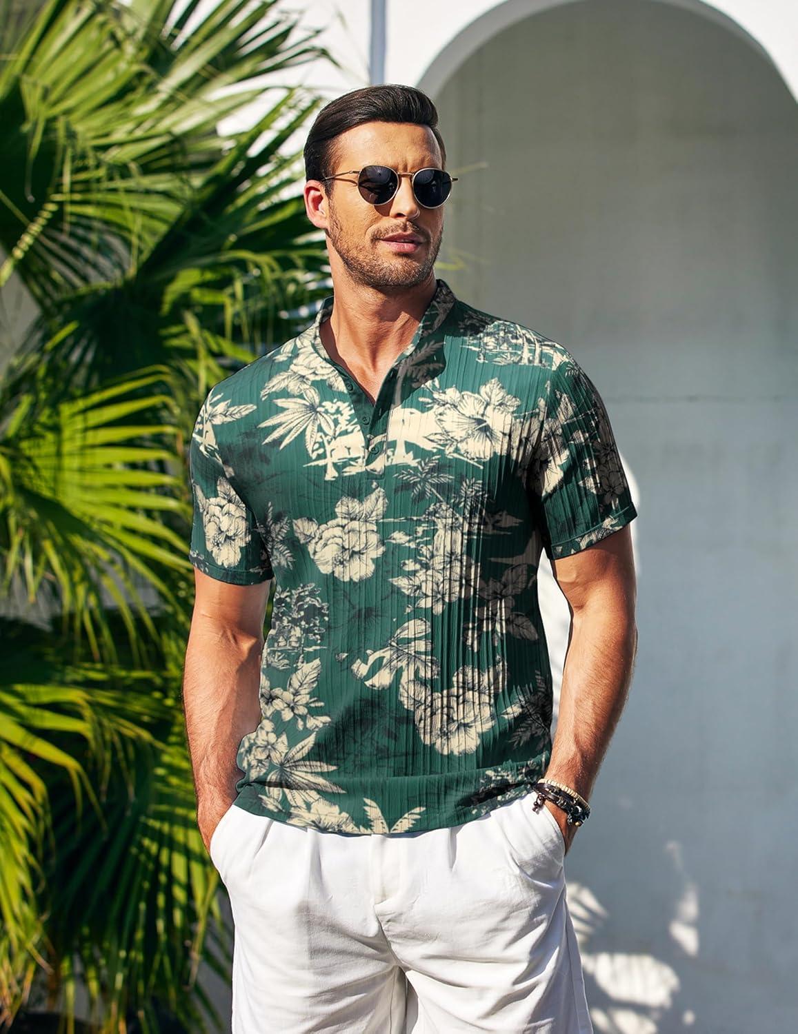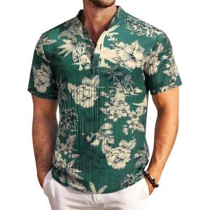 COOFANDY Men Casual Henley Tee Shirt Short Sleeve Band Collar Summer Beach Textured T-Shirt(Dark Green Beige Coconut Leaves)