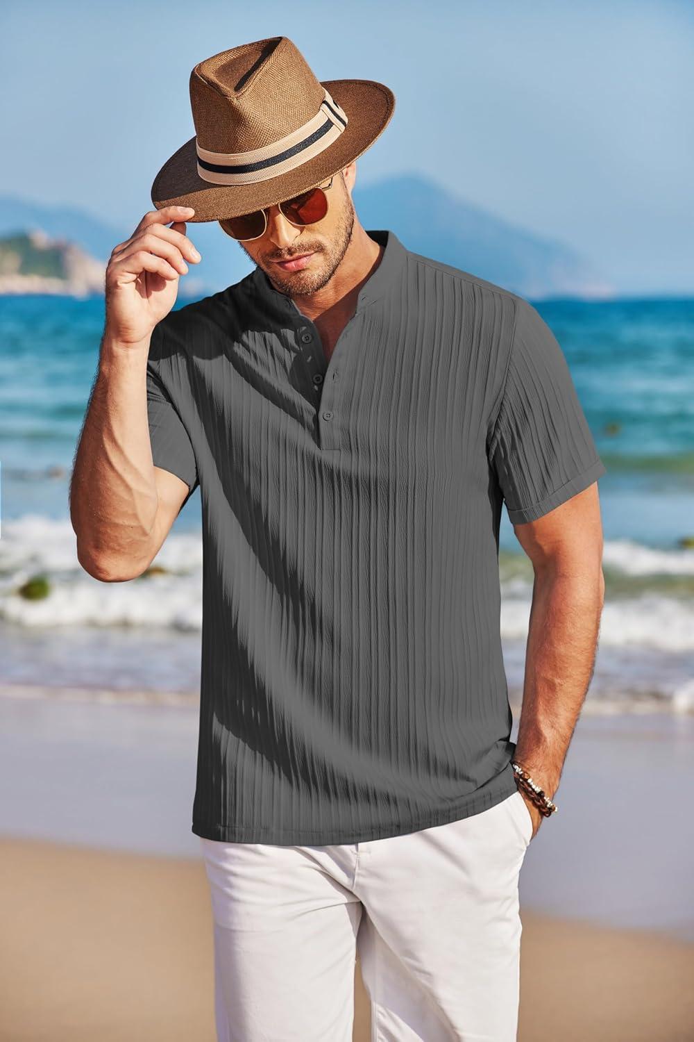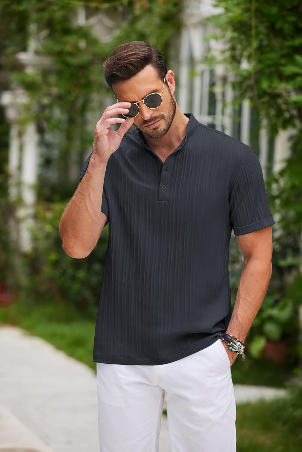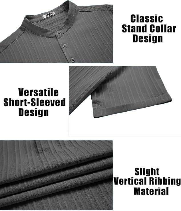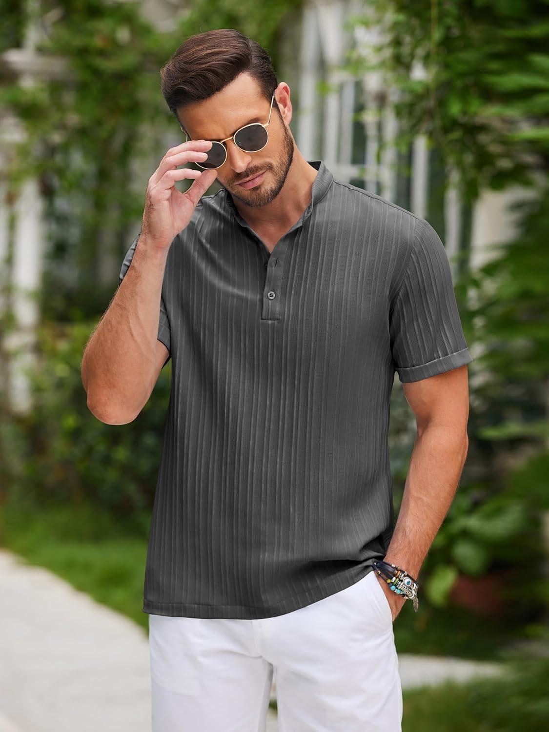 COOFANDY Men Casual Henley Tee Shirt Short Sleeve Band Collar Summer Beach Textured T-Shirt(Dark Grey)