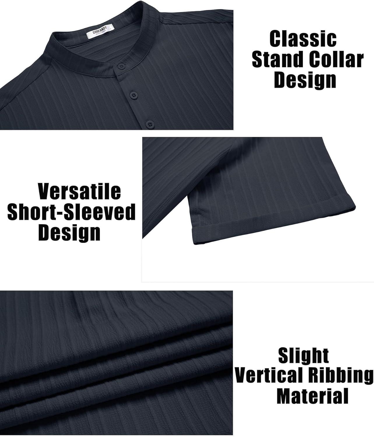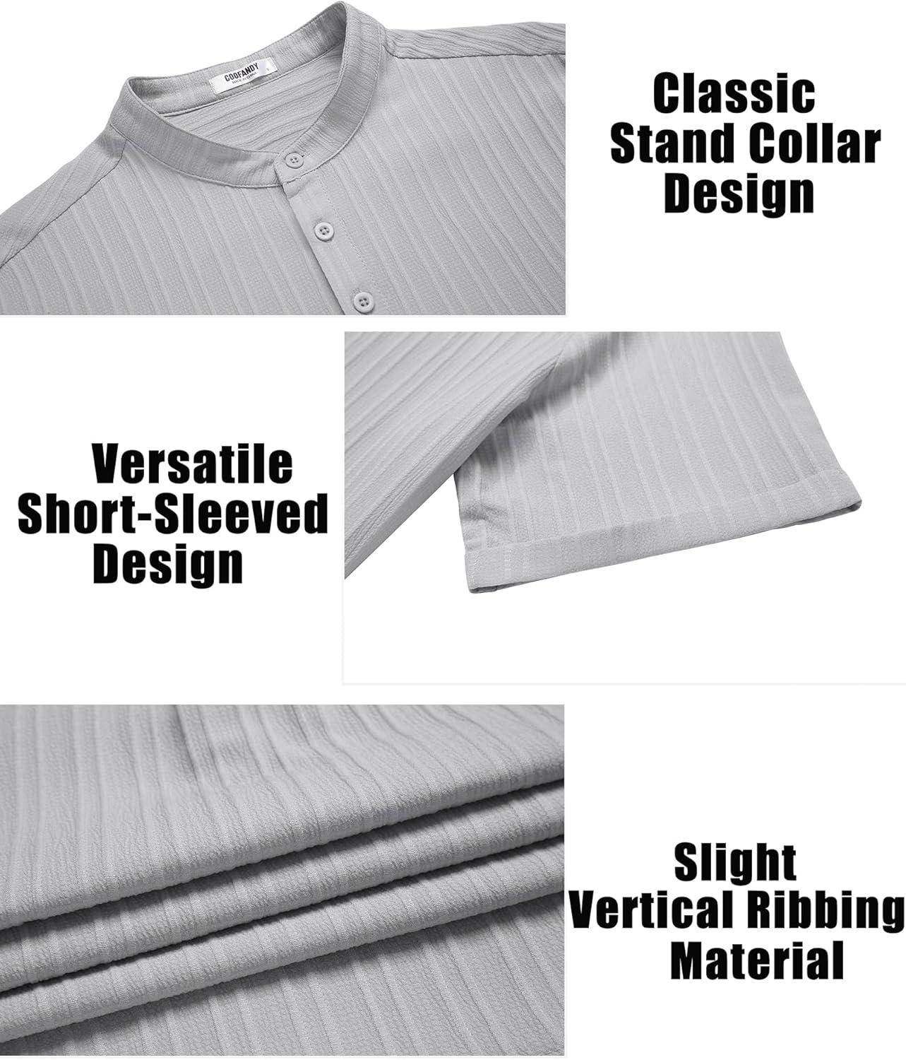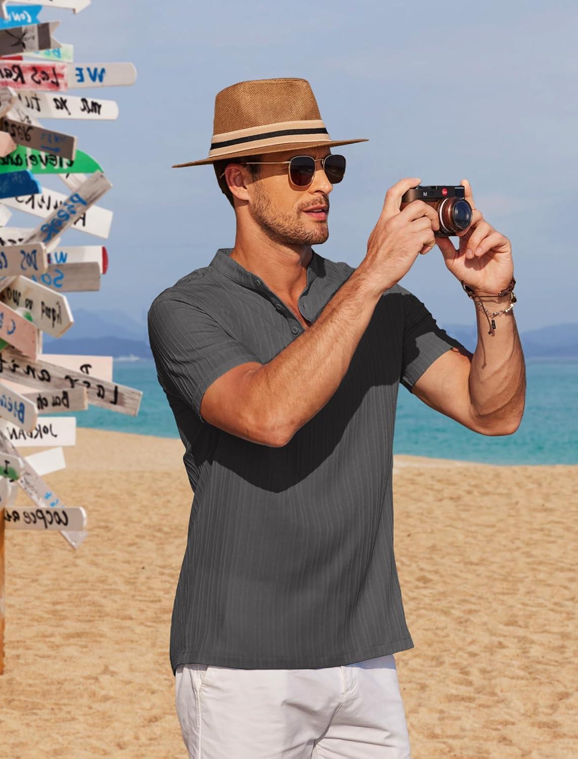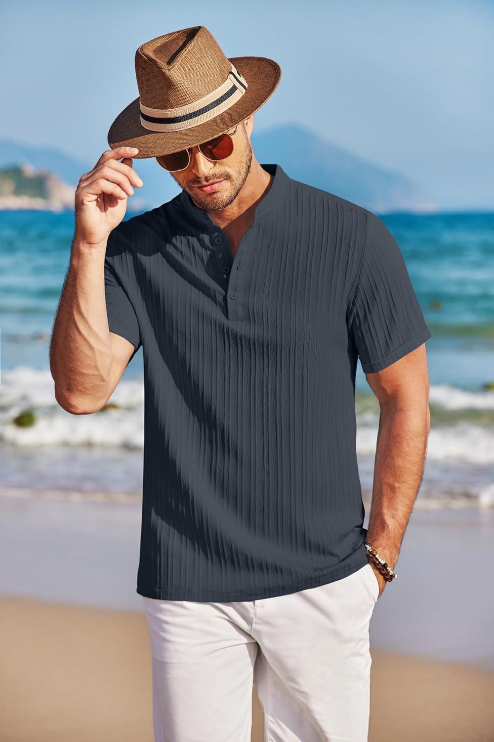 COOFANDY Men Casual Henley Tee Shirt Short Sleeve Band Collar Summer Beach Textured T-Shirt(Dark Grey)