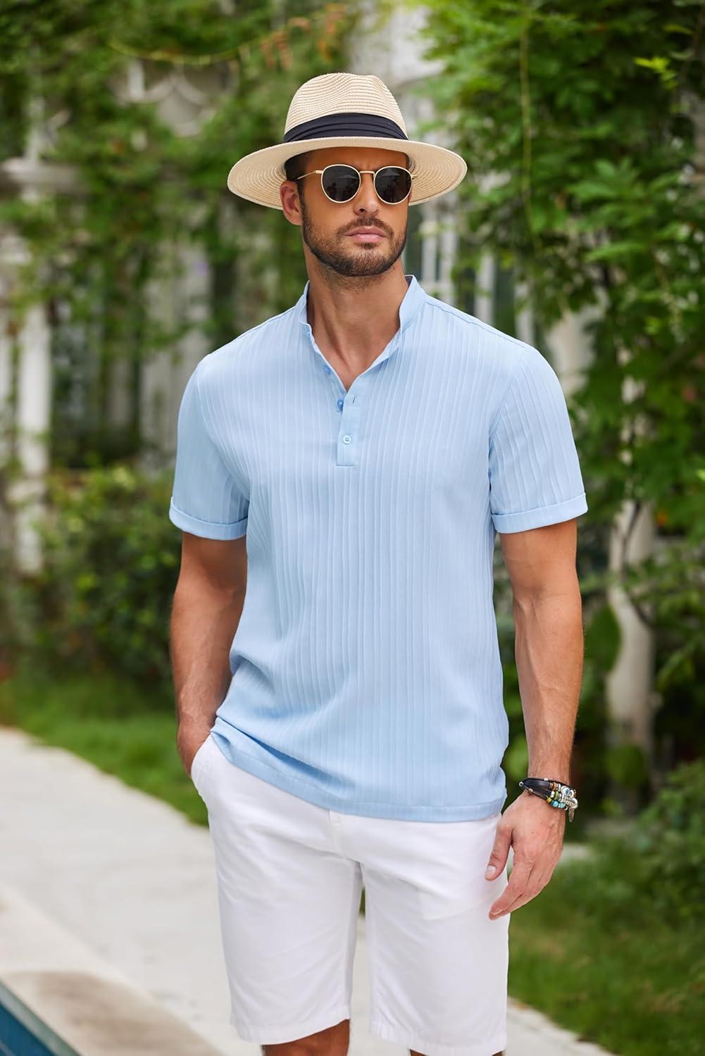 COOFANDY Men Casual Henley Tee Shirt Short Sleeve Band Collar Summer Beach Textured T-Shirt(Light Blue)