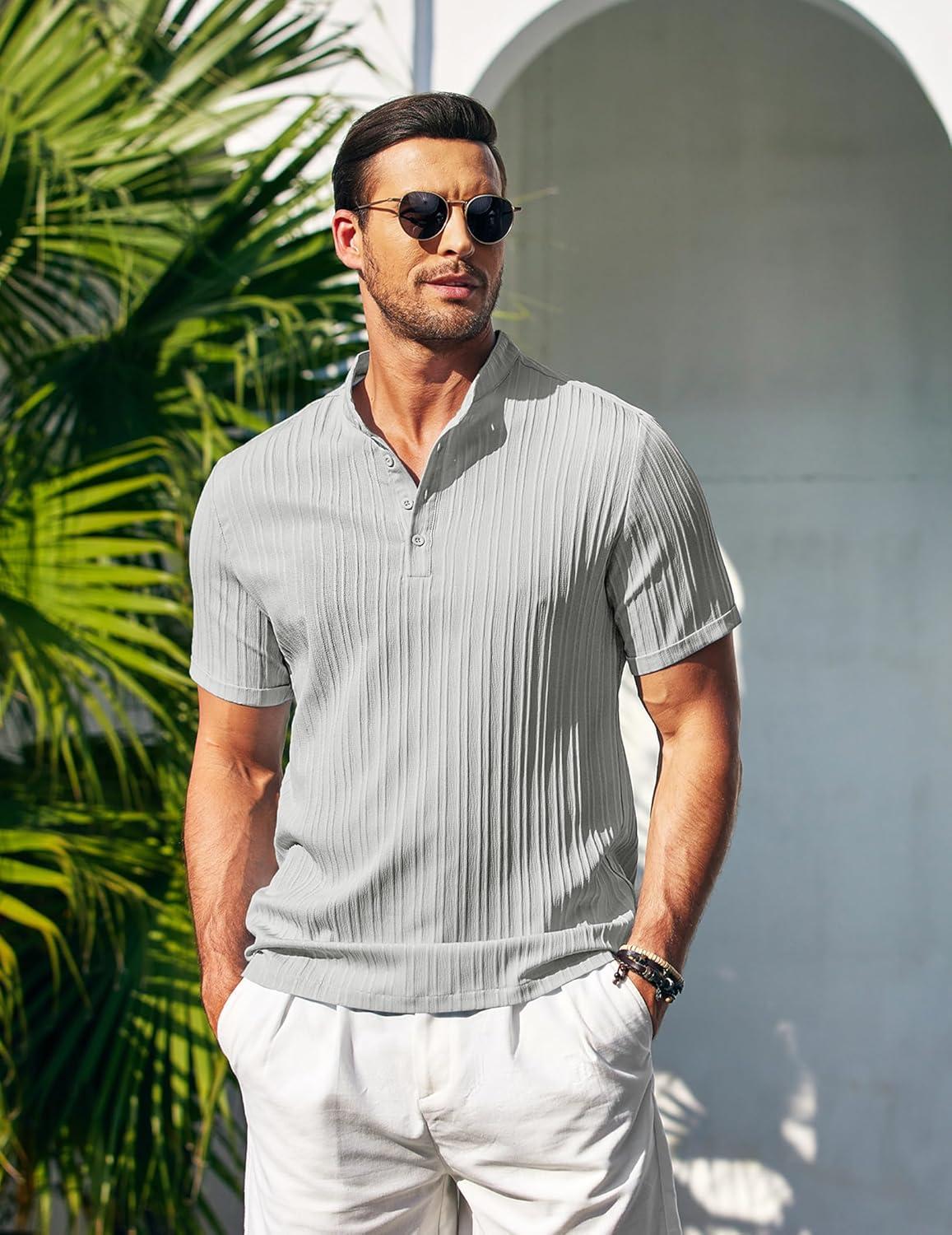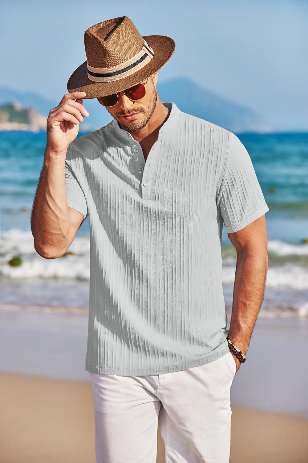 COOFANDY Men Casual Henley Tee Shirt Short Sleeve Band Collar Summer Beach Textured T-Shirt(Light Grey)
