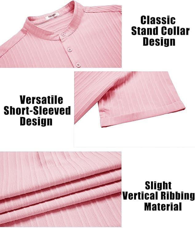 COOFANDY Men Casual Henley Tee Shirt Short Sleeve Band Collar Summer Beach Textured T-Shirt(Pink)