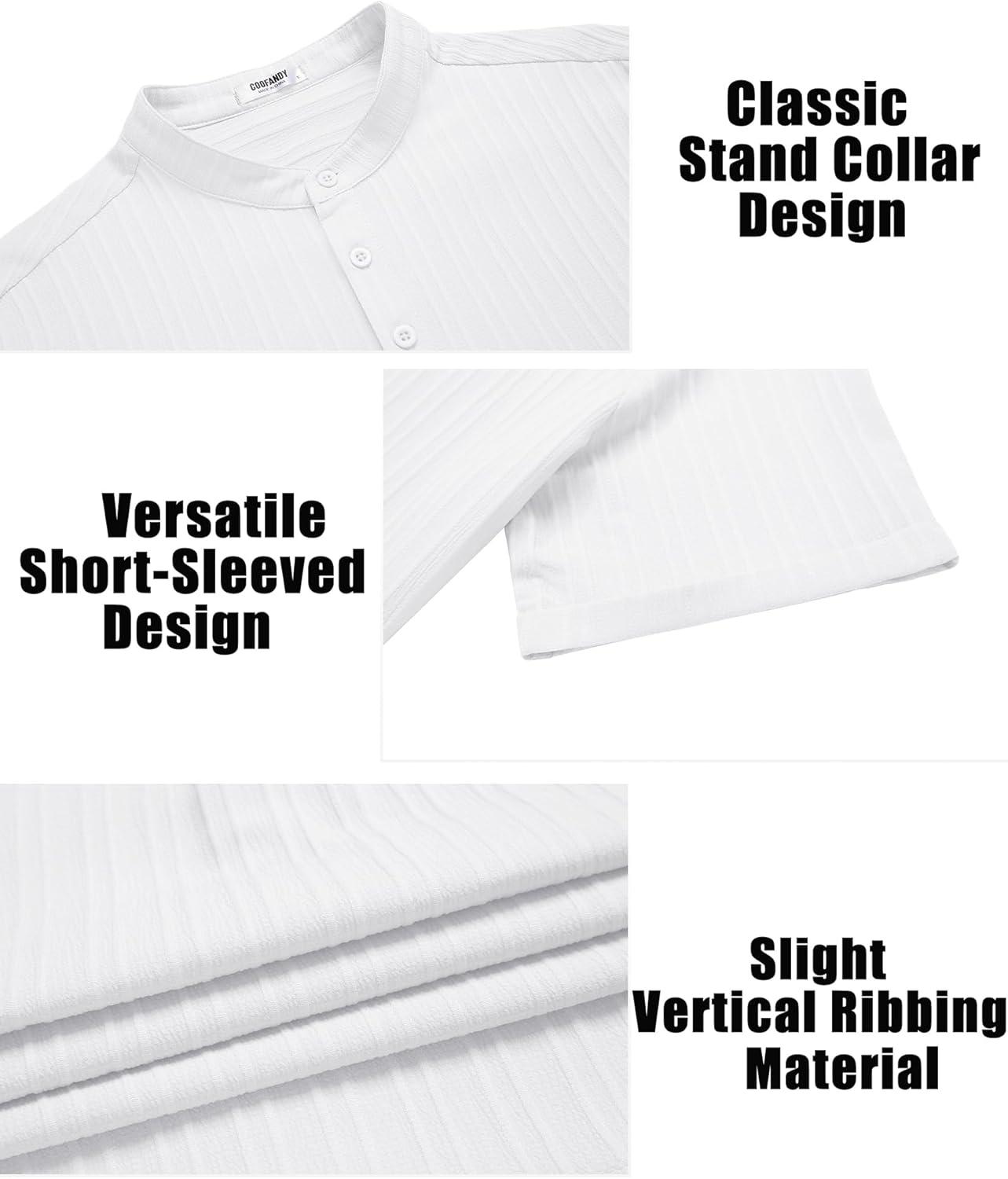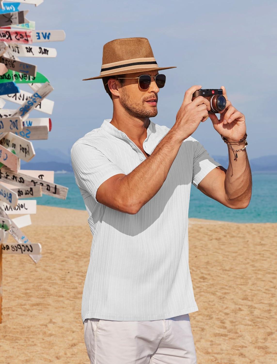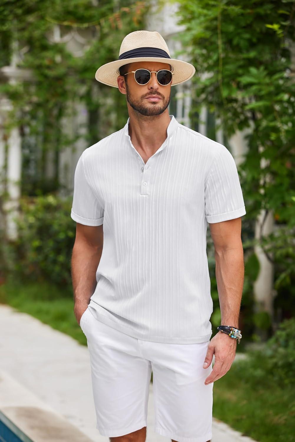 COOFANDY Men Casual Henley Tee Shirt Short Sleeve Band Collar Summer Beach Textured T-Shirt(White)