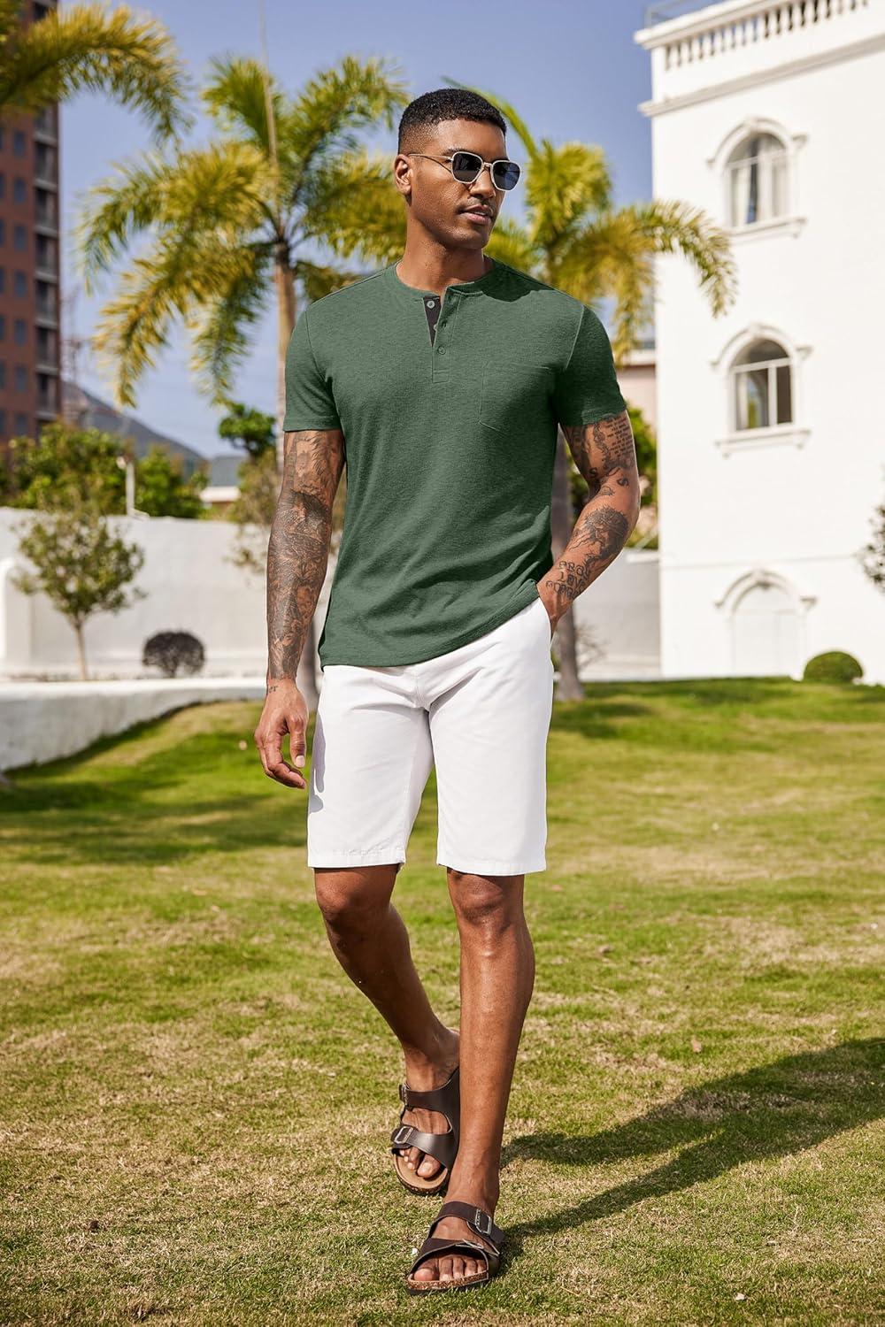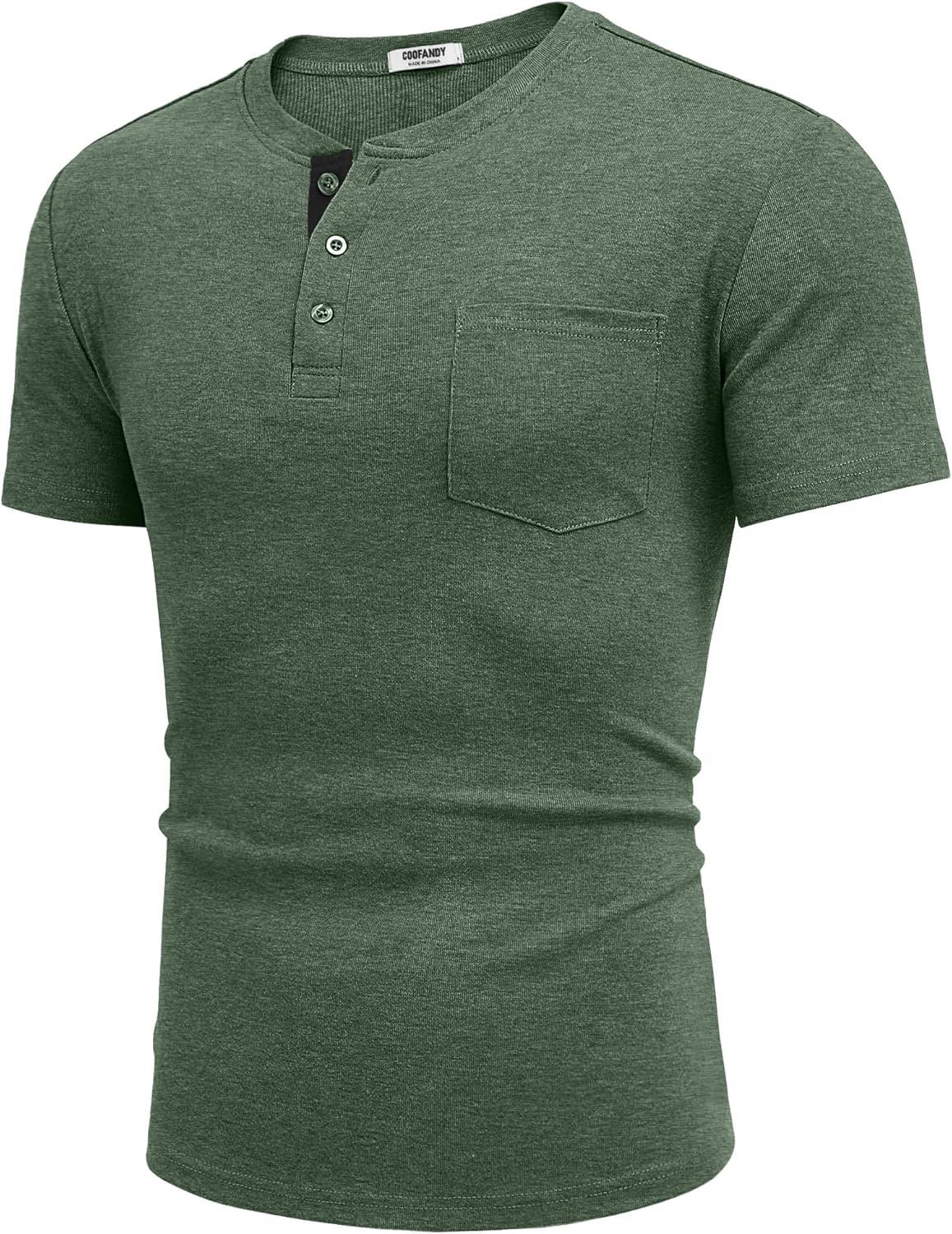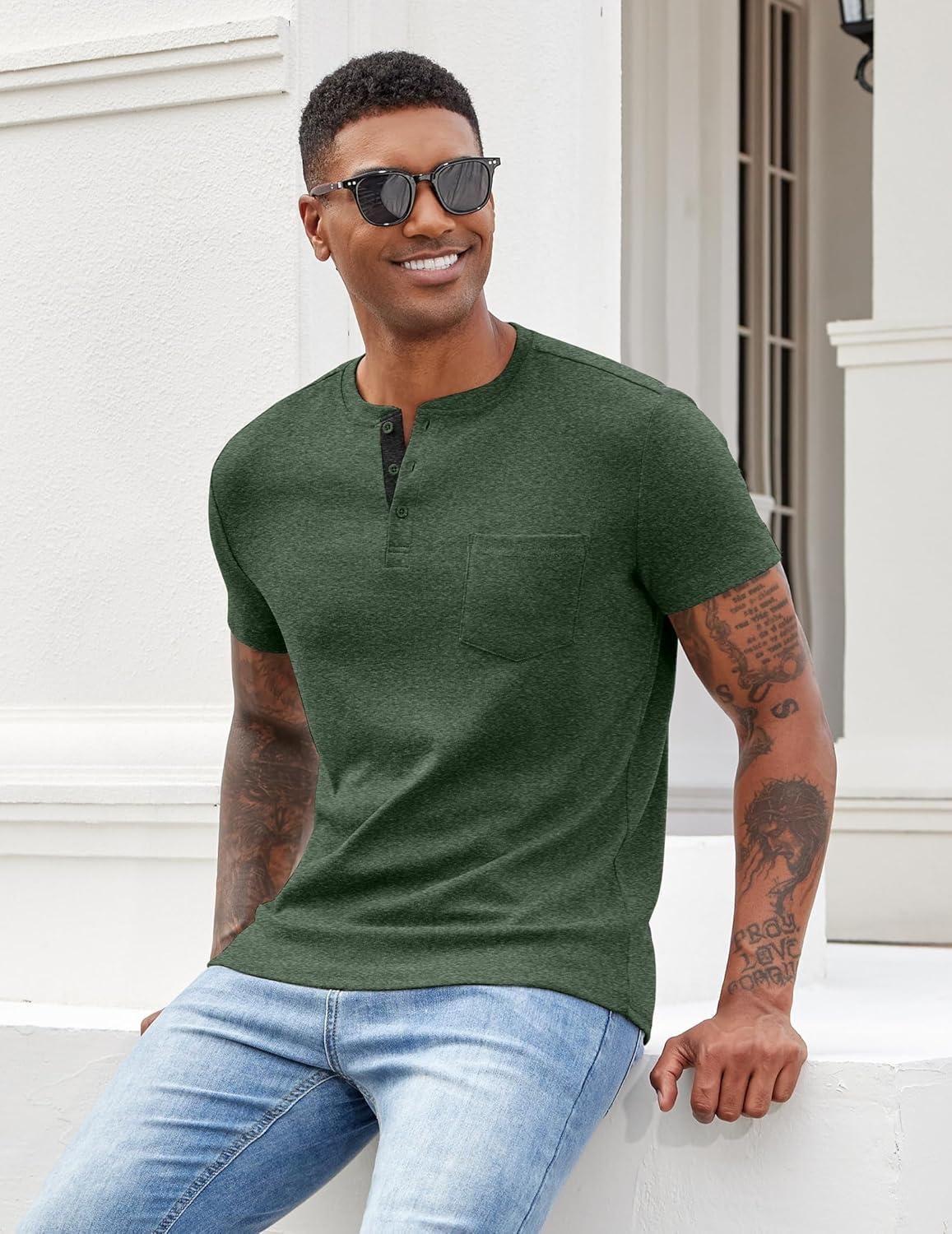 COOFANDY Men Casual Henley Tee Shirt Short Sleeve Band Collar Summer Beach Textured T-Shirt(Army Green)