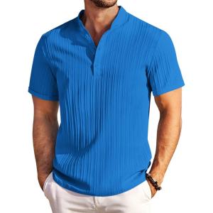 COOFANDY Men Casual Henley Tee Shirt Short Sleeve Band Collar Summer Beach Textured T-Shirt(Blue)