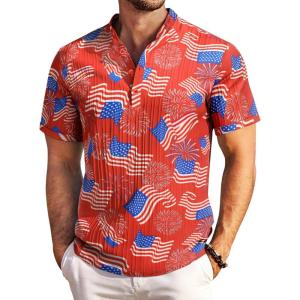 COOFANDY Men Casual Henley Tee Shirt Short Sleeve Band Collar Summer Beach Textured T-Shirt(Red Flag)