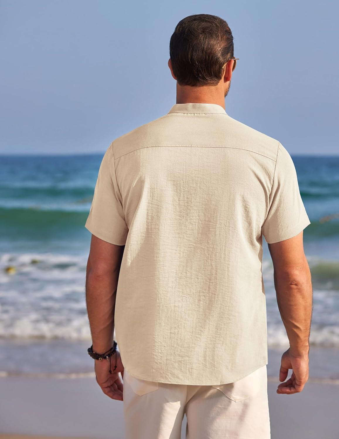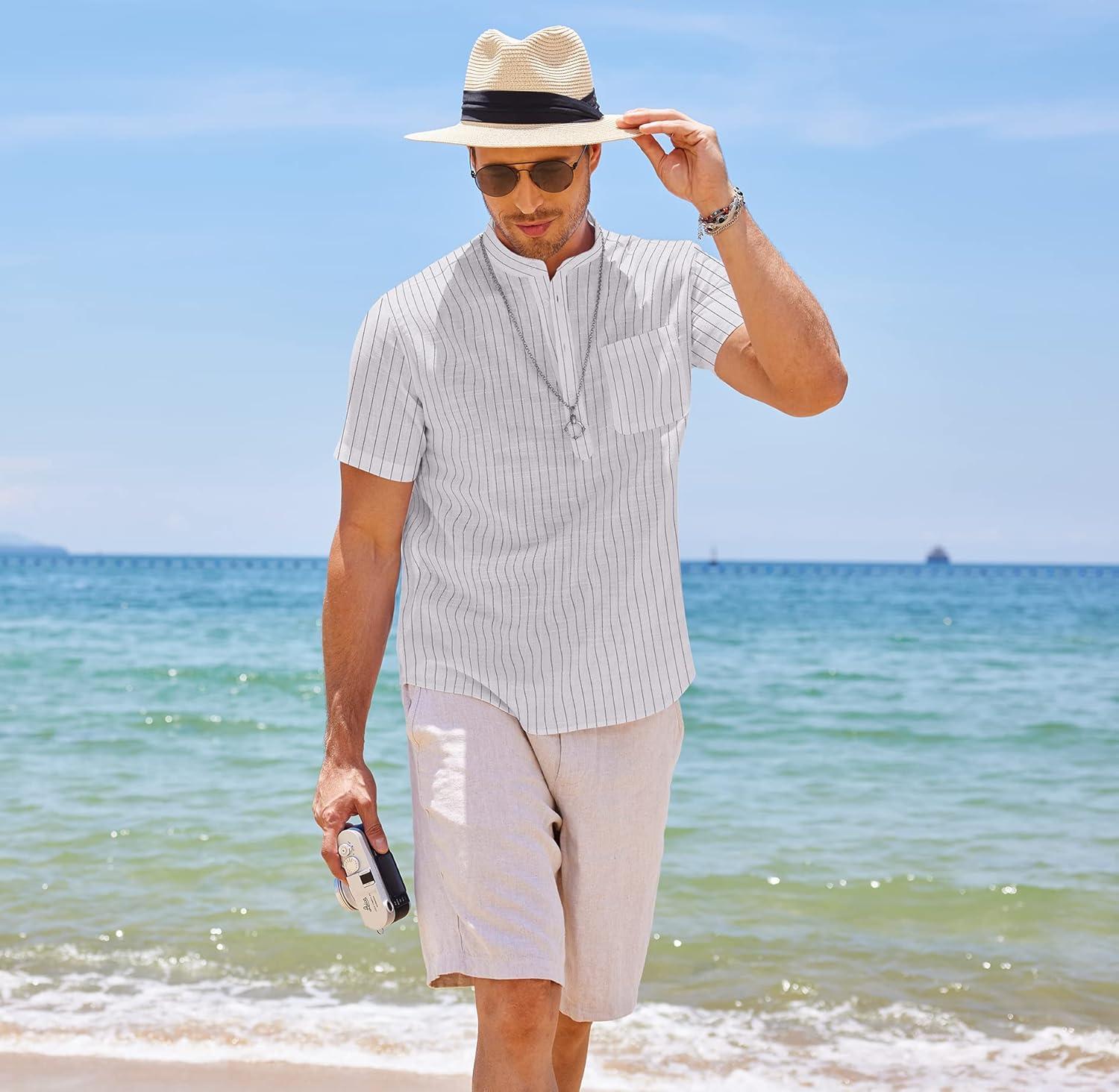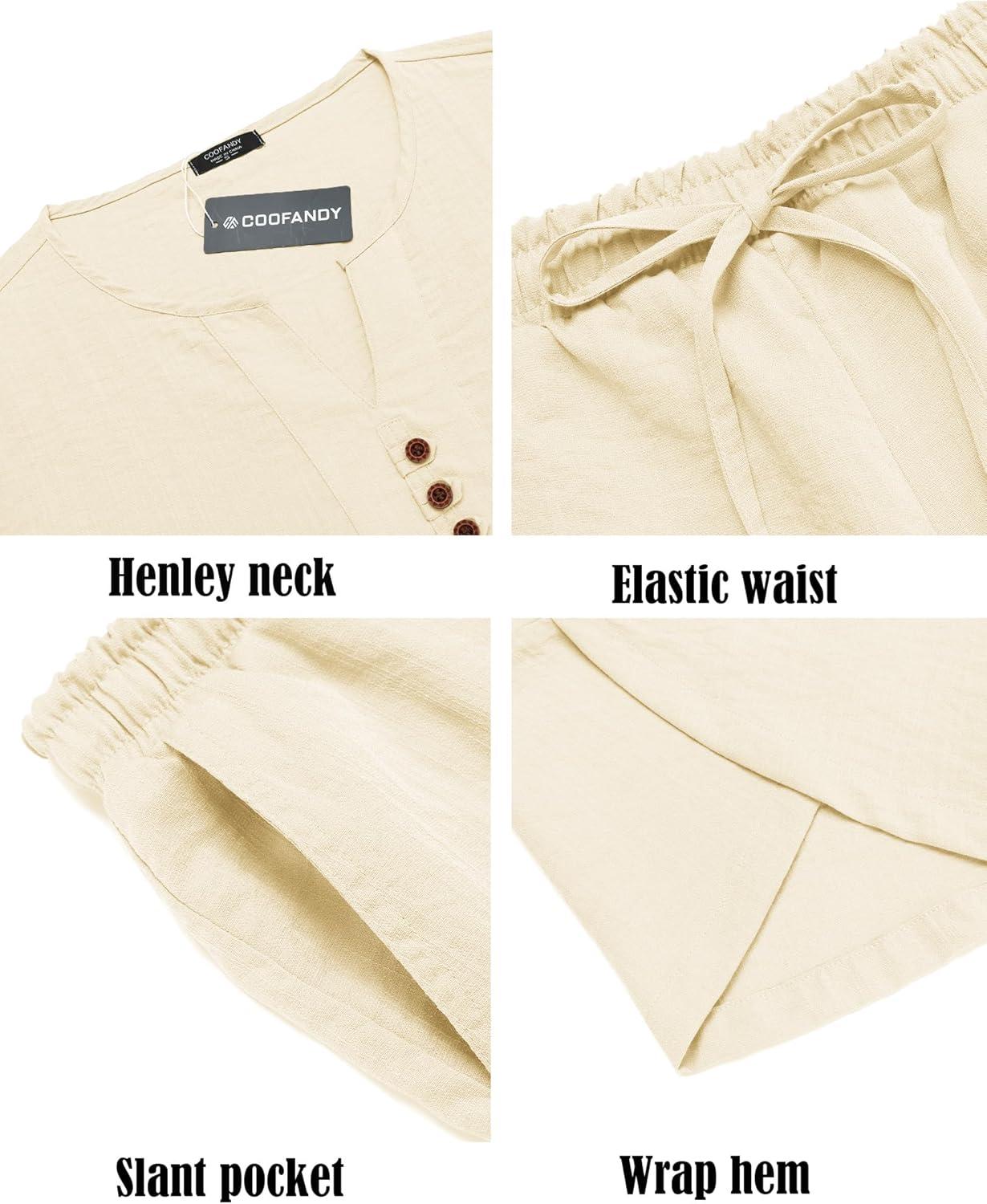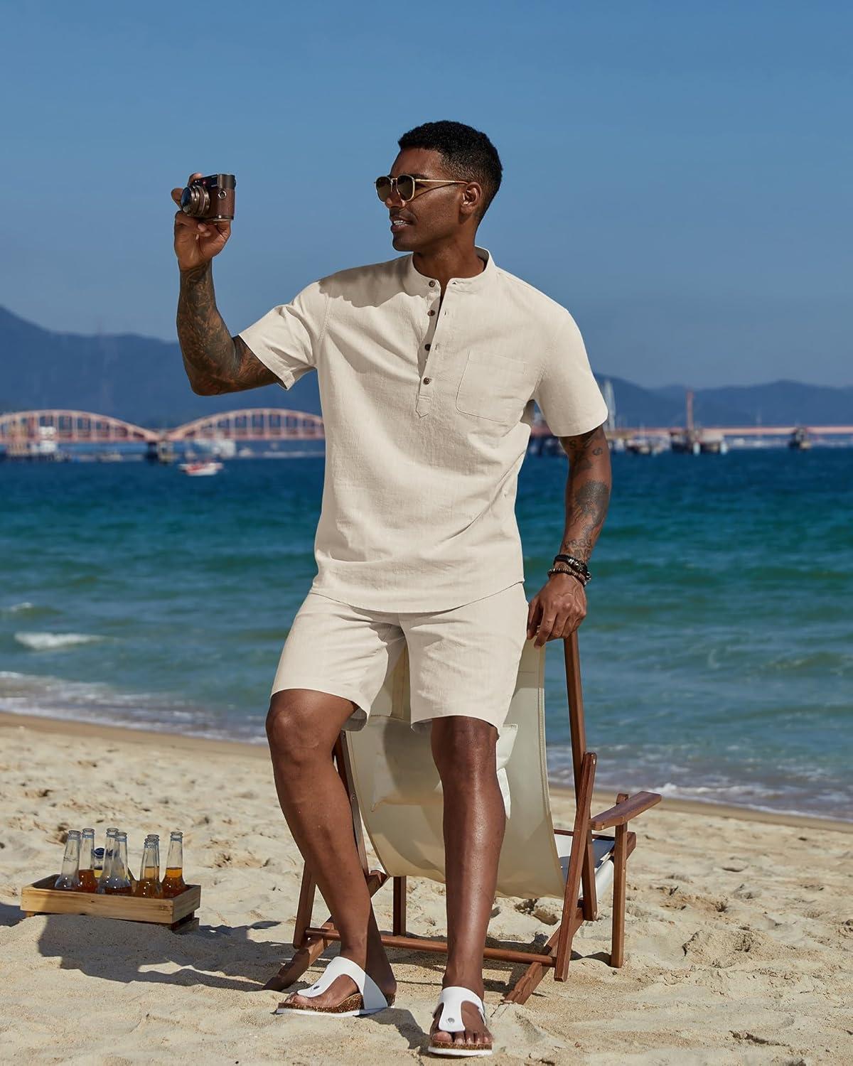 COOFANDY Men’s 2 Piece Cotton Linen Sets Summer Beach Outfits Casual Short Sleeve Henley Shirts and Vacation Shorts(Beige)