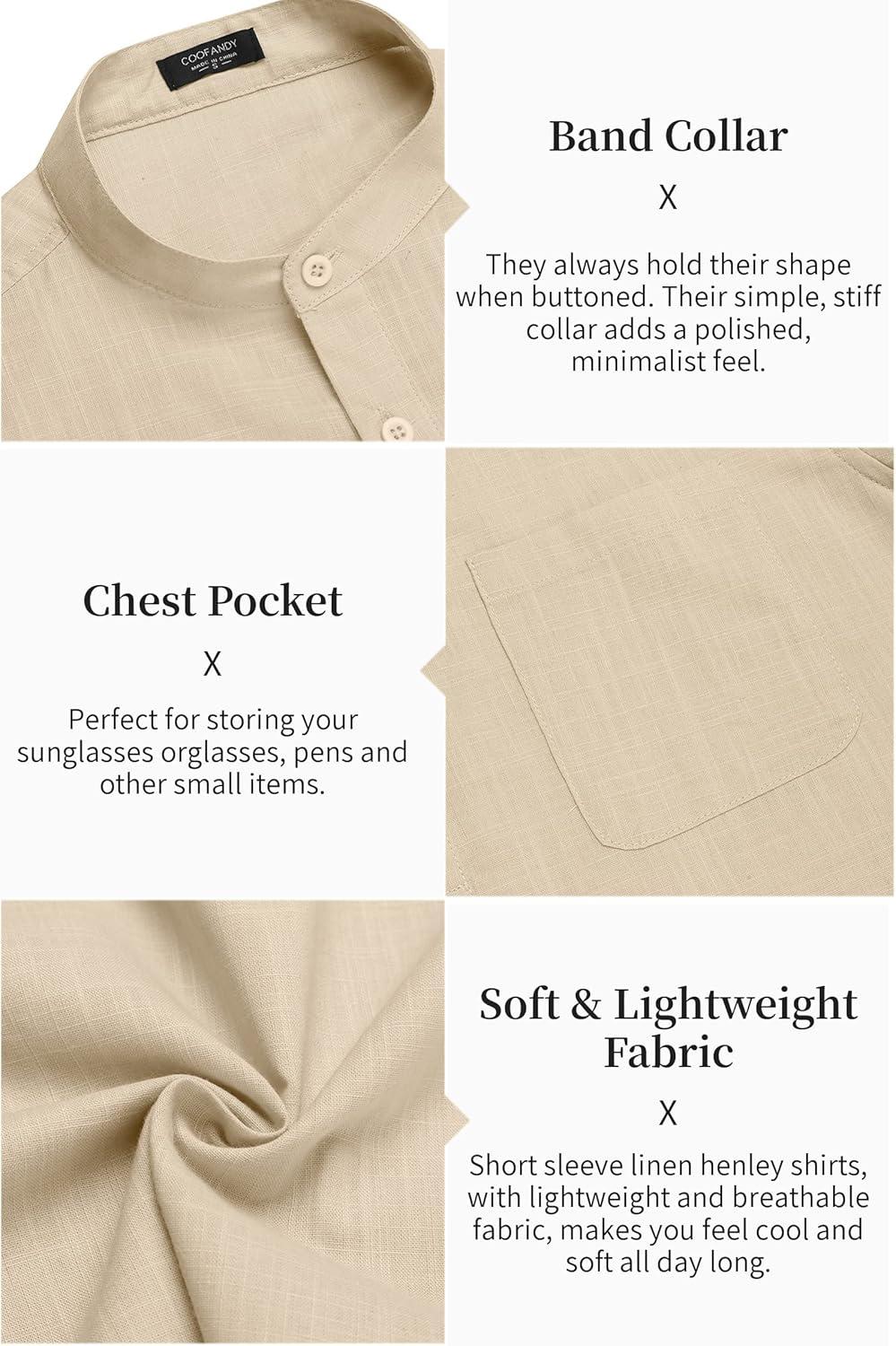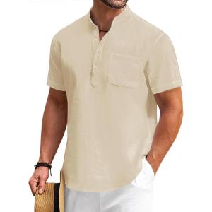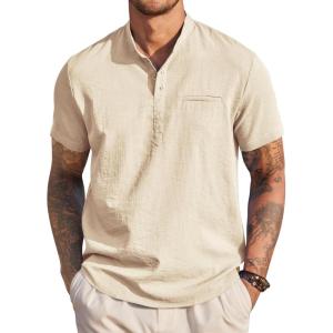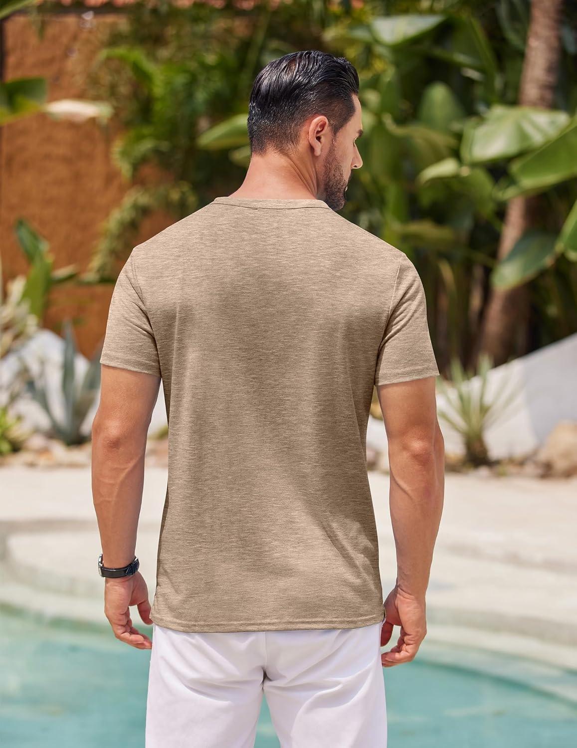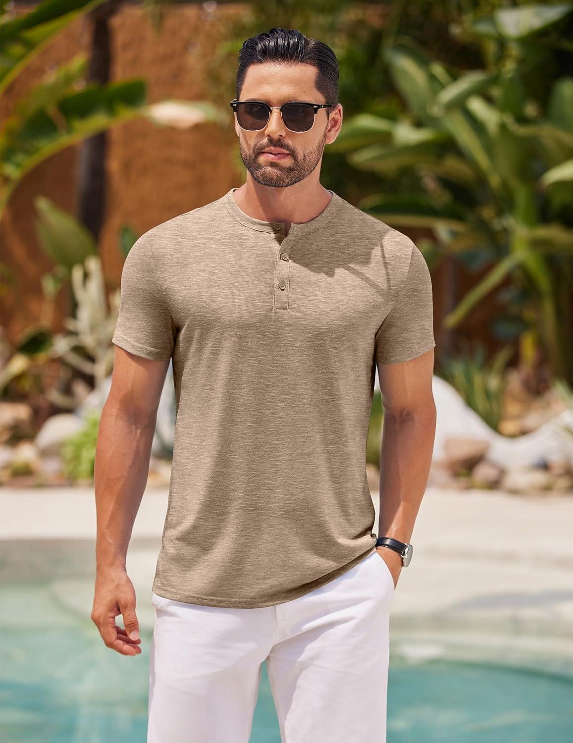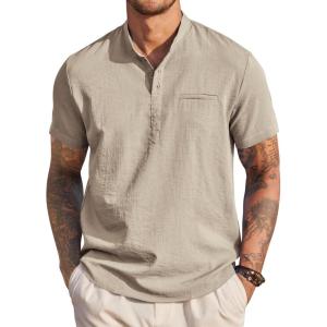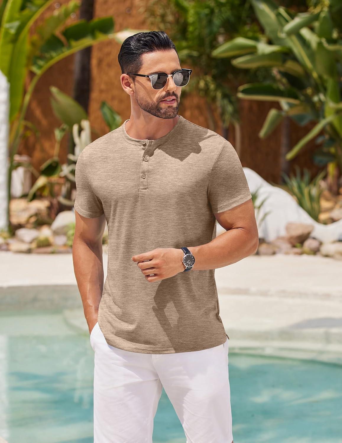 COOFANDY Men Casual Henley Tee Shirt Short Sleeve Band Collar Summer Beach Textured T-Shirt(Khaki)