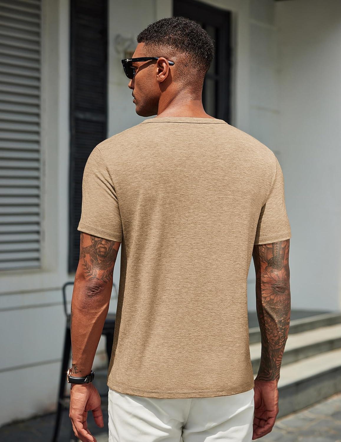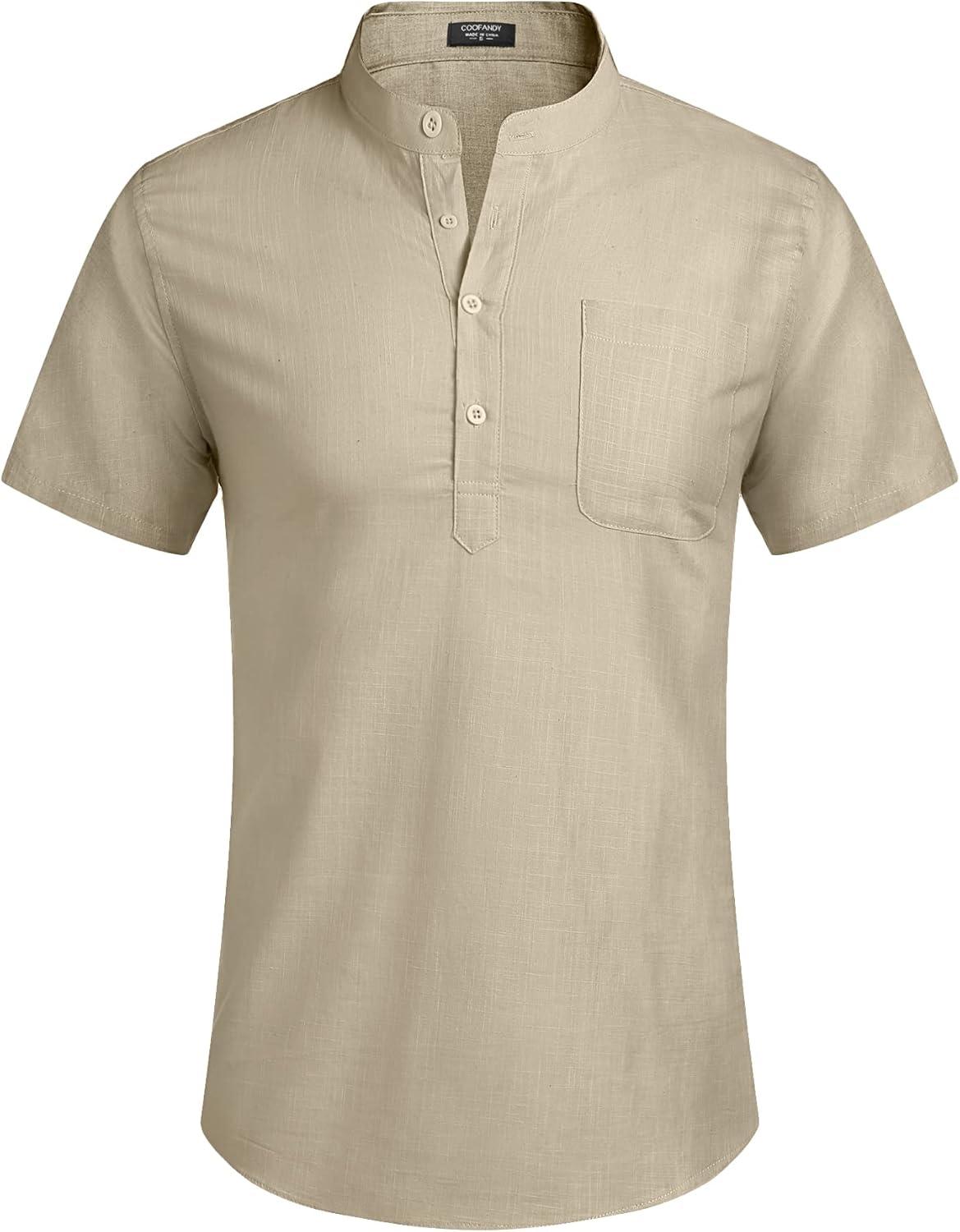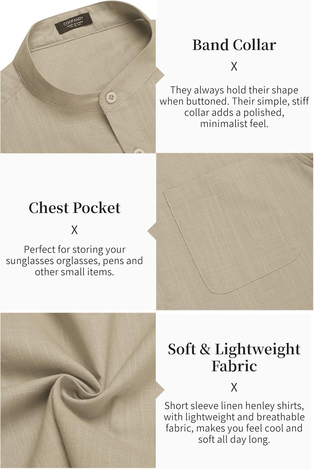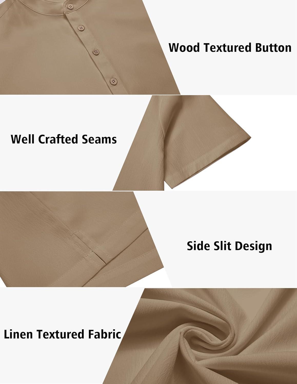 COOFANDY Men Casual Henley Tee Shirt Short Sleeve Band Collar Summer Beach Textured T-Shirt(Khaki)