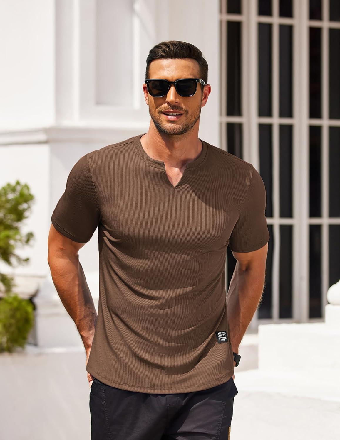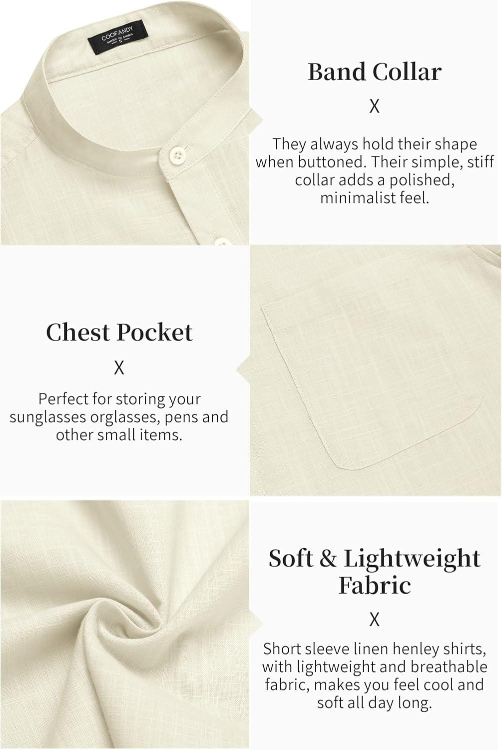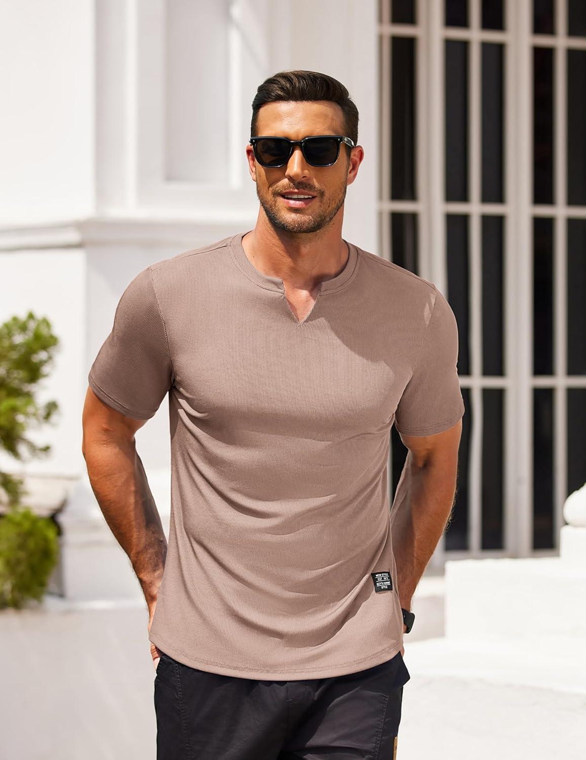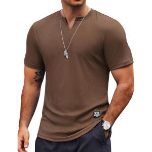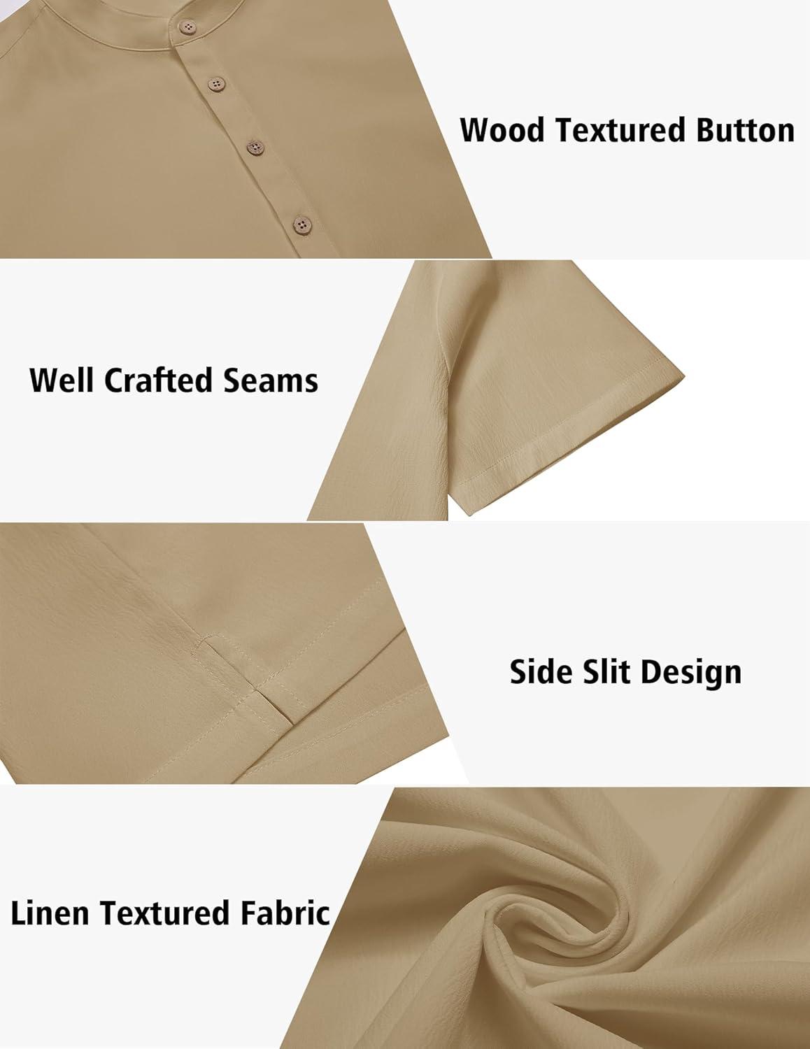 COOFANDY Men Casual Henley Tee Shirt Short Sleeve Band Collar Summer Beach Textured T-Shirt(Khaki)
