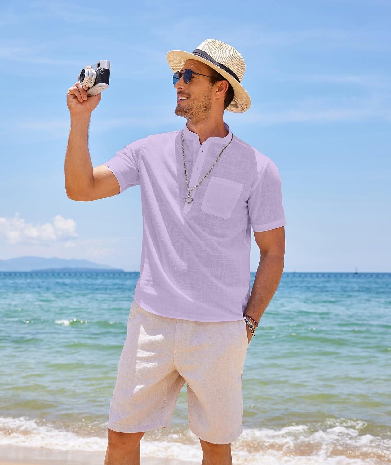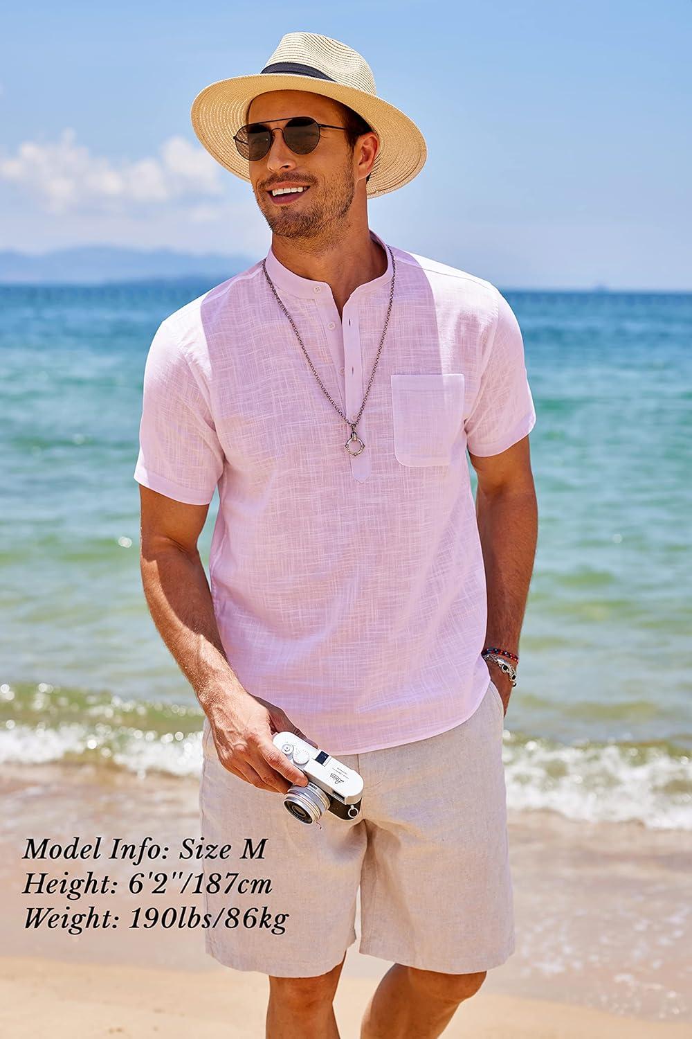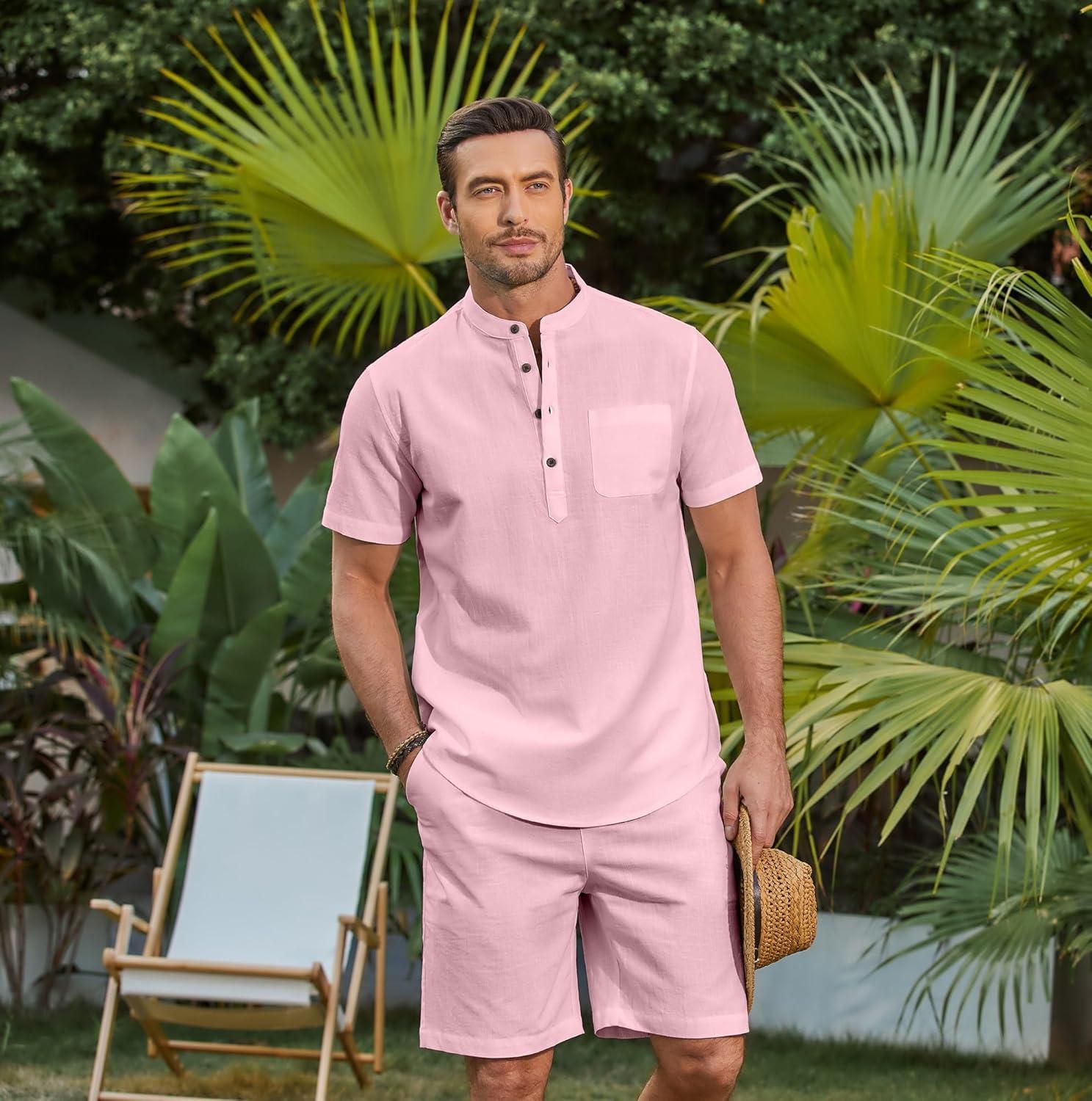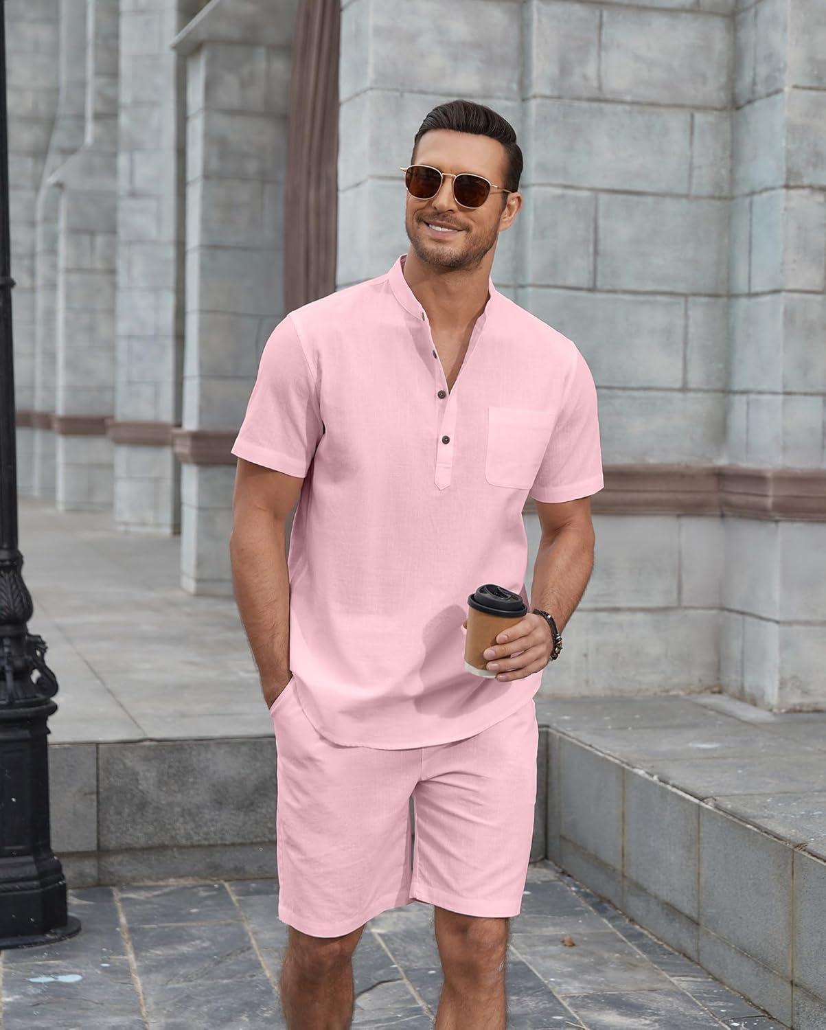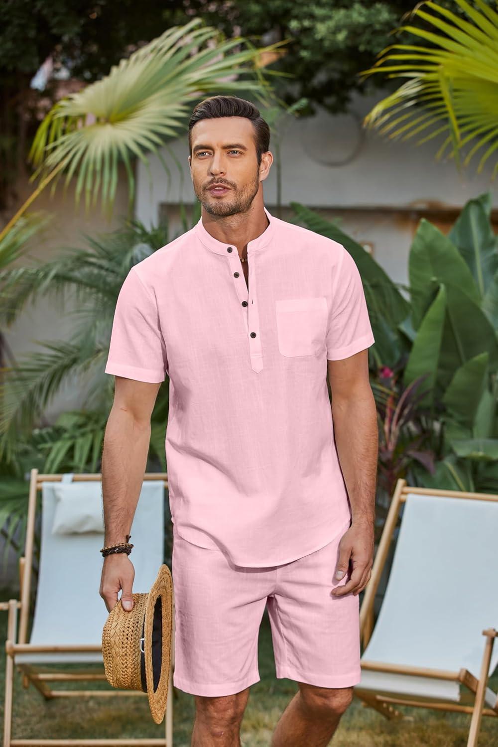 COOFANDY Men’s 2 Piece Cotton Linen Sets Summer Beach Outfits Casual Short Sleeve Henley Shirts and Vacation Shorts(Light Pink)