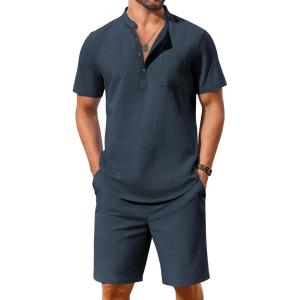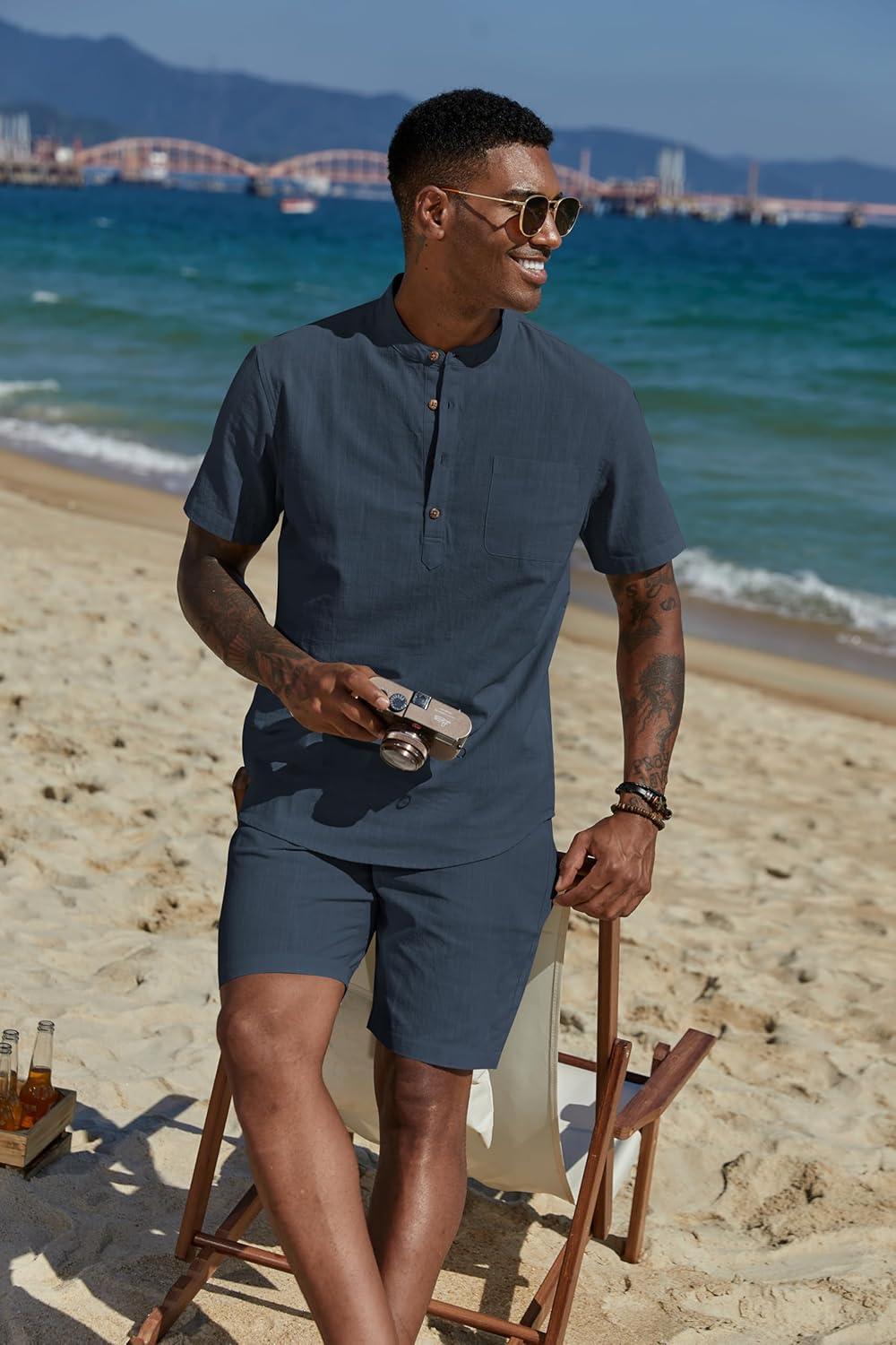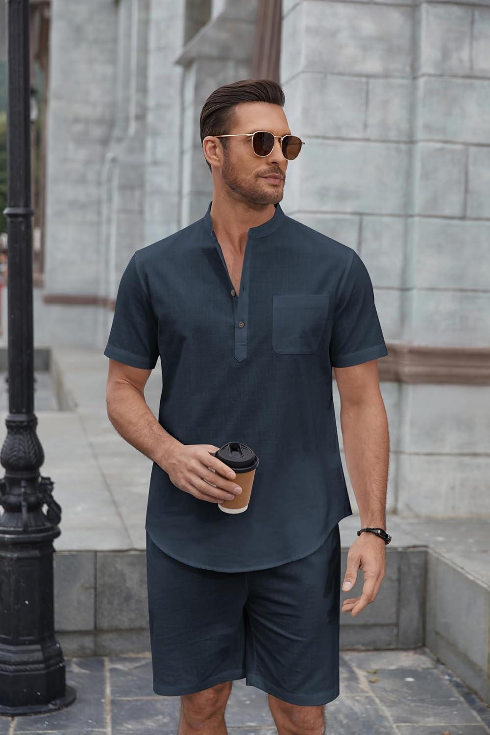 COOFANDY Men’s 2 Piece Cotton Linen Sets Summer Beach Outfits Casual Short Sleeve Henley Shirts and Vacation Shorts(Navy Blue)
