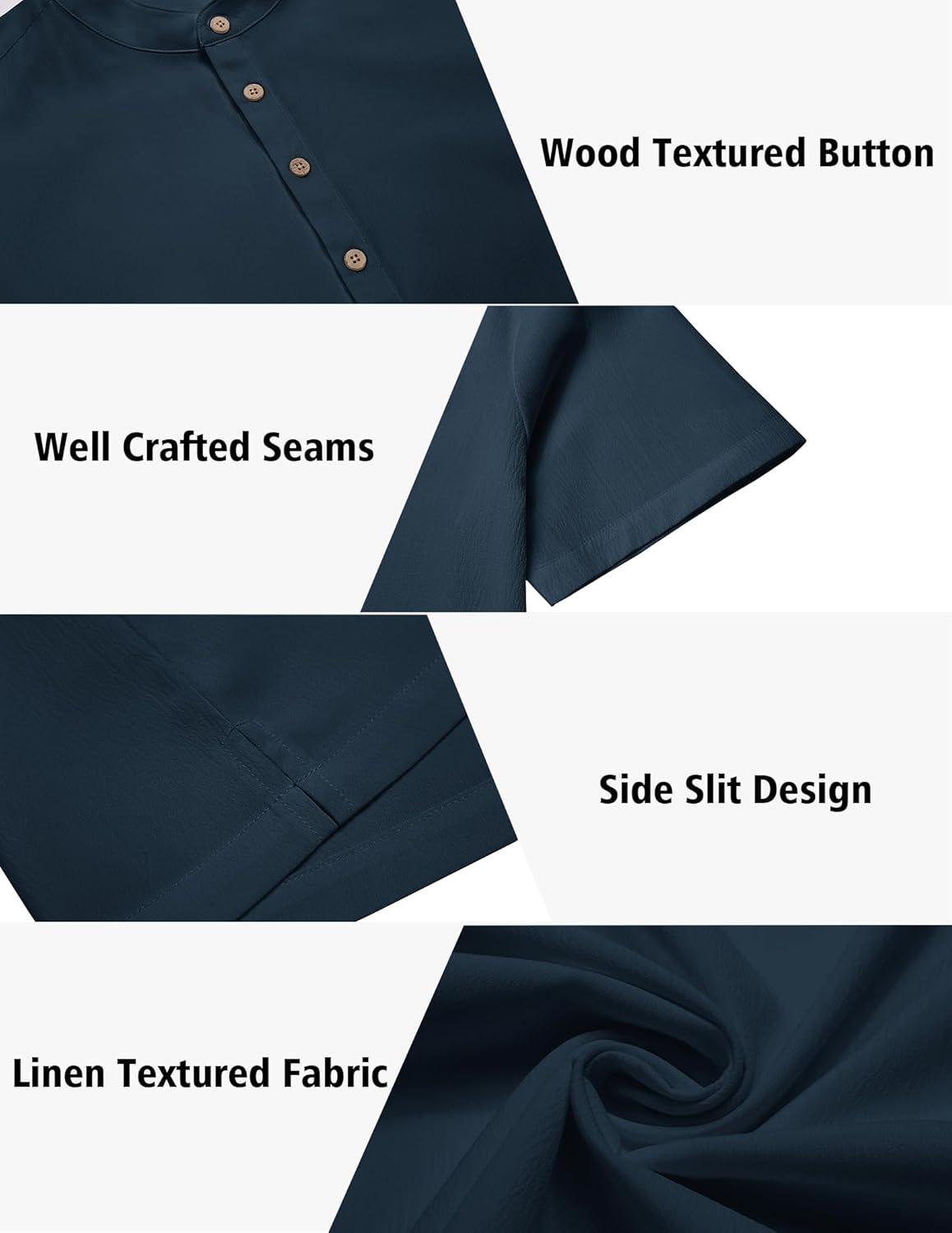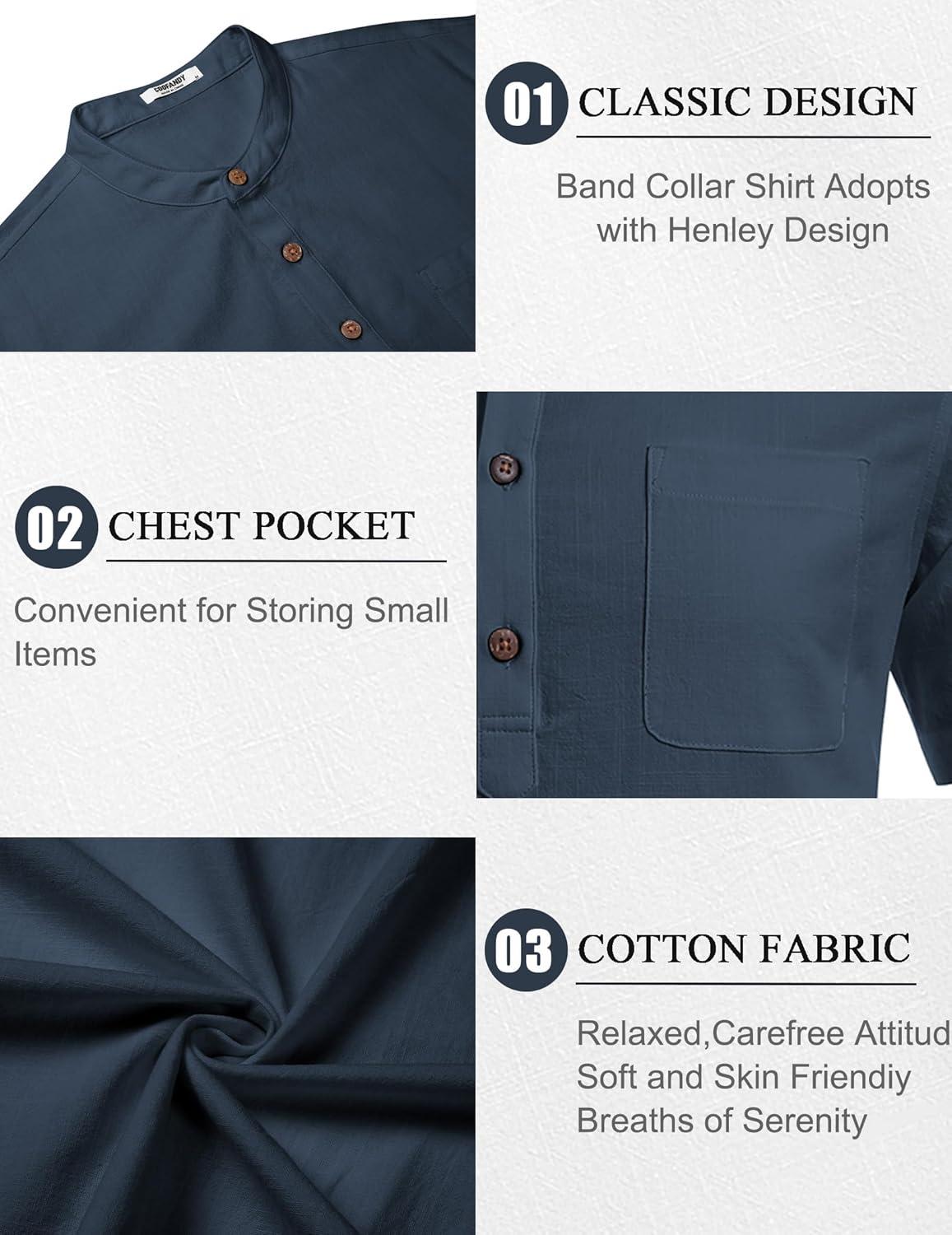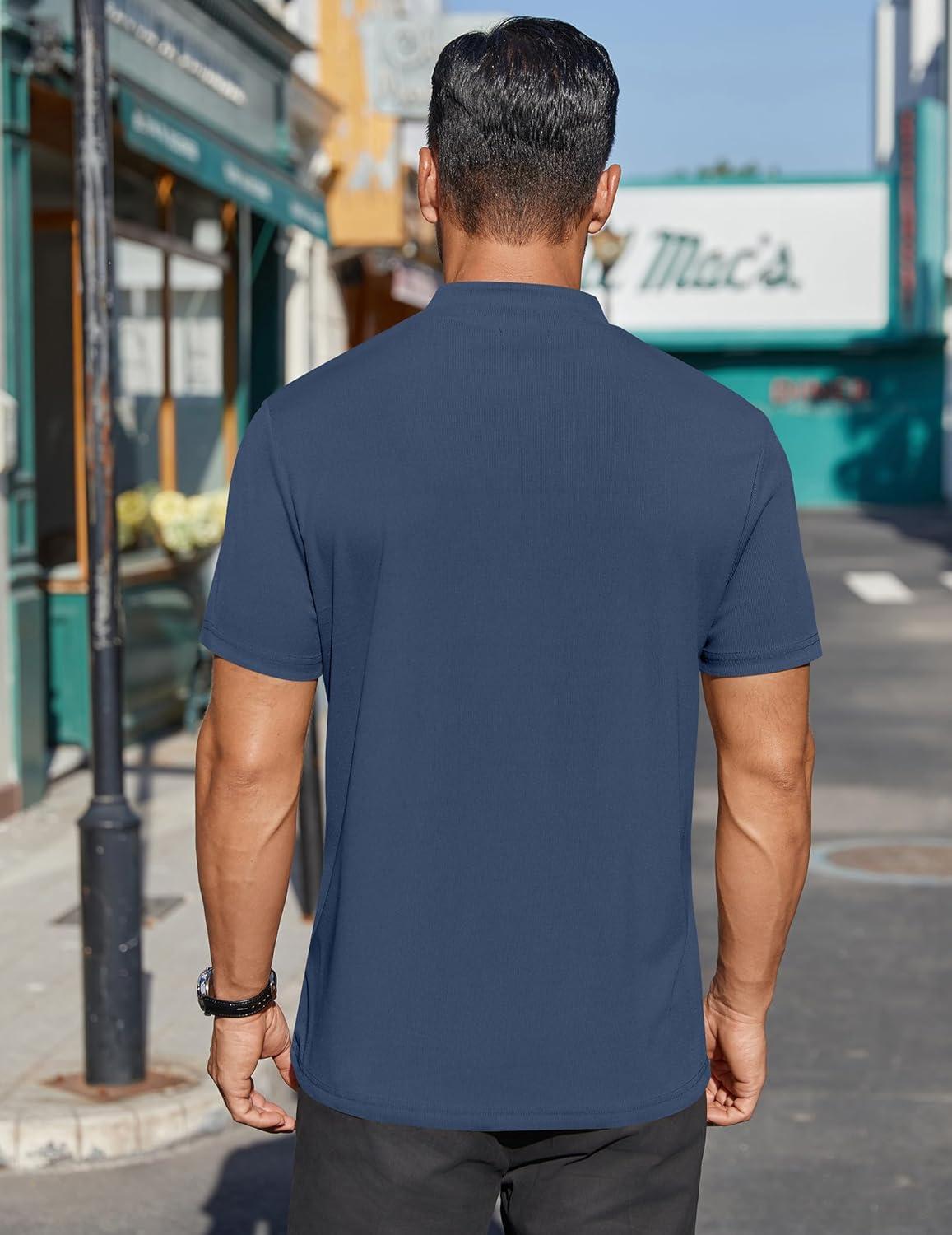 COOFANDY Men Casual Henley Tee Shirt Short Sleeve Band Collar Summer Beach Textured T-Shirt(Navy Blue)